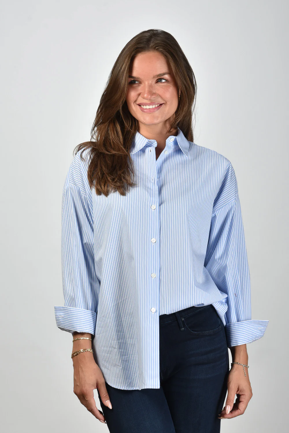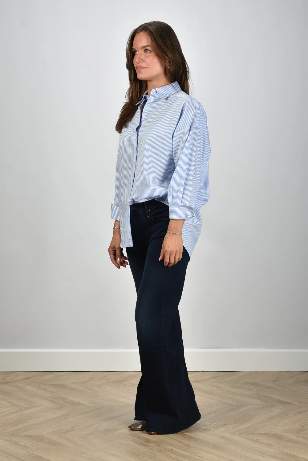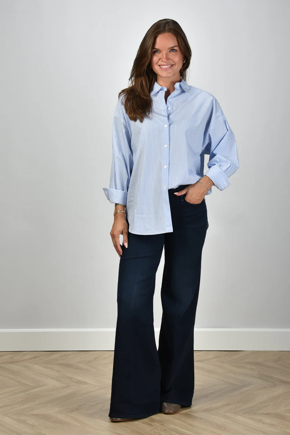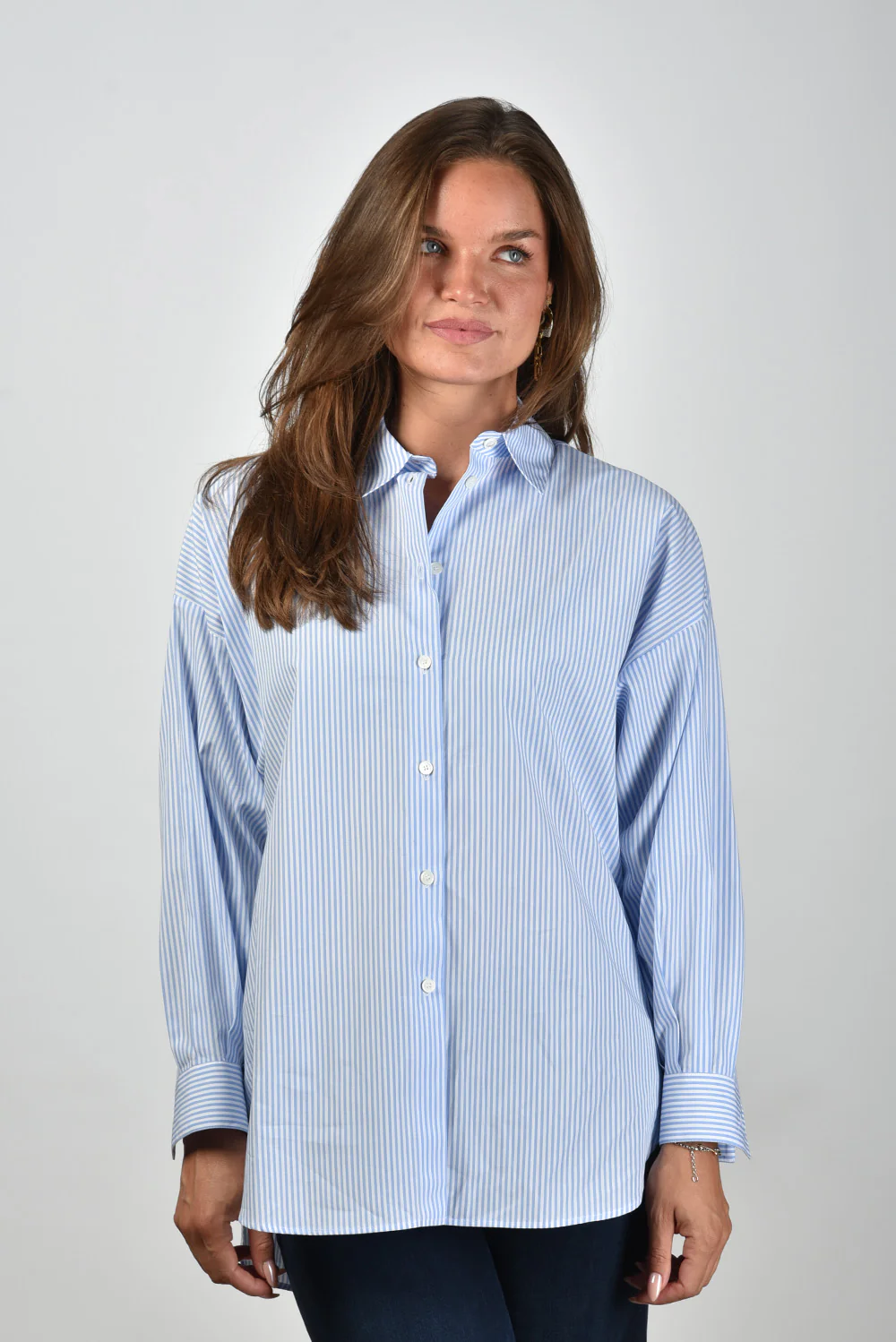 De blouse Giorgia van Academia heeft een fris, zomers karakter door de lichtblauwe kleur met witte strepen. De stof van 100% katoen voelt soepel en luchtig aan, prettig bij warmer weer. Het ruimvallende model met lage schouders geeft de blouse een ontspannen silhouet, terwijl de brede manchetten zorgen voor een mooie vorm aan de mouw. Draag de Giorgia bijvoorbeeld op de Mother jeans Twister Sneak voor een verzorgd en nonchalant geheel. Zoals altijd bij Academia zie je het vakmanschap terug in de afwerking en de aandacht voor lijn en pasvorm. De blouse valt normaal op maat, waardoor je eenvoudig je gebruikelijke maat kunt kiezen.