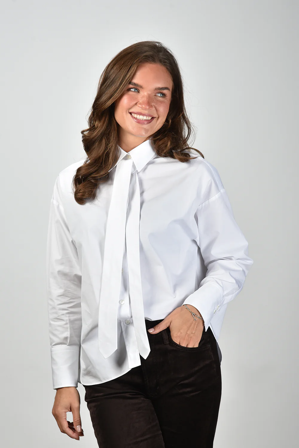 De blouse Marianne van Academia valt op door haar lange, smalle strikband bij de hals. De witte katoenen stof voelt stevig en glad, met een subtiele glans. De blouse heeft een wijdvallende pasvorm met lage schoudernaden die soepel langs het lichaam vallen. De klassieke kraag en knoopsluiting zorgen voor een verzorgde uitstraling die goed aansluit bij denim of een pantalon. Gemaakt van 100 procent katoen, dus prettig luchtig en vormvast. Academia brengt met deze blouse Italiaans vakmanschap in een modern jasje, degelijk, stijlvol en tot in detail afgewerkt. Draag haar bijvoorbeeld met de Golden Goose sneakers Superstar voor een ontspannen maar verzorgde uitstraling. Deze blouse valt normaal op maat, dus kies gerust je gebruikelijke maat.