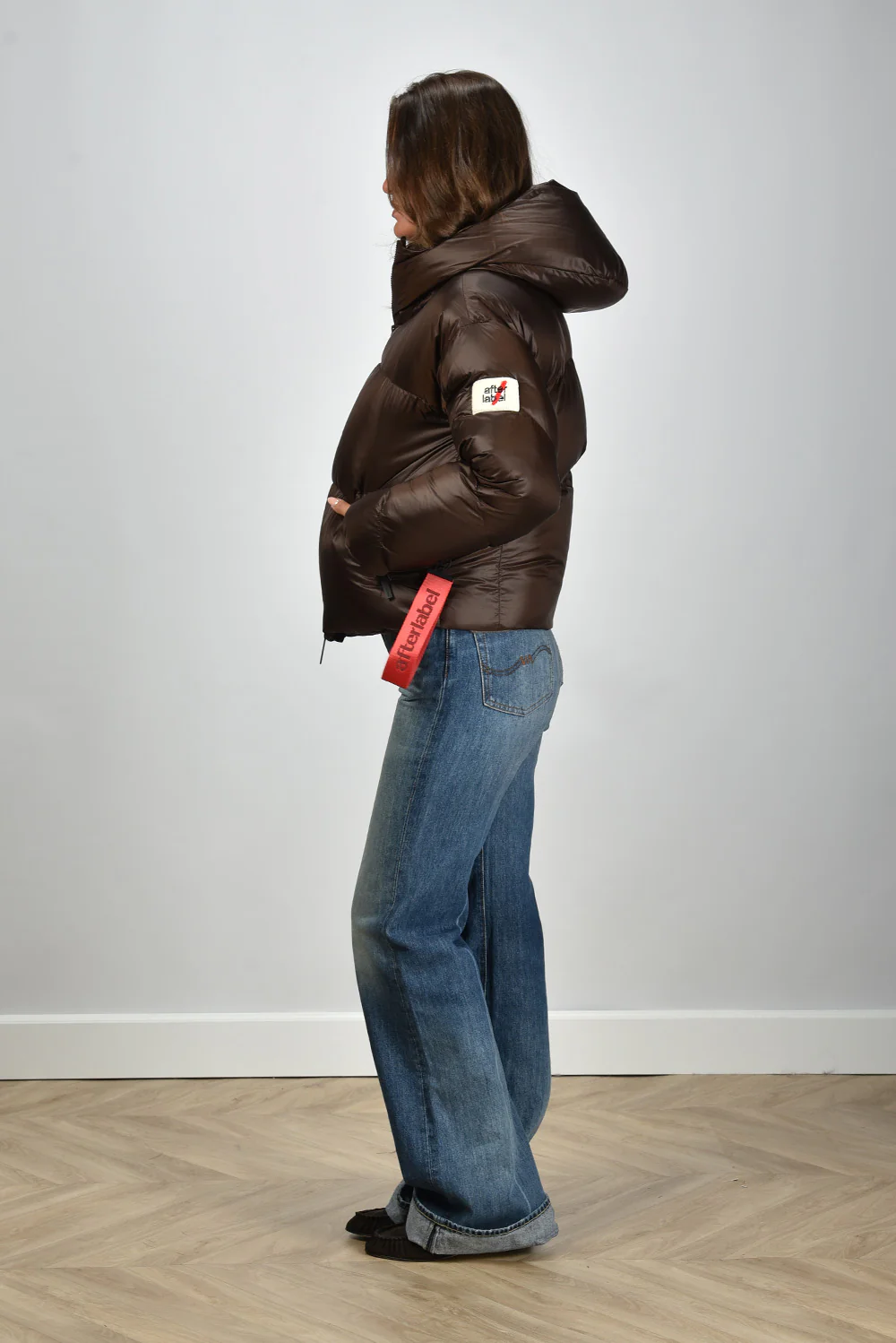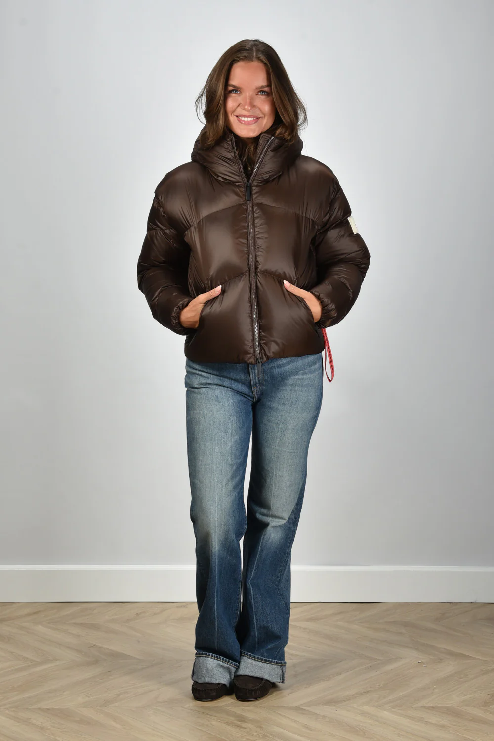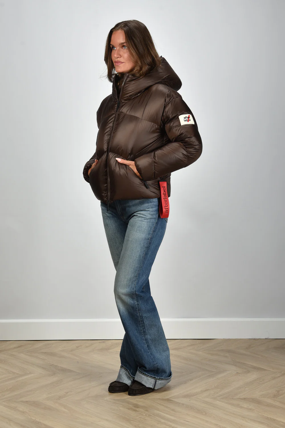 De jas SARAJEVON051 van After Label is een donkerbruine puffer met een subtiele glans en stevige horizontale stiksels. De hoge kraag blijft mooi rechtop staan en geeft het jasje een cleane, technische look. Op de linkermouw valt de herkenbare After Label patch direct op, het symbool van dit Italiaanse label dat graag buiten de lijntjes kleurt. Gemaakt van 100% poliamide, dus licht, sterk en bestand tegen weer en wind. De jas valt normaal op maat en voelt compact maar soepel. Mooi te dragen met de Denimist jeans Dena DSWD330-D261B fenmore blue voor een nonchalante combinatie.