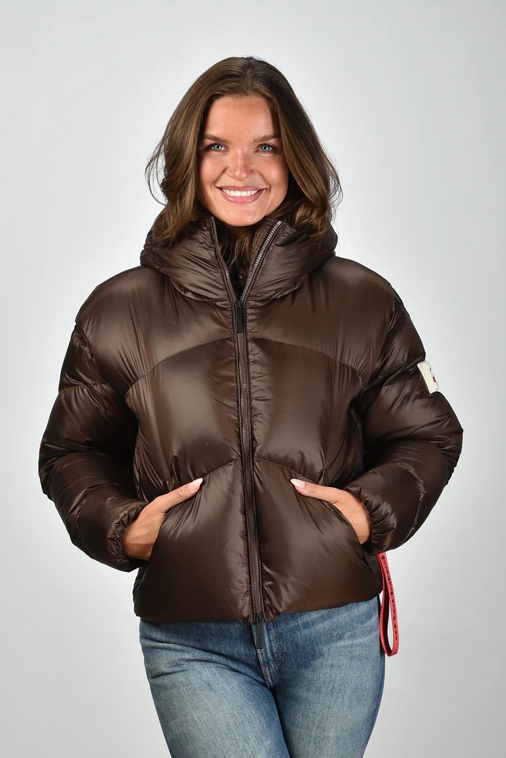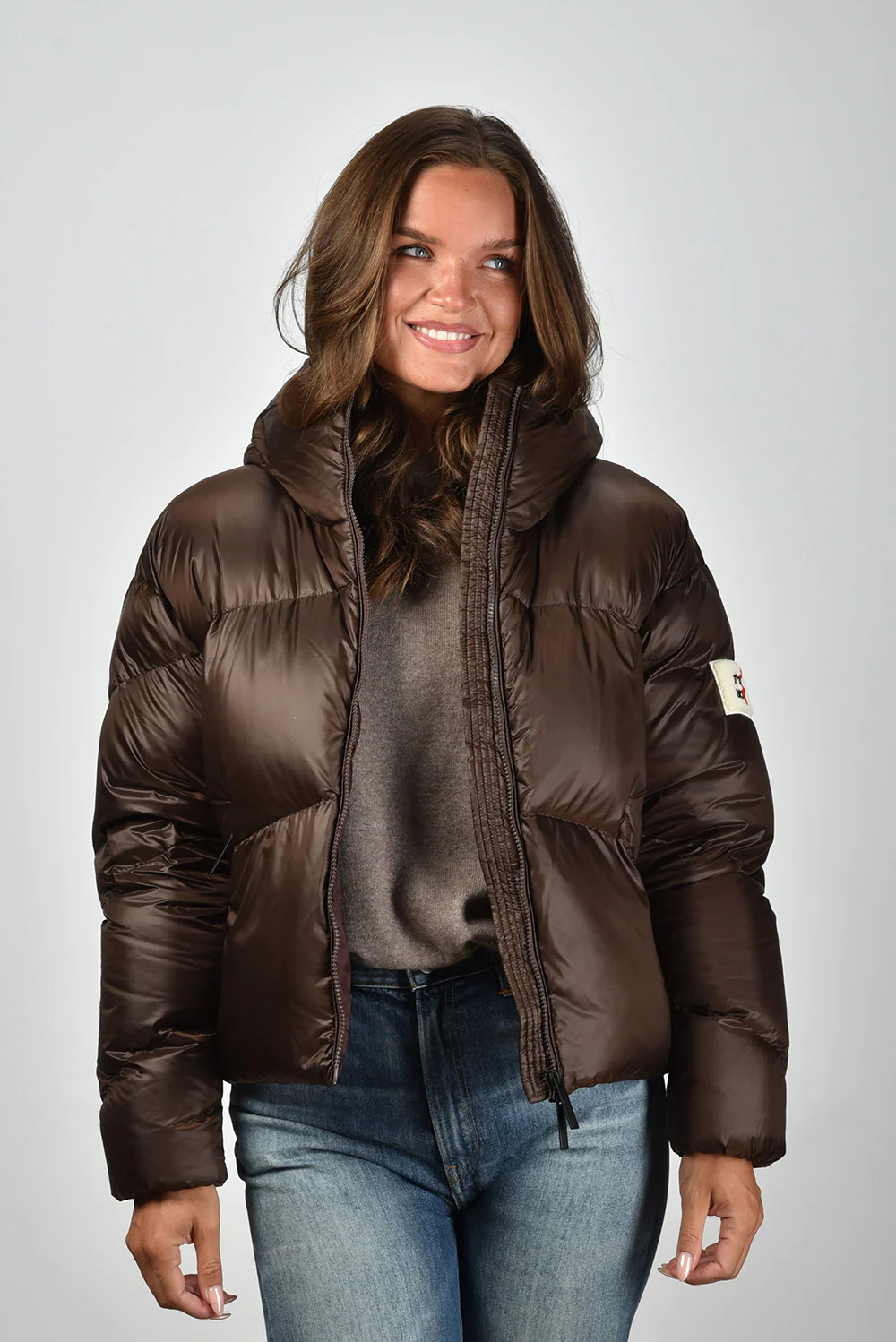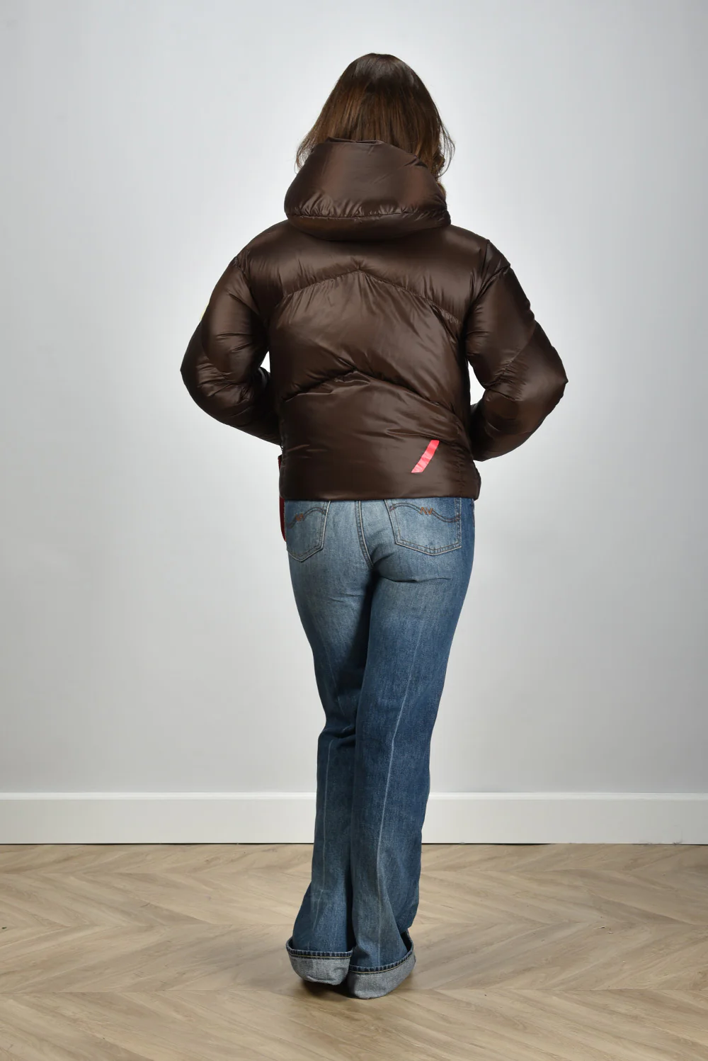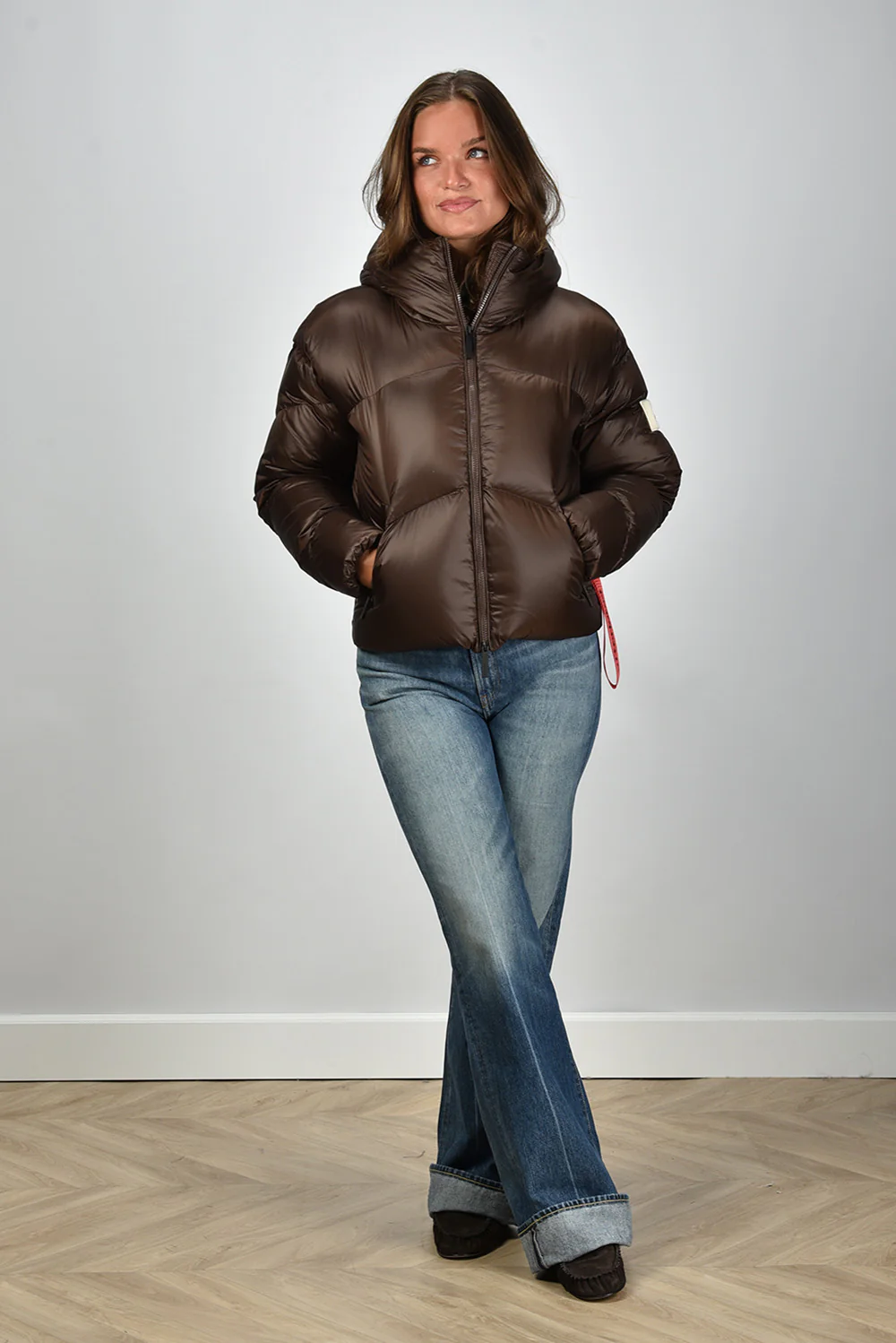 De jas SARAJEVON051 van After Label is een donkerbruine puffer met een subtiele glans en stevige horizontale stiksels. De hoge kraag blijft mooi rechtop staan en geeft het jasje een cleane, technische look. Op de linkermouw valt de herkenbare After Label patch direct op, het symbool van dit Italiaanse label dat graag buiten de lijntjes kleurt. Gemaakt van 100% poliamide, dus licht, sterk en bestand tegen weer en wind. De jas valt normaal op maat en voelt compact maar soepel. Mooi te dragen met de Denimist jeans Dena DSWD330-D261B fenmore blue voor een nonchalante combinatie.