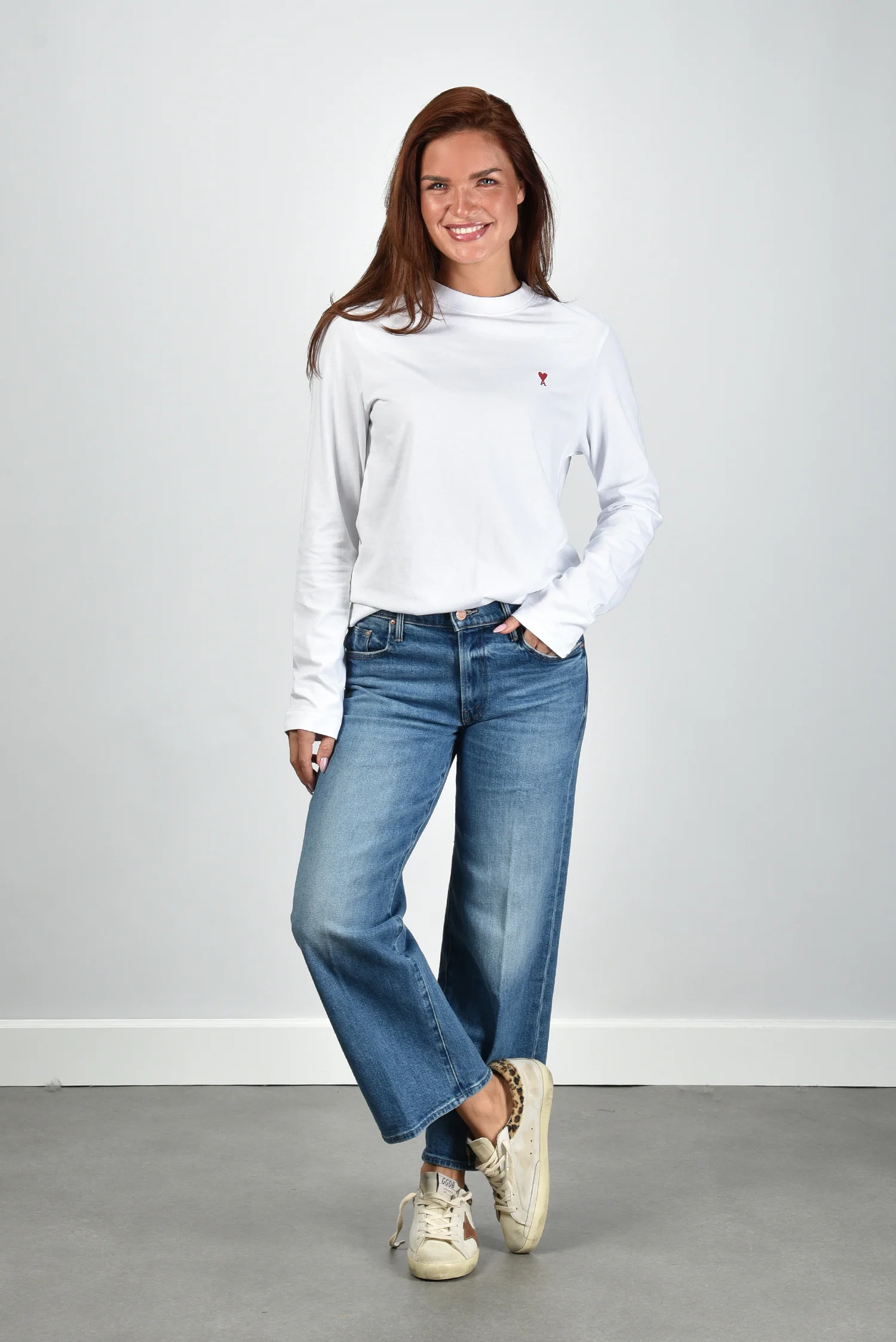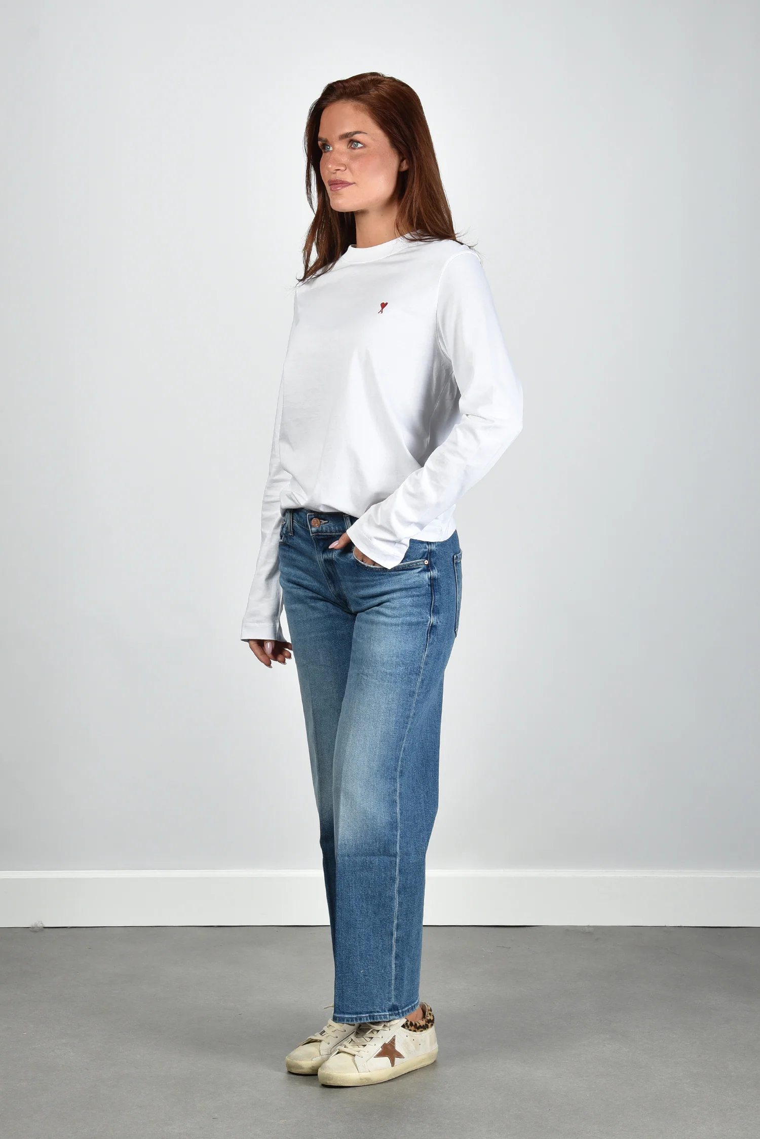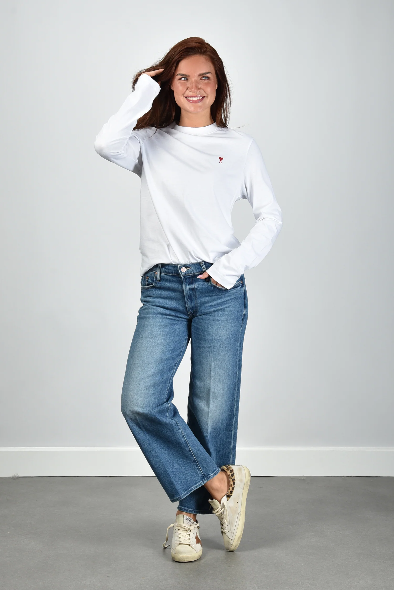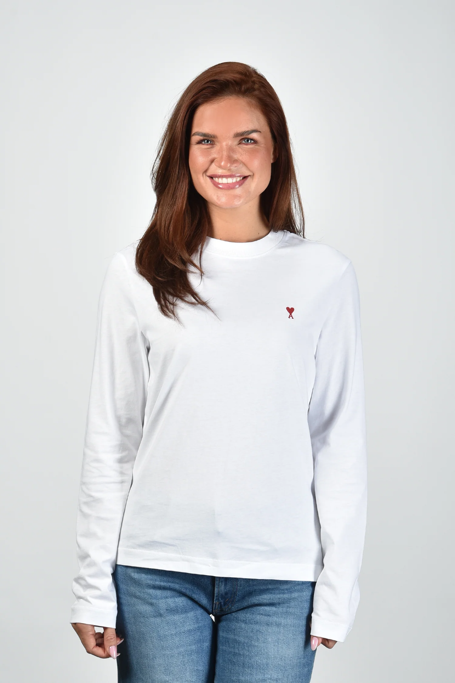 Het t-shirt ADC Ts Rouge van Ami Paris is een helderwitte longsleeve met een ontspannen pasvorm. Op de borst staat subtiel het rode Ami de Coeur-logo, herkenbaar maar nooit nadrukkelijk. De lange mouwen vallen recht zonder boorden, wat het shirt zijn rustige lijn geeft. Gemaakt van 100% katoen dat stevig maar zacht aanvoelt op de huid. Dit item is een klassieker van Ami Paris, bekend om de pure eenvoud en Franse nonchalance. Mooi te dragen met de Golden Goose sneakers Superstar GWF00102.F007505.82996 white/platinum/burgundy voor een ontspannen, stijlvolle combinatie.