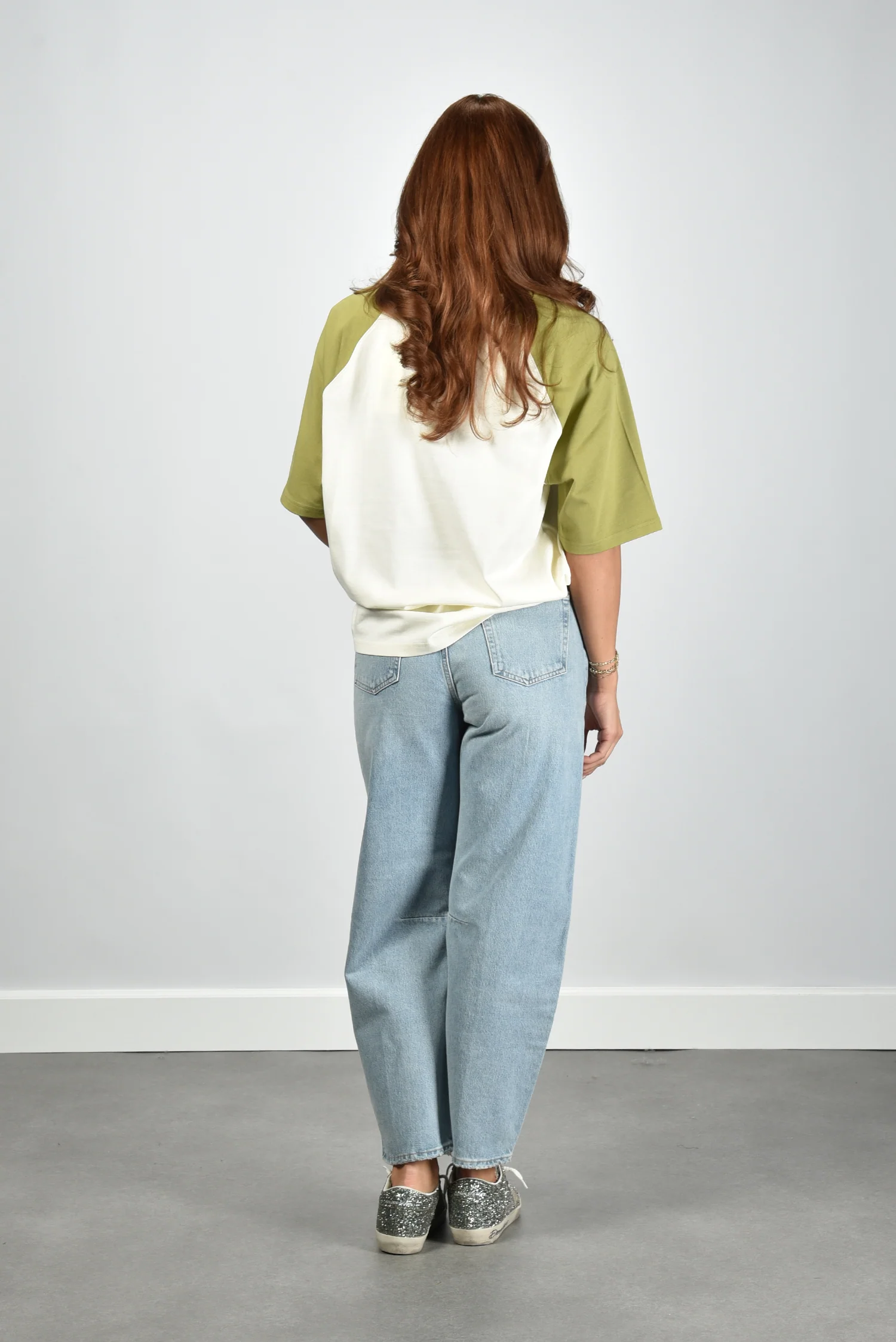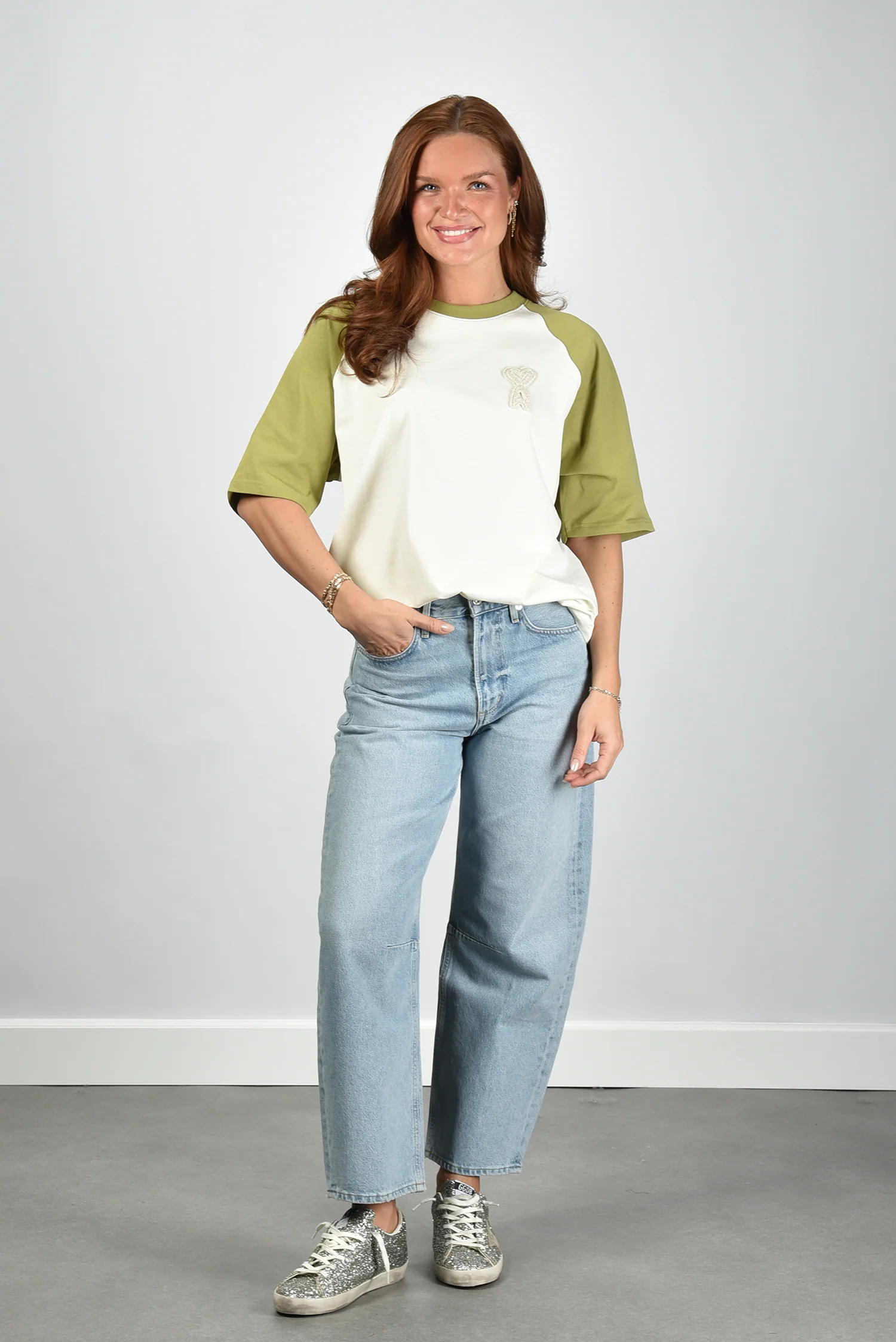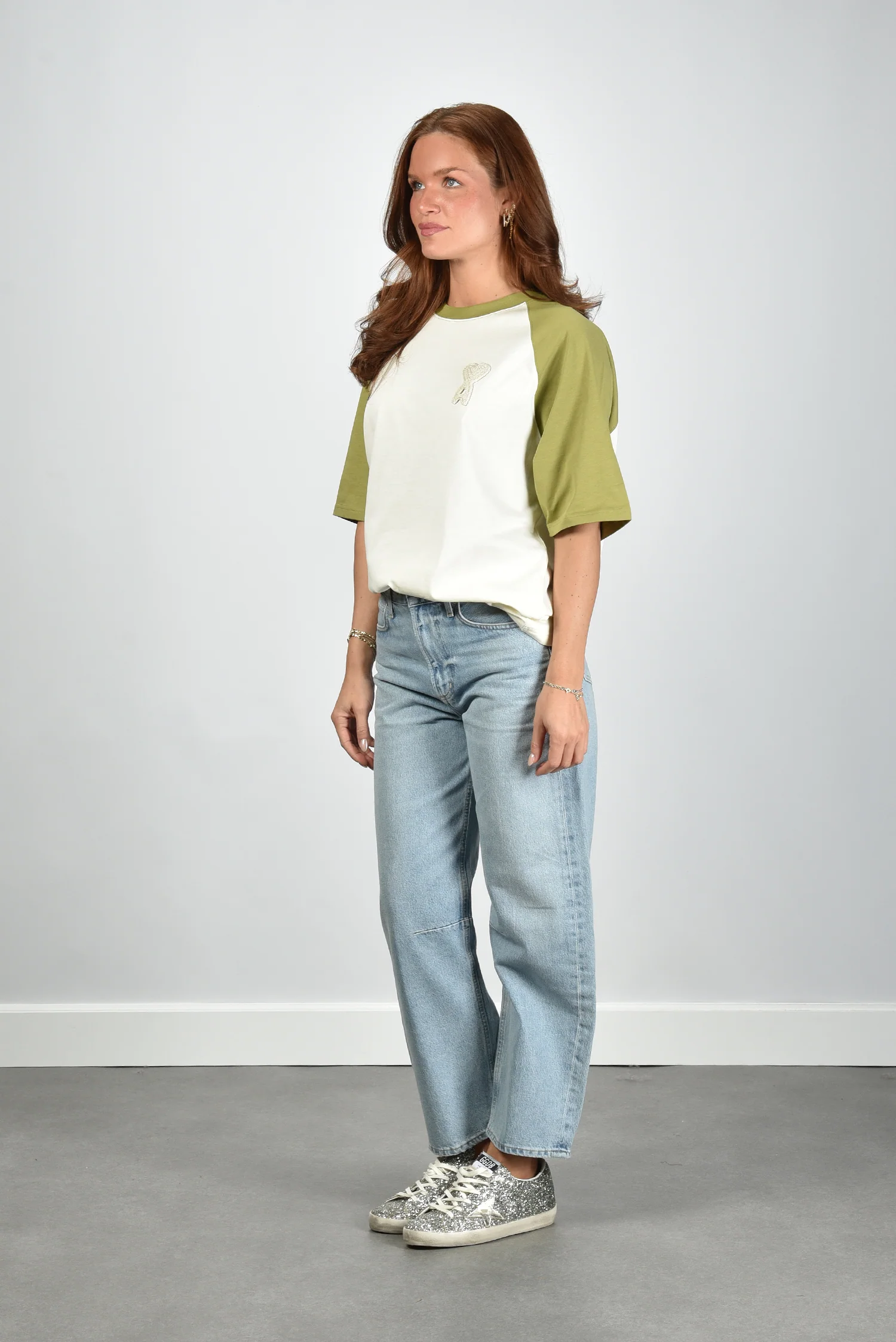 Dit t-shirt creme van Ami Paris heeft contrasterende raglanmouwen in olijfgroen die het geheel meteen een frisse structuur geven. Het witte lijfvlak valt soepel en laat het subtiele, geborduurde detail op de borst goed uitkomen. De ronde hals is uitgevoerd in dezelfde groentint, waardoor de lijnen mooi doorlopen. Het model valt losjes en draagt licht door het gebruik van 100 procent katoen. Volgens het merk valt dit t-shirt normaal op maat, dus je eigen maat werkt hier vaak het best. Ami Paris staat bekend om helder ontwerp en zorgvuldige afwerking, en dat zie je terug in dit eenvoudige maar sterke basisitem.