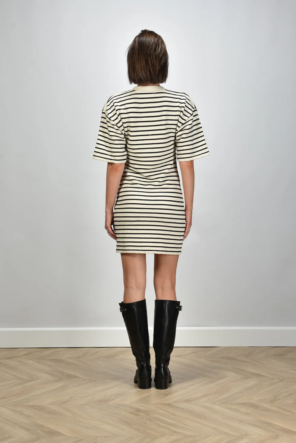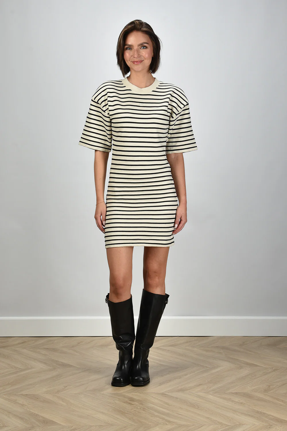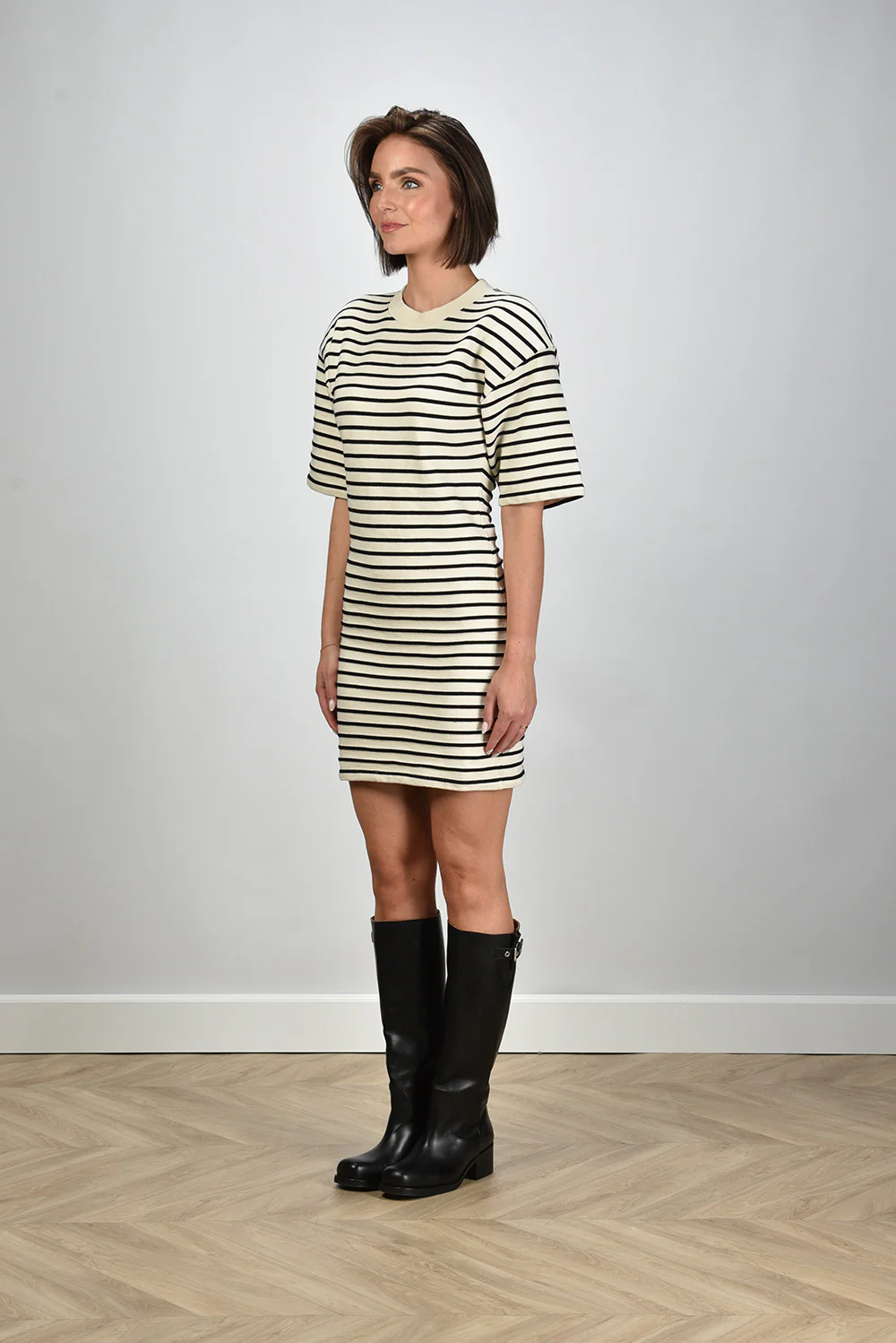 Dit is de jurk Mona in zwart van Anine Bing. De horizontale strepen op de lichte ondergrond zorgen meteen voor een duidelijke tekening. De schoudervulling geeft de bovenkant een uitgesproken vorm, terwijl de wijdere mouwen soepel om de arm vallen. De lengte valt boven de knie en de normale pasvorm draagt prettig om het lichaam. Het katoen met een vleug polyester houdt de stof luchtig en stevig tegelijk. Anine Bing staat bekend om haar sterke oog voor silhouet en dat zie je hier goed terug.