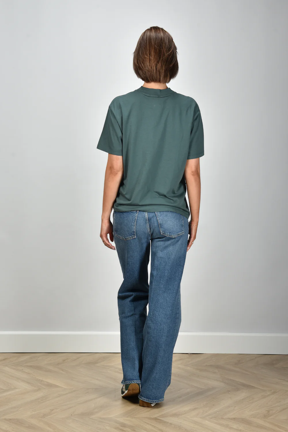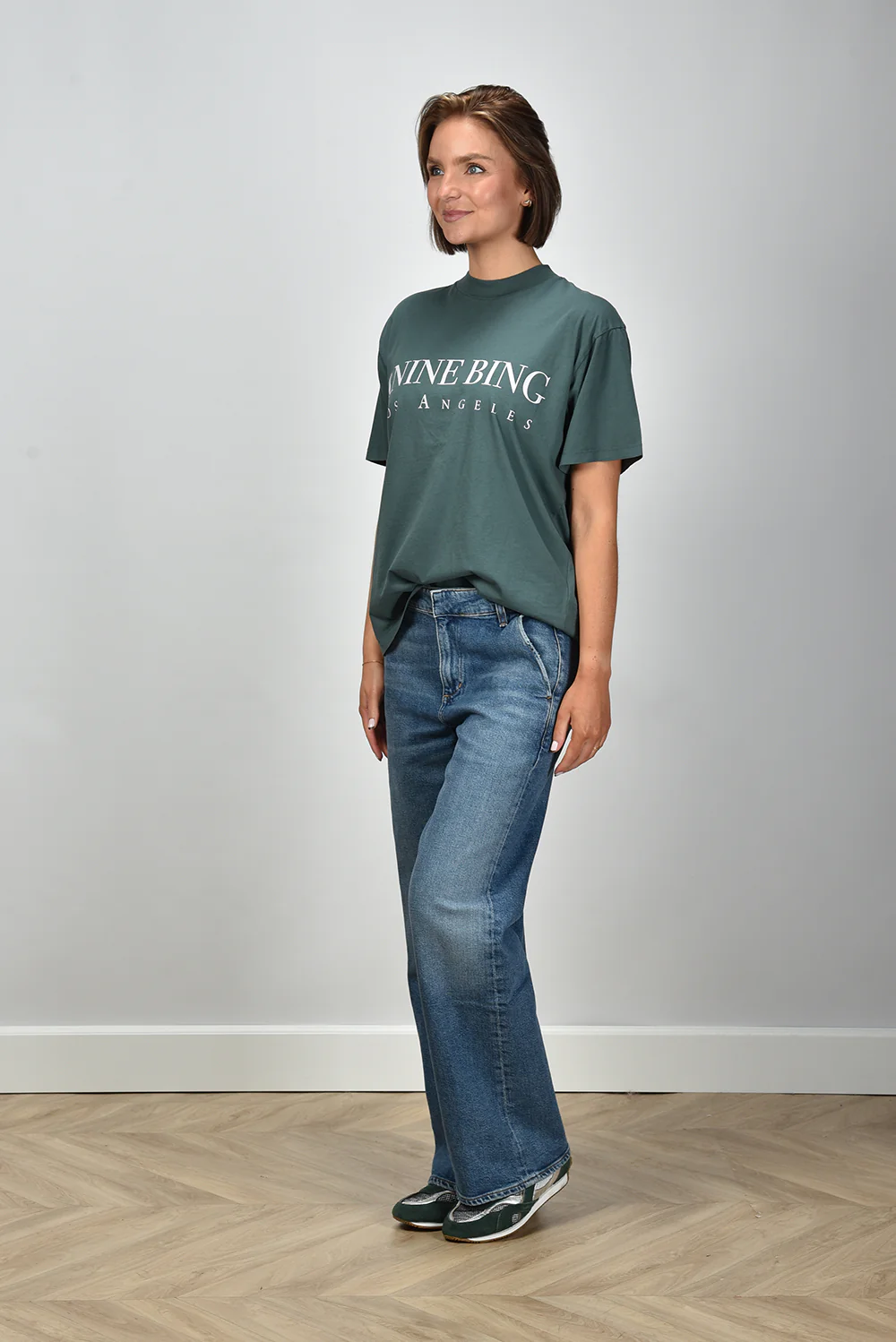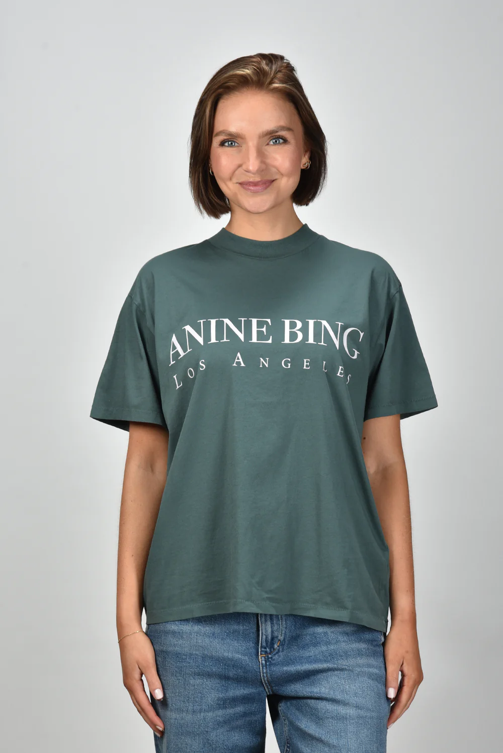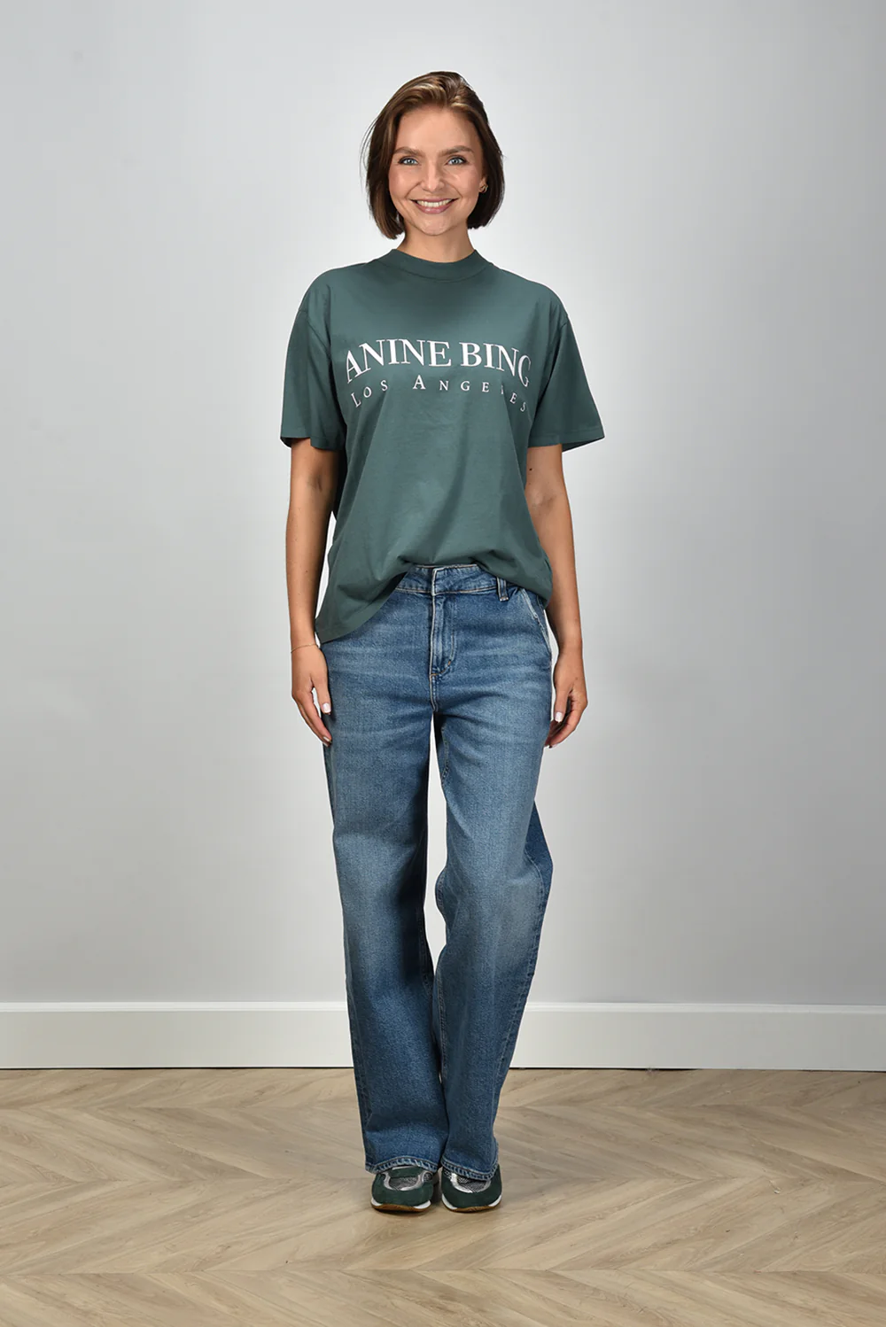 Het t-shirt Ashton Los Angeles van Anine Bing heeft die herkenbare, relaxte uitstraling waar het merk om bekendstaat. De donkergroene kleur geeft het shirt diepte en laat de witte boogvormige tekst extra opvallen. De rechte mouwen vallen net boven de elleboog en zorgen voor een nonchalante vorm. Gemaakt van 100% katoen voelt het zacht en stevig tegelijk. Dankzij de normale pasvorm zit het comfortabel en valt het mooi recht langs het lichaam. Draag het met een jeans of combineer het met de Diadora sneakers Equipe Revenge Italia Used green trekking voor een stoere, uitgebalanceerde look.