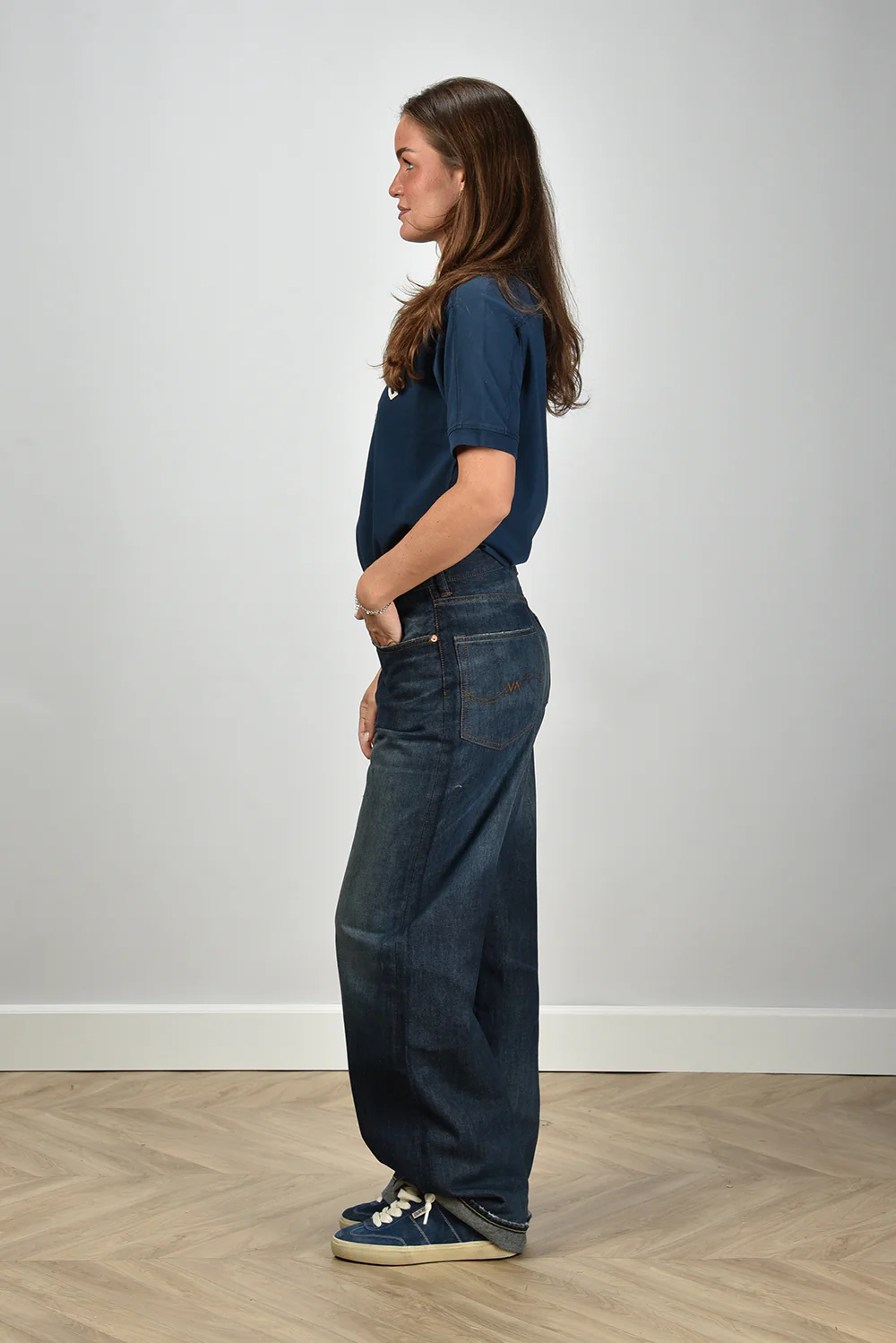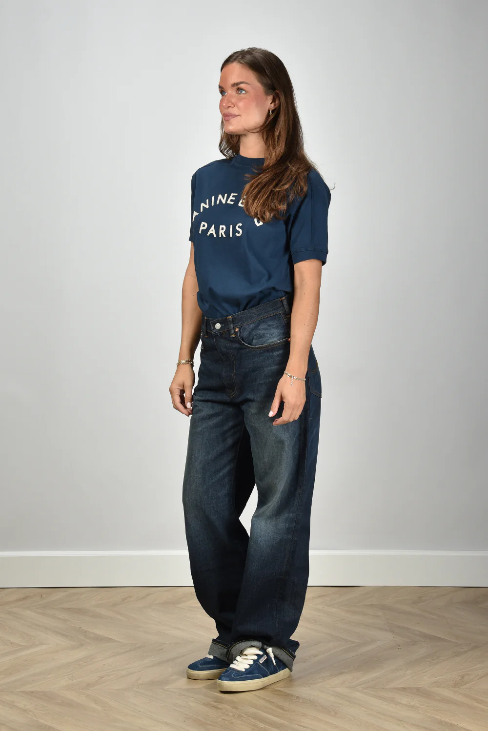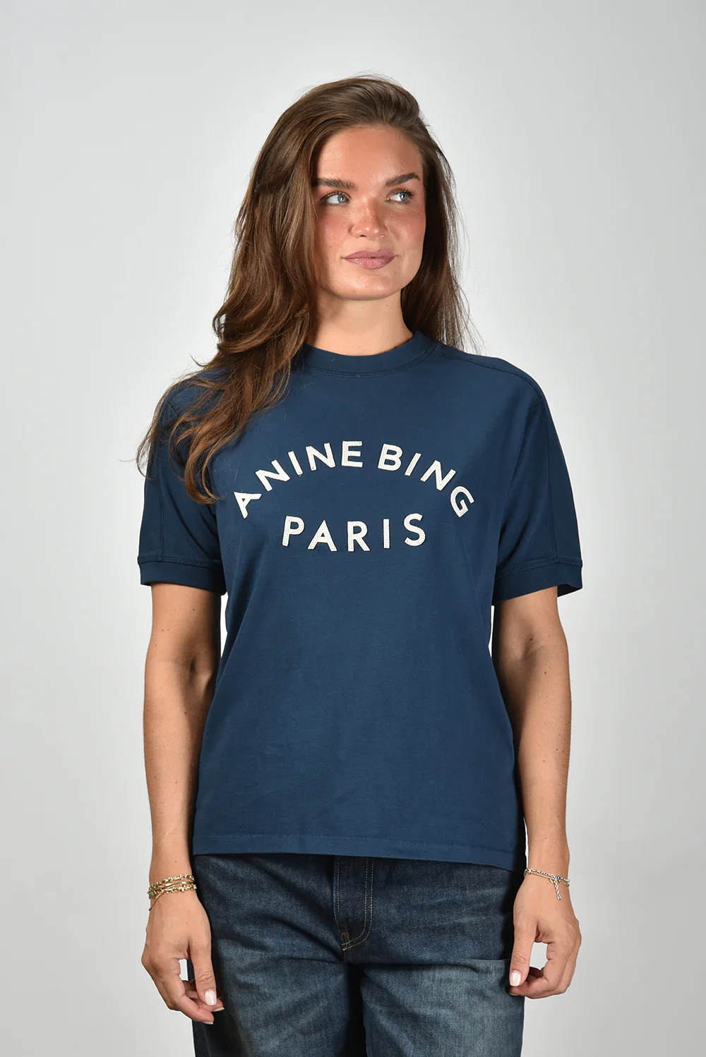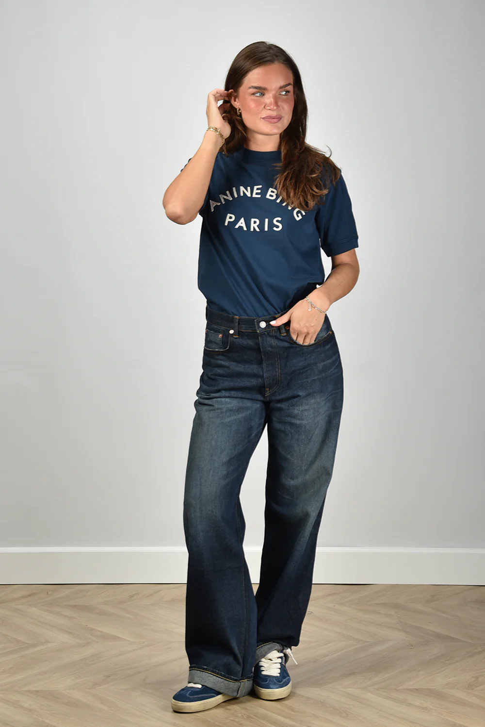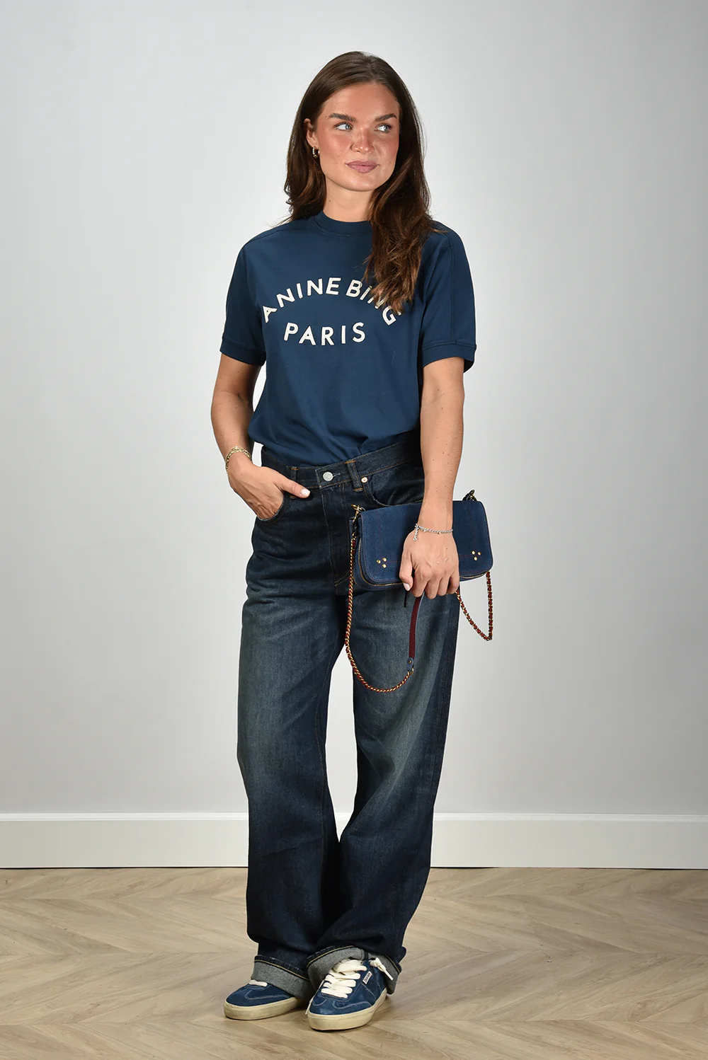 Het t-shirt Jaylin Paris van Anine Bing is zo’n item dat direct past bij een sterke, relaxte stijl. De donkerblauwe basis contrasteert mooi met de witte boogvormige print op de borst, waardoor de look een duidelijke maar eenvoudige uitstraling houdt. De rechte fit valt normaal op maat en de iets opgerolde mouwtjes geven het shirt een nonchalante touch. Gemaakt van 100% katoen, voelt het stevig en prettig aan op de huid. Draag dit t-shirt op de Denimist jeans Teri voor een oprechte, stoere combinatie zoals je die in Los Angeles zou tegenkomen.