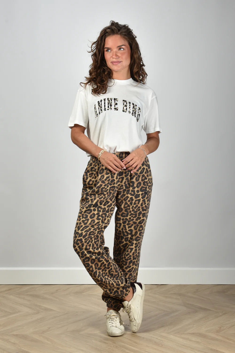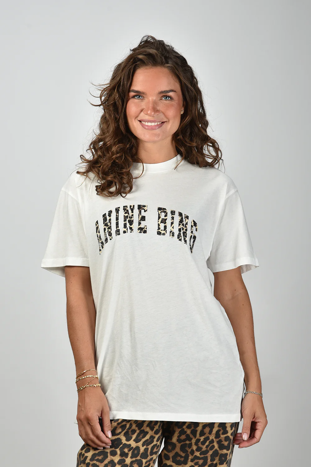 Het t-shirt Walker Leopard van Anine Bing heeft een nonchalante snit waar alles om draait. De gebogen ANINE BING-letters op de borst springen eruit met hun luipaardprint, wat het basic witte shirt een stoerdere rand geeft. De oversized pasvorm en de wijde mouwen vallen ruim en luchtig, gemaakt van 100% katoen dat prettig aanvoelt. In een lichte ivorytint is het een sterk item dat snel opvalt zonder hard te roepen. Combineer het met het Anine Bing jack Flynn Leopard voor een gecoördineerde look met karakter.