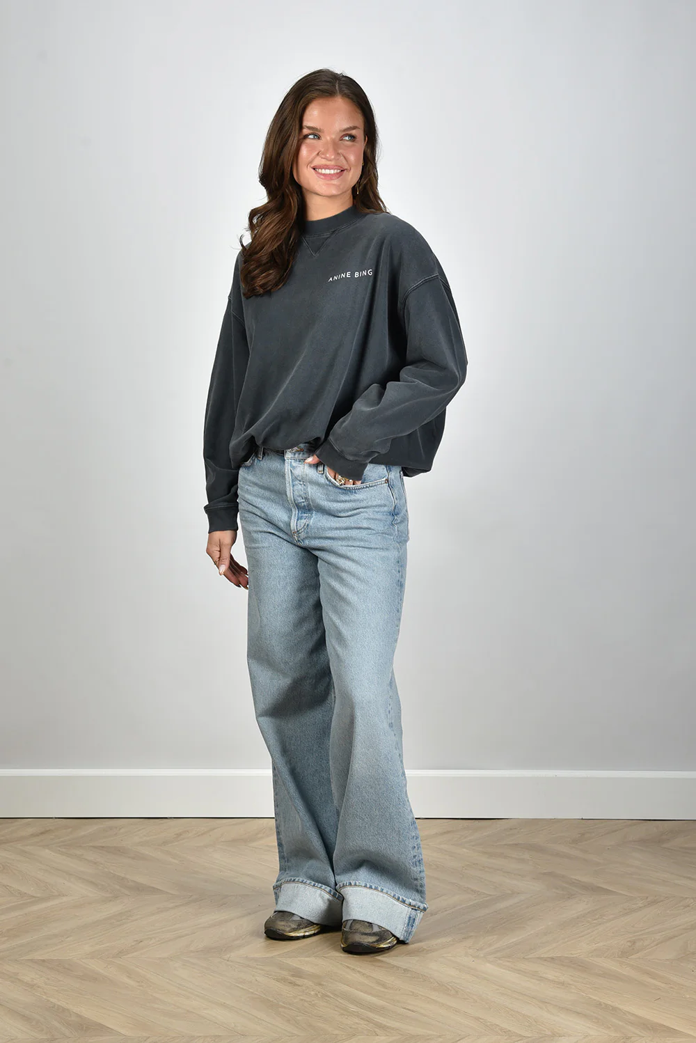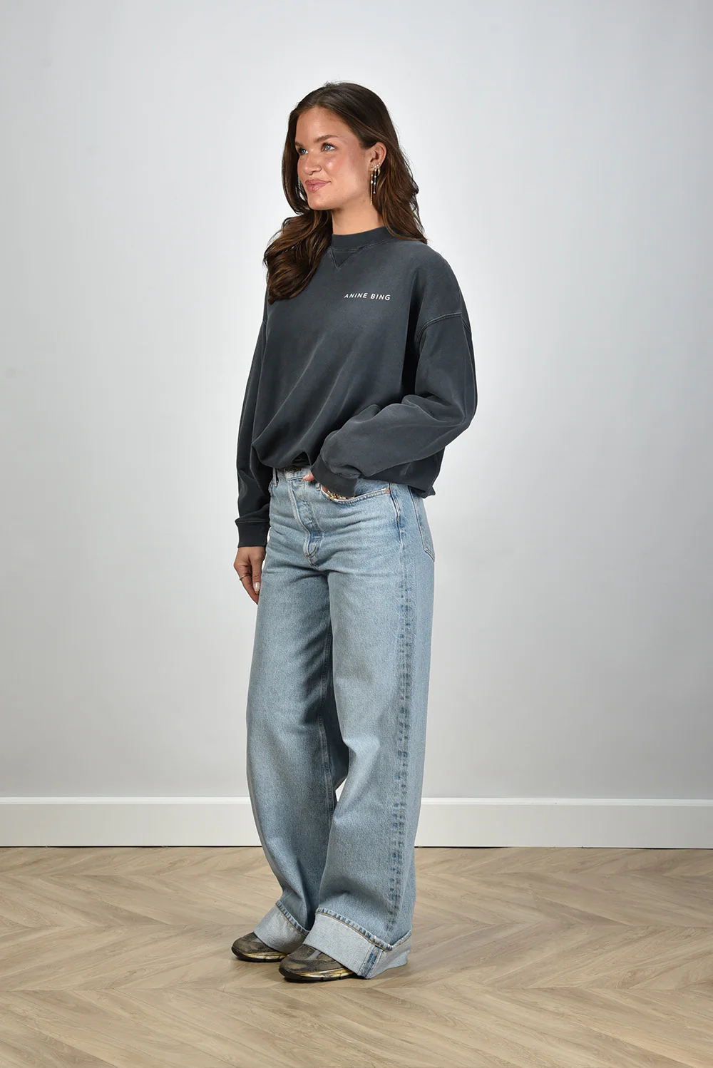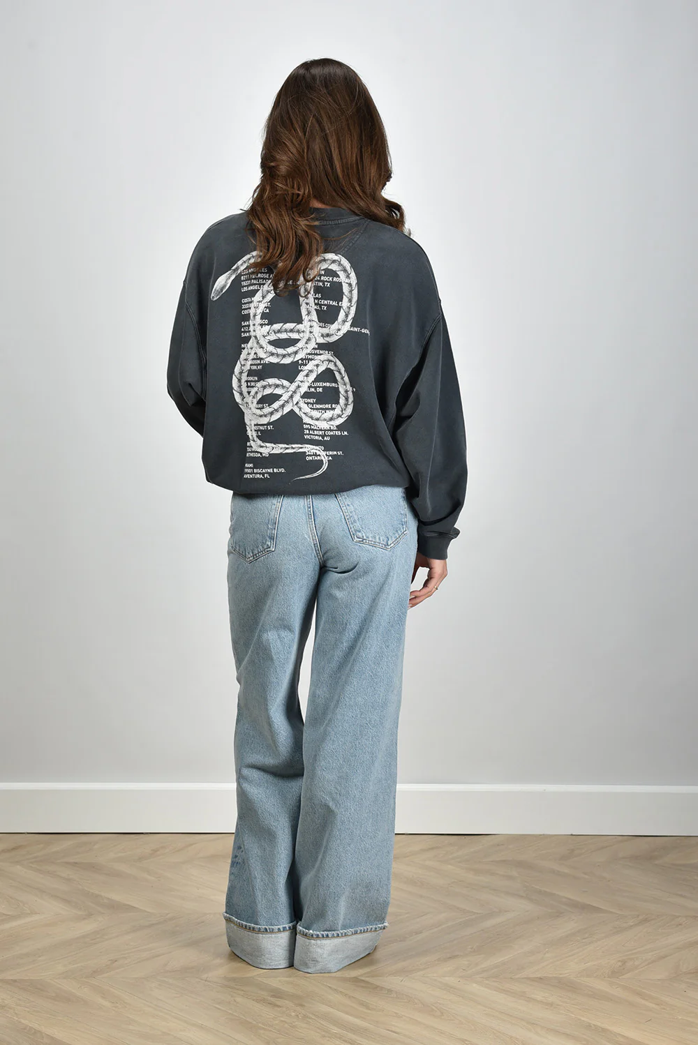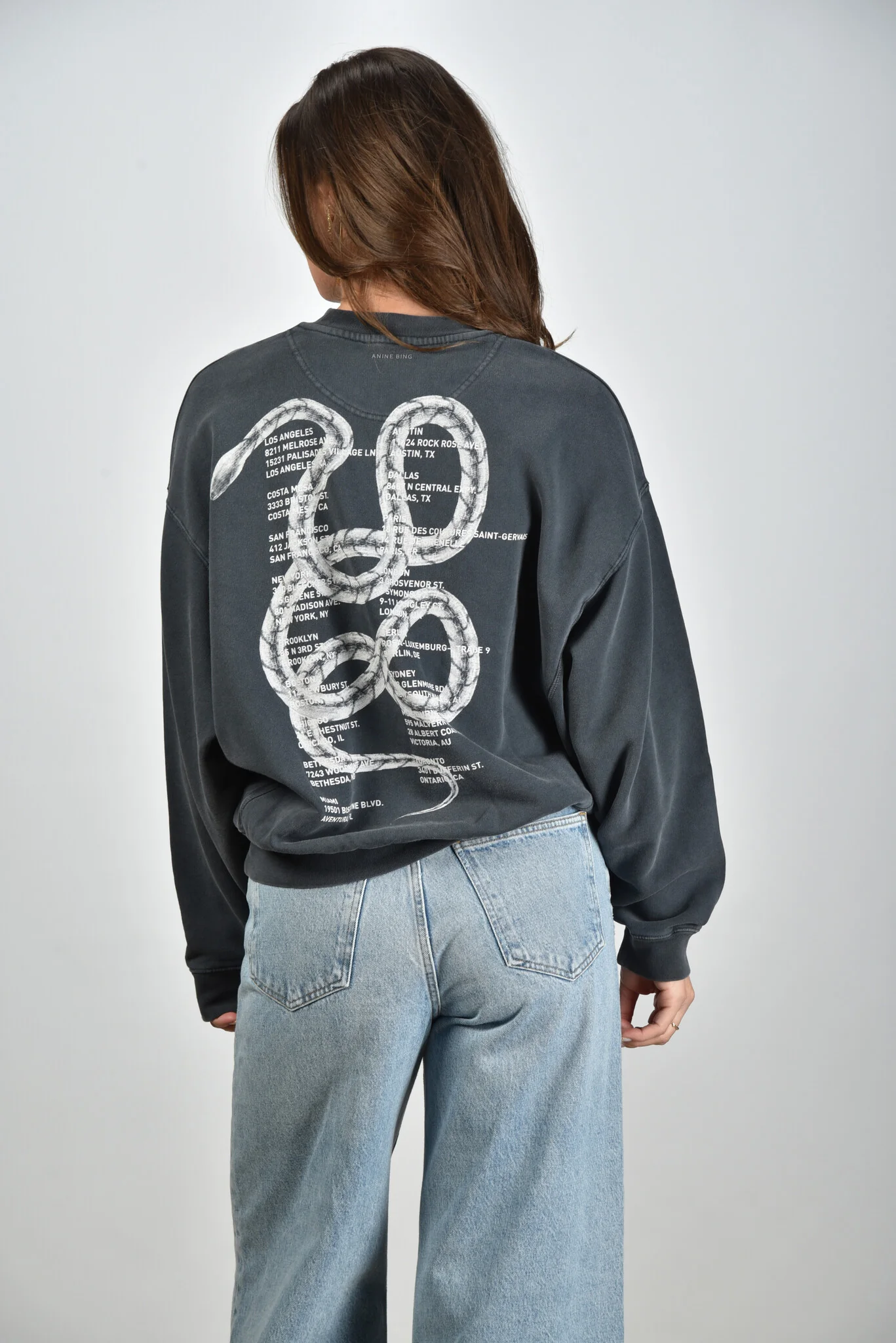 Dit is de trui Jaci van Anine Bing, in een diepe grijstint die de Washed Black finish goed laat uitkomen. De katoenkwaliteit voelt stevig en geeft de trui een ontspannen vorm. Op de rug staat een grote witte slangprint die meteen de aandacht trekt. Rondom zie je een lijst met steden en adressen, gedrukt in helder wit. De naden hebben een lichte vervaging die de gewassen look versterkt. De pasvorm is normaal, met voldoende ruimte voor een soepele lijn langs het lichaam. Anine Bing staat bekend om items die direct herkenbaar zijn door hun duidelijke signatuur en dat zie je hier goed terug.