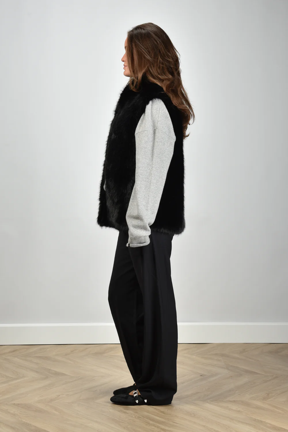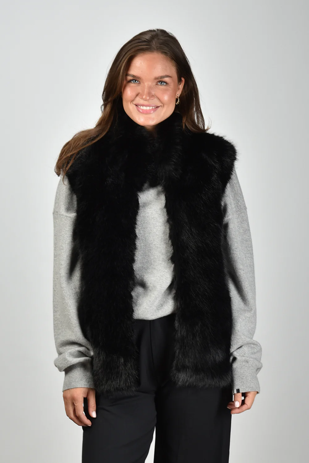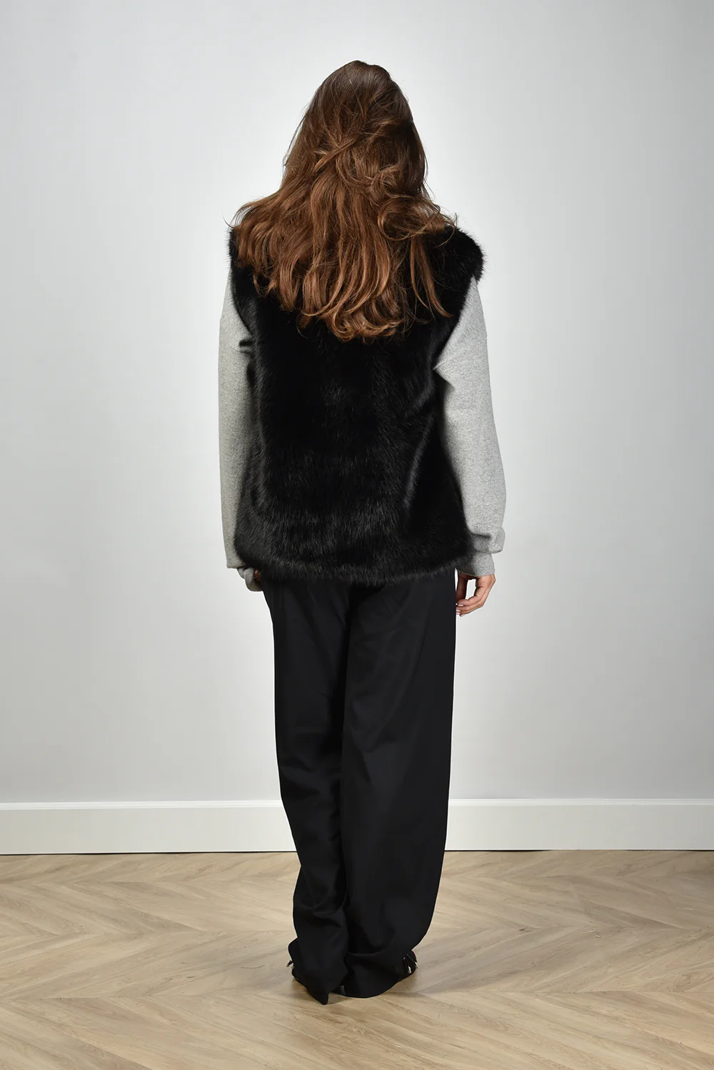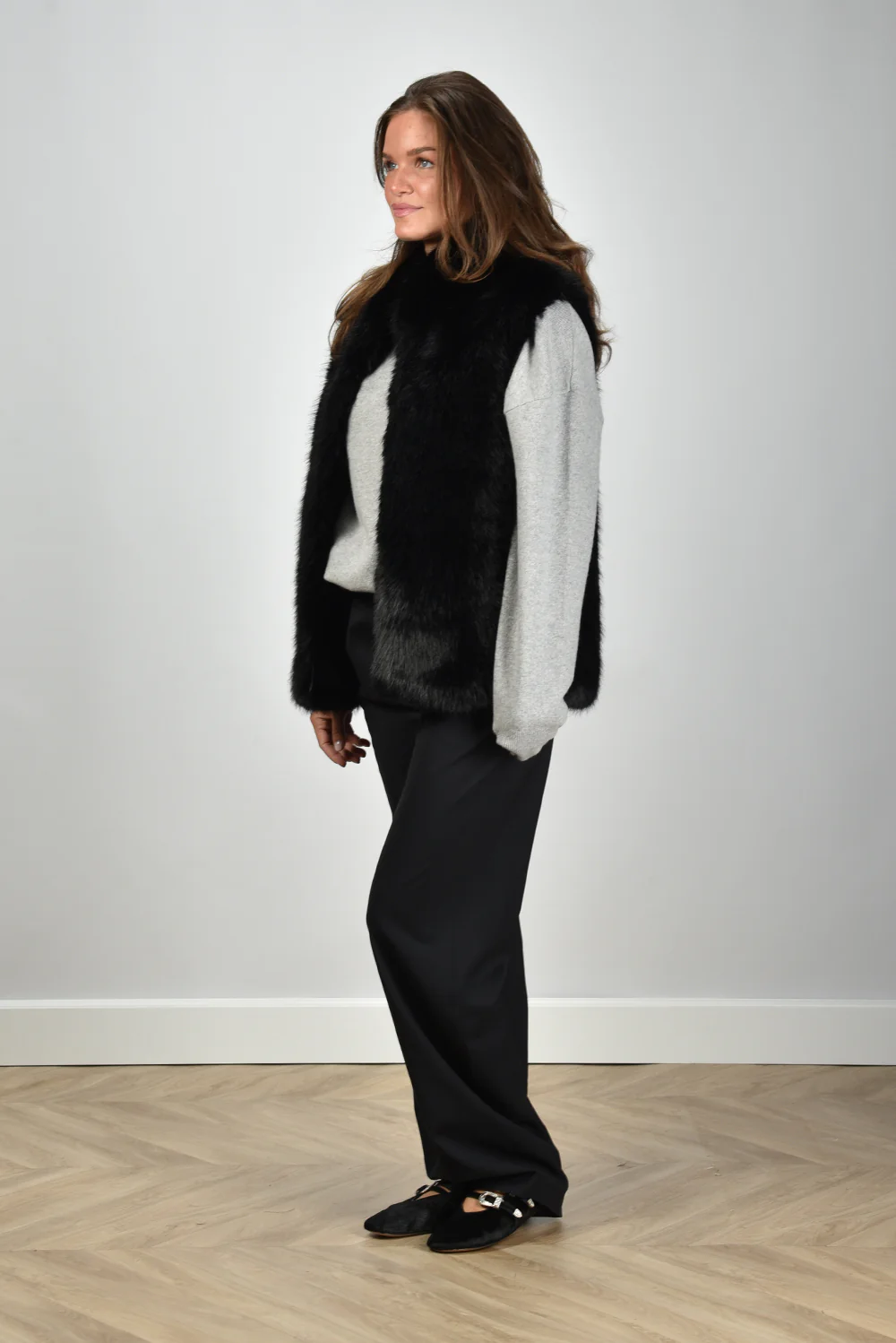 De gilet Laila van APPARIS is een blikvanger in diepe zwarttint. Deze lange, mouwloze gilet heeft een volle faux-fur structuur die direct opvalt door de rijke vacht. De opstaande kraag sluit mooi aan en geeft extra contrast aan het rechte, robuust gevormde silhouet. De pasvorm is normaal, waardoor hij comfortabel over een trui of blouse valt zonder volumineus te worden. Gemaakt van 100% polyester, wat zorgt voor stevigheid en een gladde binnenkant zodat hij soepel aan- en uitgaat. Combineer de gilet met de Extreme Cashmere trui Crew Hop 53 grey voor een ontspannen, stijlvolle set.