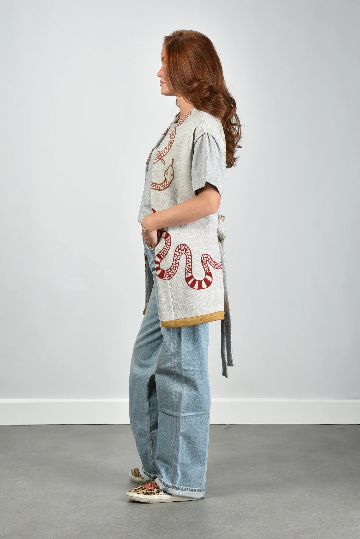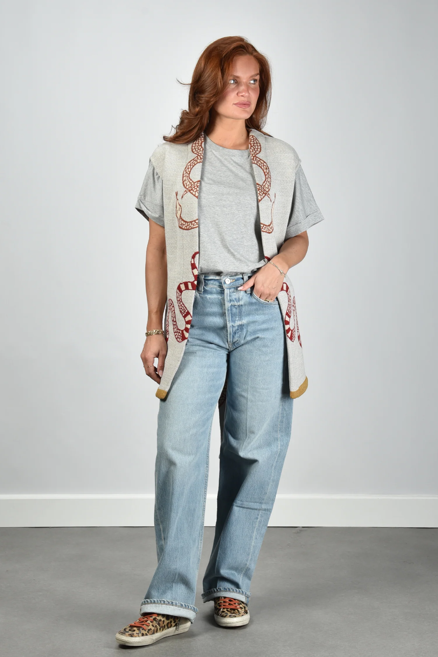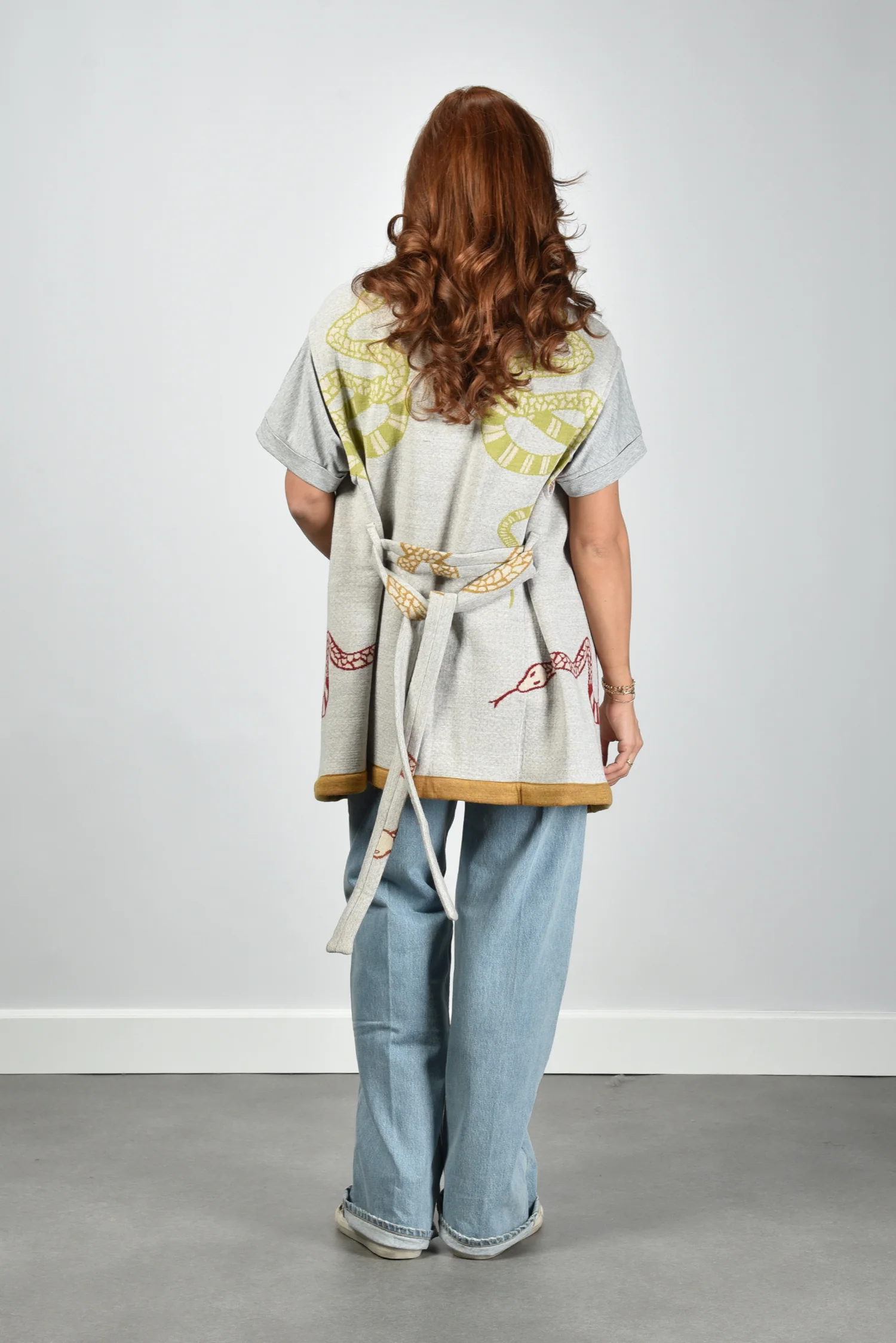 De gilet Snake van AVDW is zo’n item dat direct opvalt door zijn karakter. Het openvallende model zonder sluiting laat de grote slangenprint in rood en bruin mooi tot zijn recht komen. De contrasterende gele rand aan de zoom geeft het vest een scherp, modern randje. De grijze, bijna ecru basis zorgt voor balans. Gemaakt van 100% wol, voelt deze gilet vol en stevig aan. Combineer hem met het AVDW t-shirt Cami Z1097 grey voor een stijlvolle, gelaagde look. De gilet valt normaal op maat, kies gerust je gebruikelijke maat.