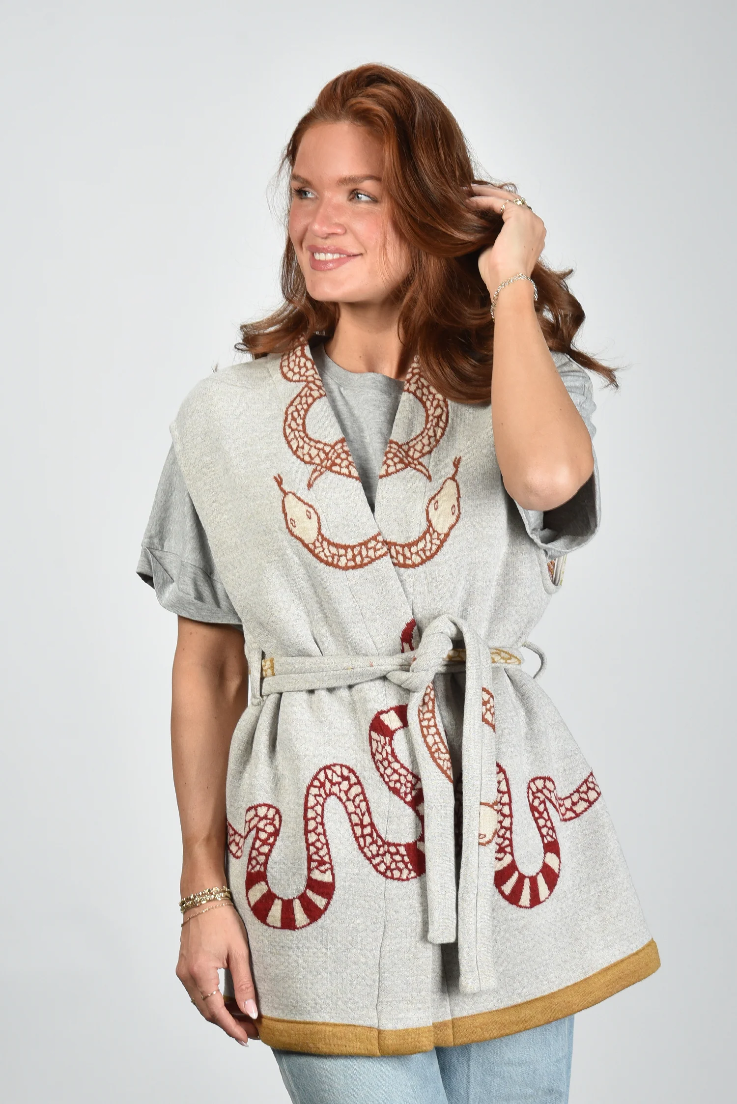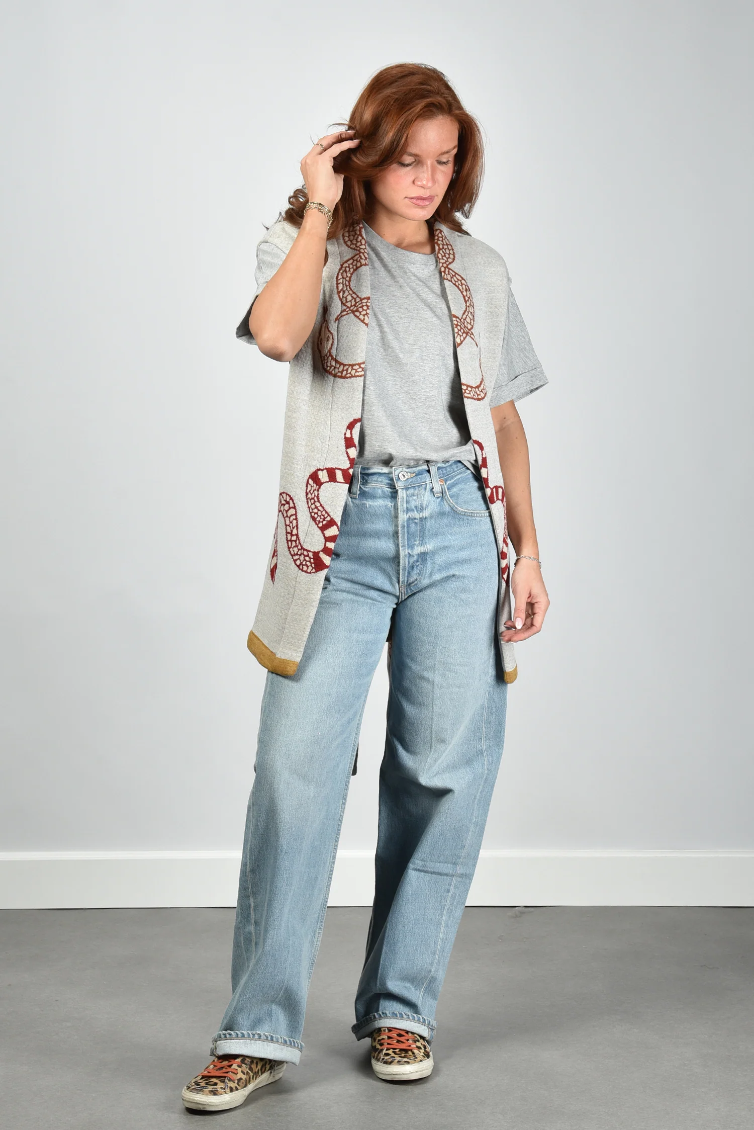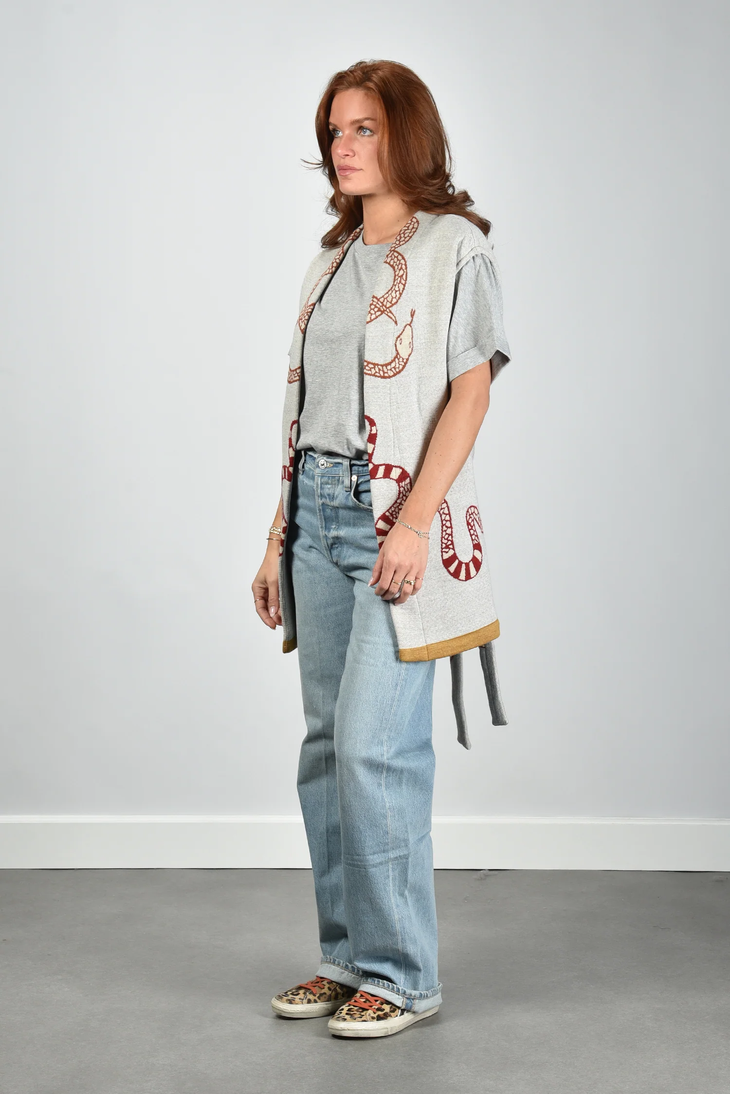 De gilet Snake van AVDW is zo’n item dat direct opvalt door zijn karakter. Het openvallende model zonder sluiting laat de grote slangenprint in rood en bruin mooi tot zijn recht komen. De contrasterende gele rand aan de zoom geeft het vest een scherp, modern randje. De grijze, bijna ecru basis zorgt voor balans. Gemaakt van 100% wol, voelt deze gilet vol en stevig aan. Combineer hem met het AVDW t-shirt Cami Z1097 grey voor een stijlvolle, gelaagde look. De gilet valt normaal op maat, kies gerust je gebruikelijke maat.