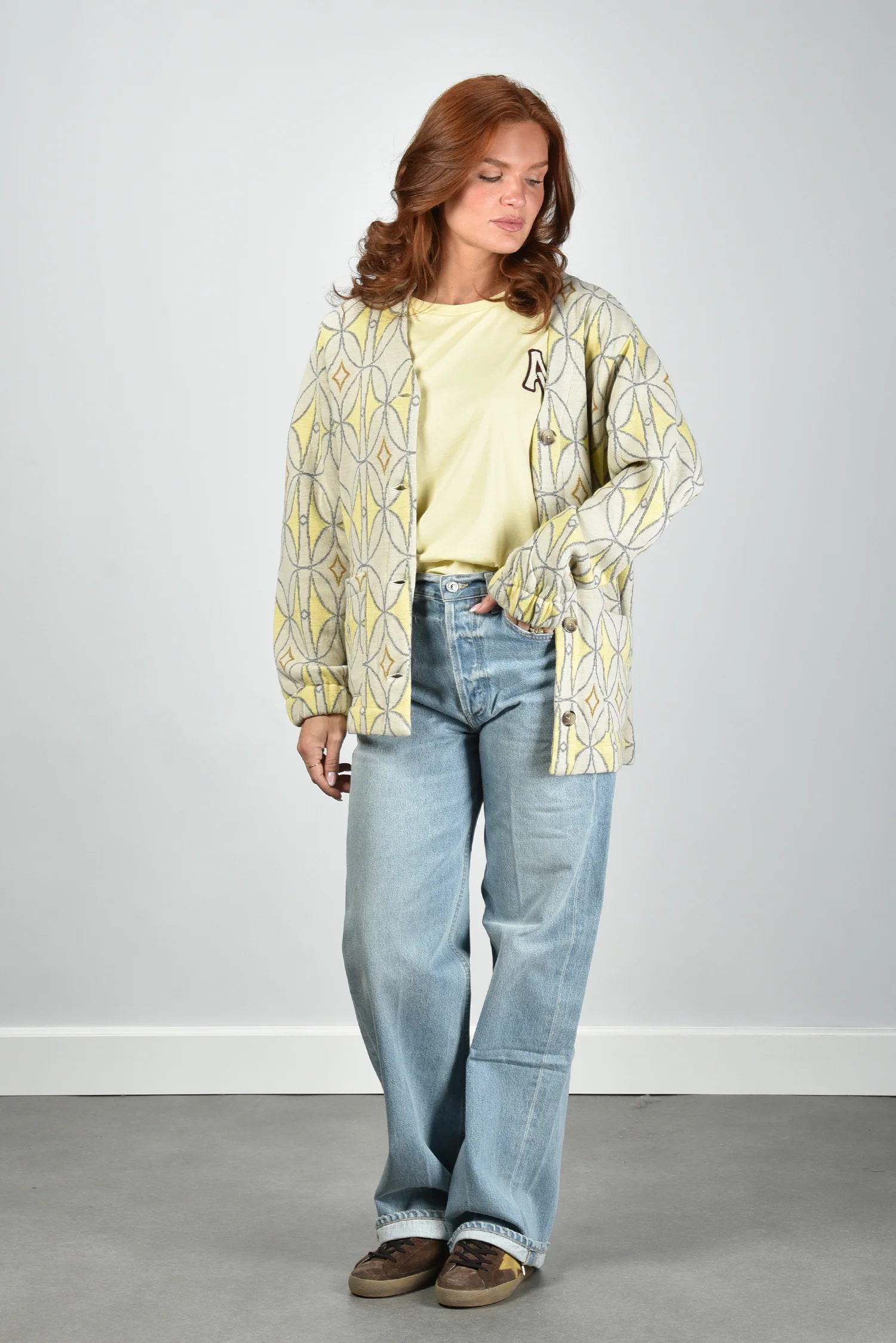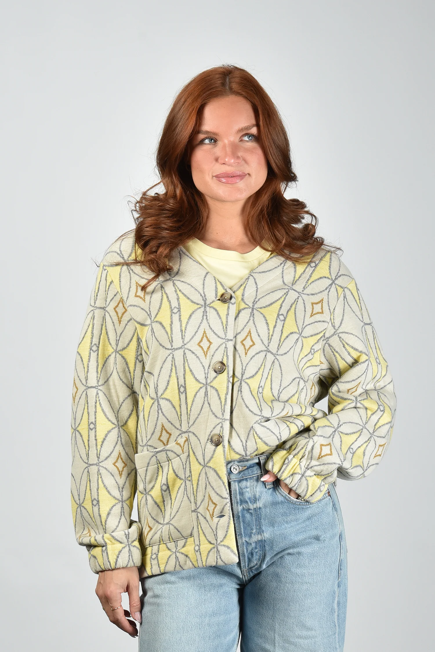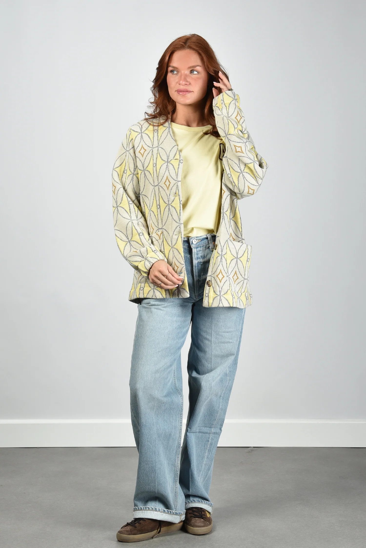 Het vest Luna van AVDW is zo’n stuk dat direct opvalt door zijn grafische patroon in geel, grijs en bruin. De print met cirkels en ruitvormen geeft het ontwerp een sterk eigen karakter. De grote knopen vooraan zorgen voor een mooi ritme in het geheel. De losse pasvorm met verlaagde schoudernaden en wijde mouwen voelt ontspannen, zonder vorm te verliezen. Gemaakt van 100% wol, waardoor het vest zacht aanvoelt en prettig warm blijft. Mooi te combineren met het AVDW t-shirt Cami Z1096 yellow voor een ton-sur-ton effect. Valt normaal op maat, kies dus gerust je gebruikelijke maat.