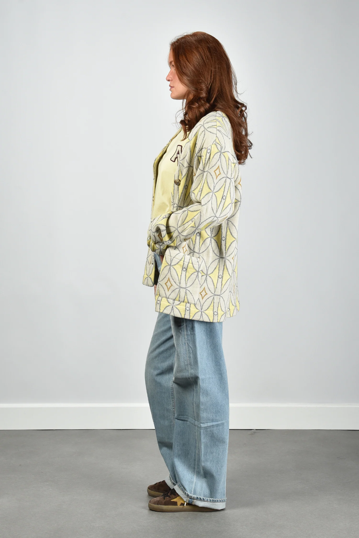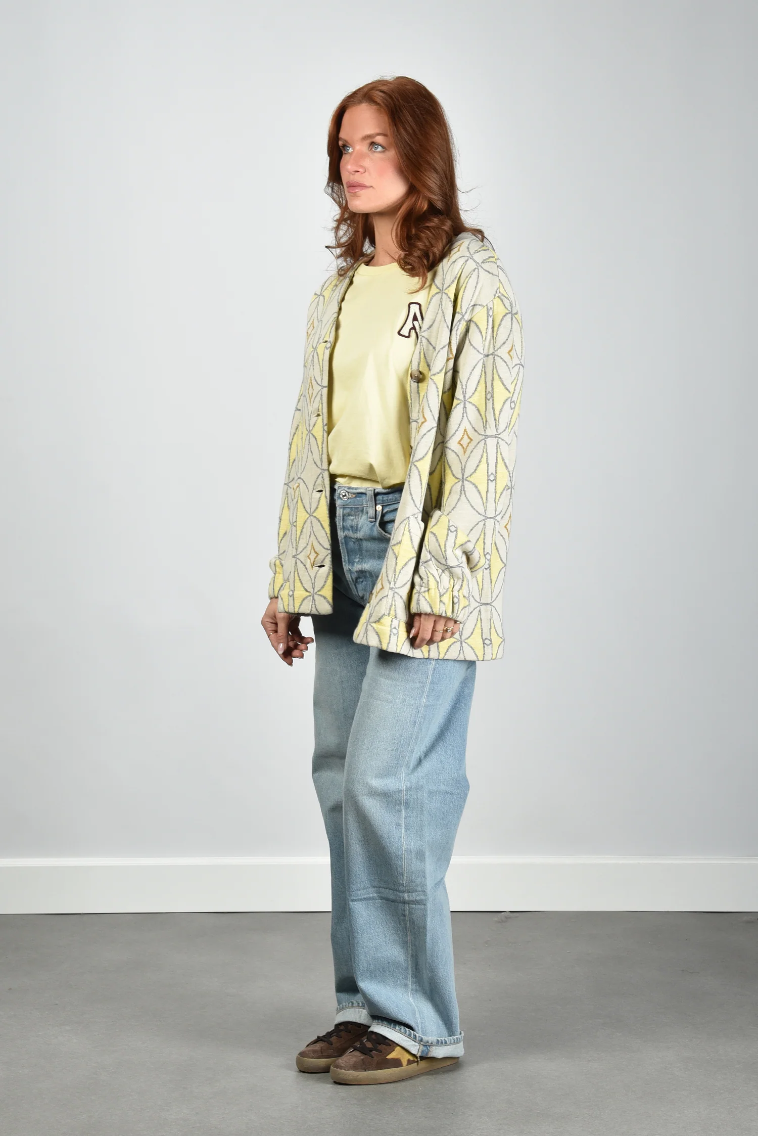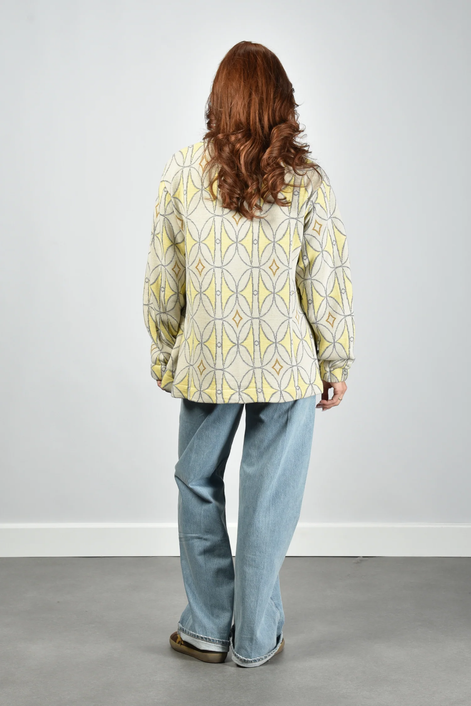 Het vest Luna van AVDW is zo’n stuk dat direct opvalt door zijn grafische patroon in geel, grijs en bruin. De print met cirkels en ruitvormen geeft het ontwerp een sterk eigen karakter. De grote knopen vooraan zorgen voor een mooi ritme in het geheel. De losse pasvorm met verlaagde schoudernaden en wijde mouwen voelt ontspannen, zonder vorm te verliezen. Gemaakt van 100% wol, waardoor het vest zacht aanvoelt en prettig warm blijft. Mooi te combineren met het AVDW t-shirt Cami Z1096 yellow voor een ton-sur-ton effect. Valt normaal op maat, kies dus gerust je gebruikelijke maat.