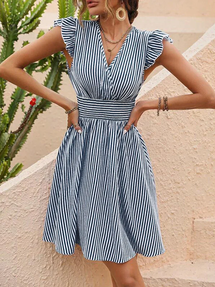 Voeg een frisse touch toe aan je zomergarderobe met deze casual zomerjurk voor vrouwen. Het streepprintontwerp en de A-lijn snit zorgen voor een tijdloze en flatterende uitstraling. De elastische taille biedt een comfortabele fit, terwijl de flonkelmouwen een elegante flair toevoegen. Deze midi-jurk is perfect voor casual uitjes en kan moeiteloos worden aangekleed of afgekleed.