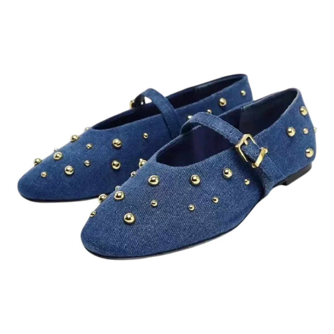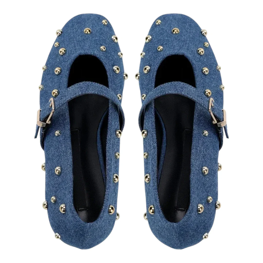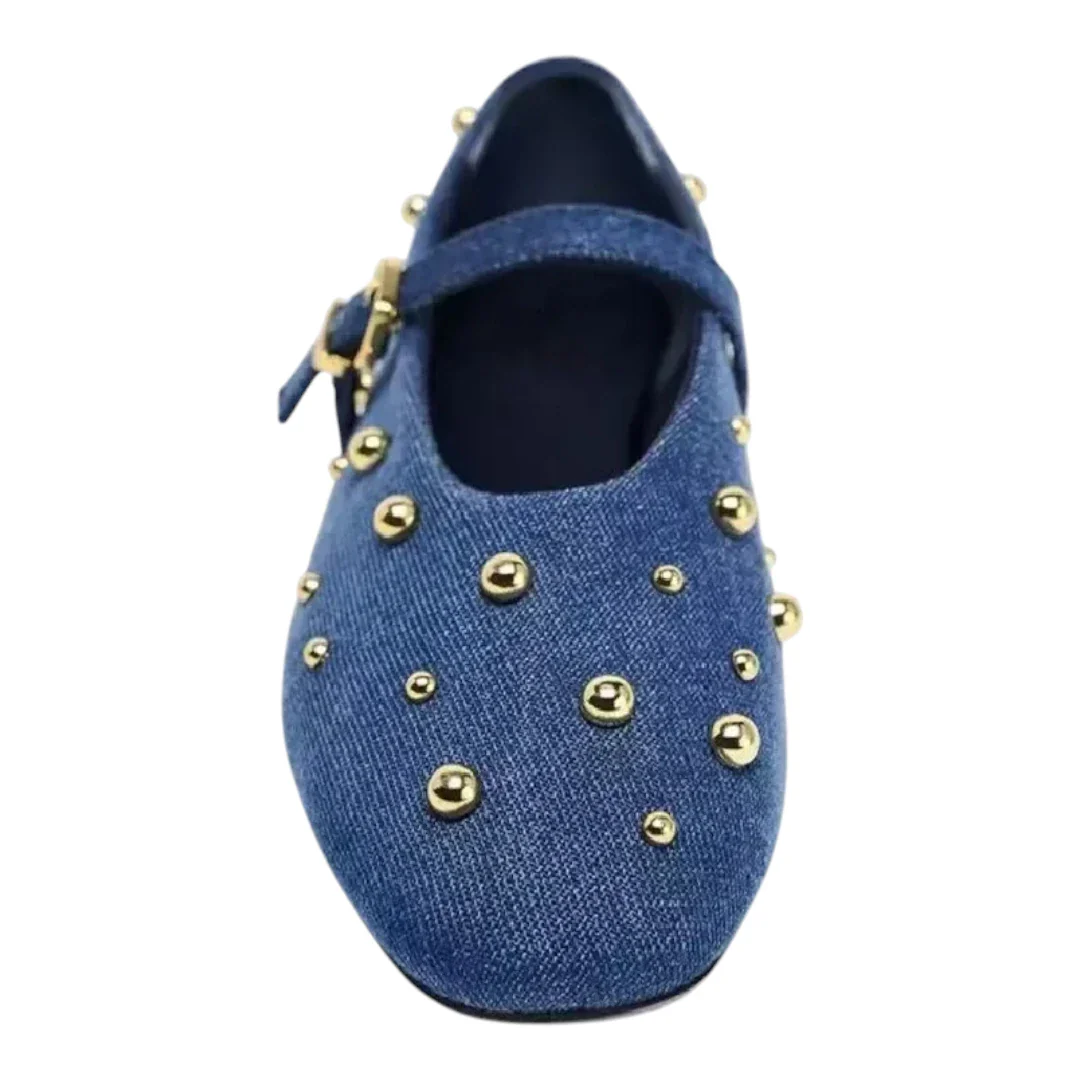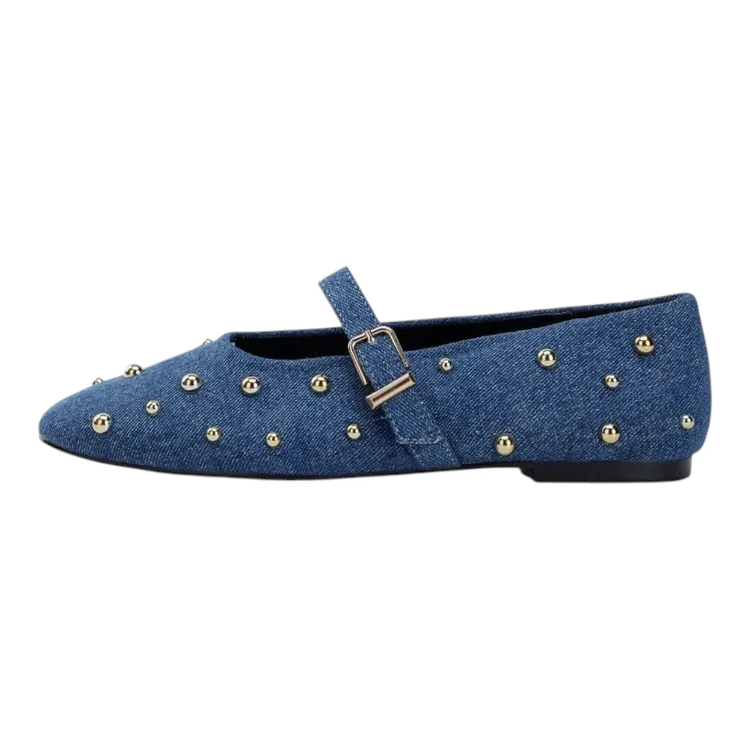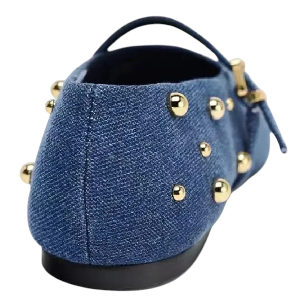 Stap in een wereld van elegantie en gemak met deze denim ballerina schoenen met gouden studs. Het comfort van de zachte binnenvoering en de flexibele zool geeft je voeten een gevoel van ontspanning, terwijl de stevige gesp voor een zekere fit zorgt.