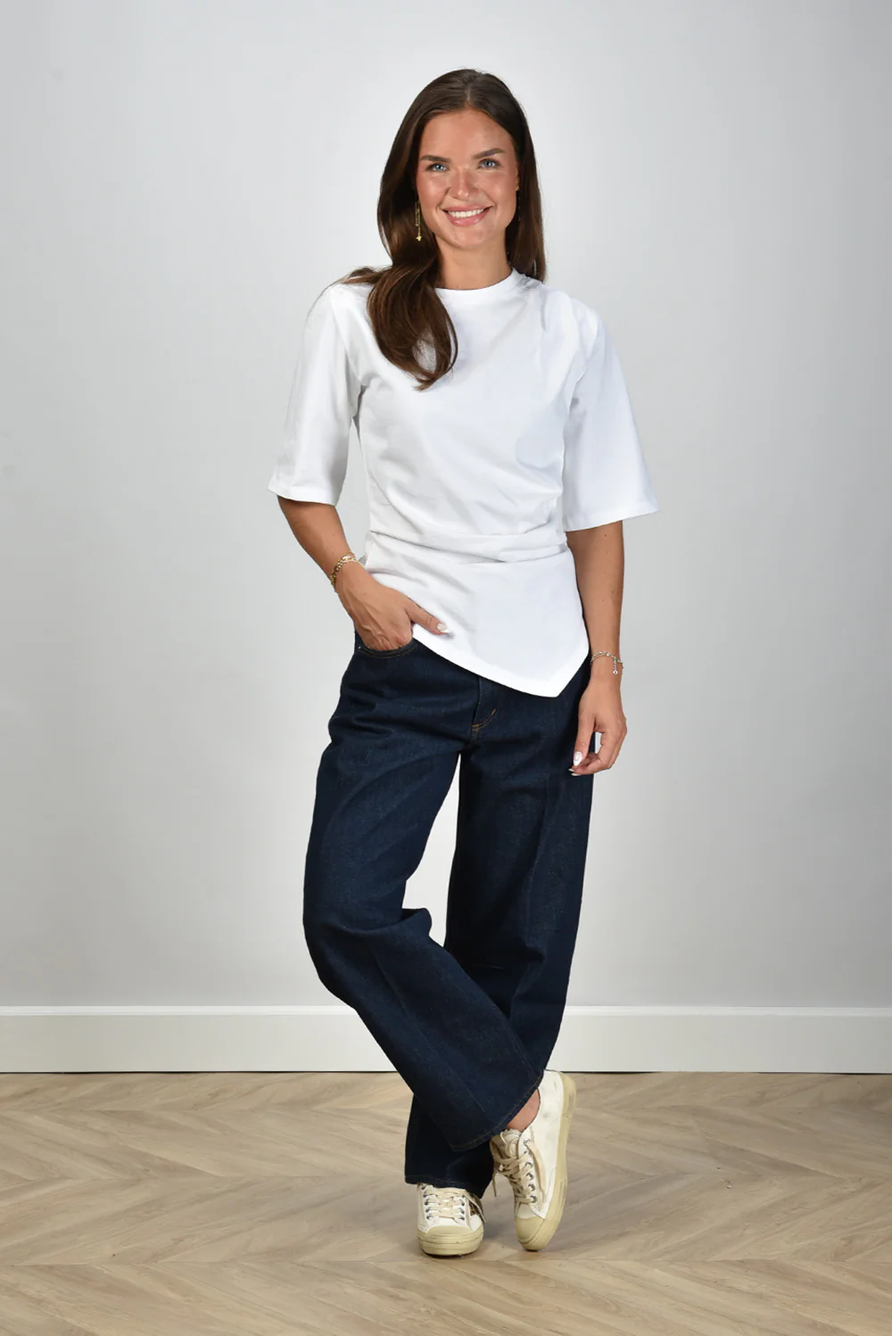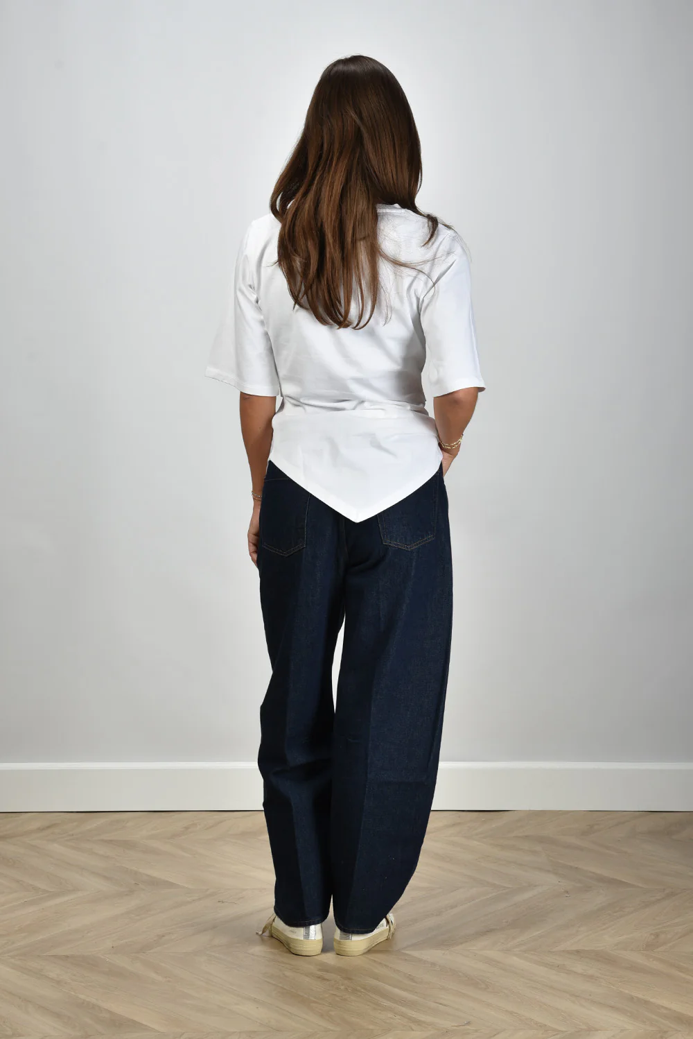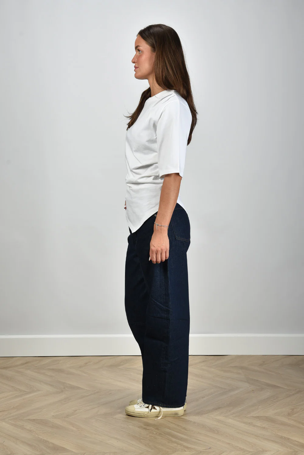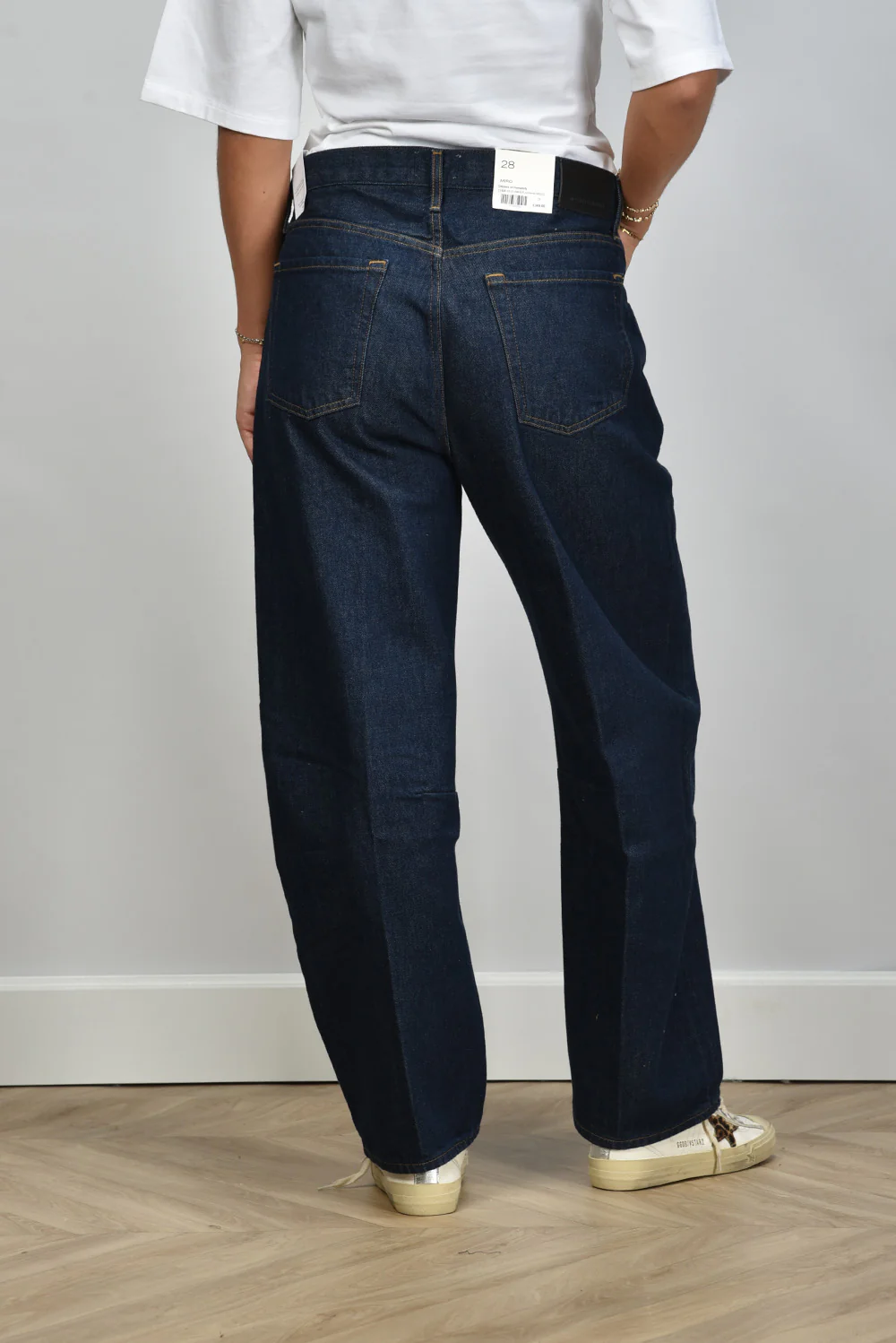 De jeans Miro Amherst van Citizens of Humanity heeft die herkenbare, donkere denimkleur die meteen karakter geeft aan een outfit. De wassing is diepblauw, rustig en intens tegelijk. De pijpen vallen recht en wijd, waardoor de broek mooi langs het been loopt en laag over de schoenen valt. Deze jeans is gemaakt van 100% katoen en voelt stevig, met die typische denimstructuur waar Citizens of Humanity om bekendstaat. Het merk uit Los Angeles maakt elk paar in eigen ateliers, met aandacht voor materiaal en pasvorm. Draag deze Miro Amherst met de Golden Goose sneakers V Star 2 voor een relaxte, doordachte look.
