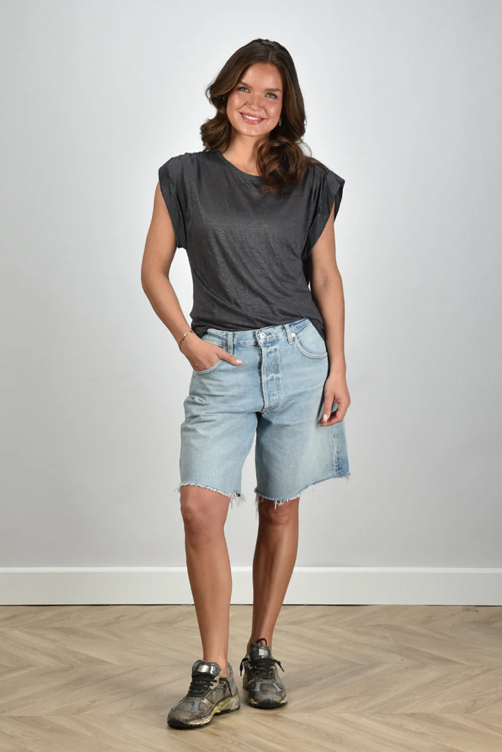 De short Ayla van Citizens of Humanity heeft die ontspannen denimlook waar Californiƫ om bekendstaat. De lichte wassing met subtiel kleurverschil en de rafelige zoomranden geven de short een stoere rand. De pijpen vallen net boven de knie en hebben een iets lossere pasvorm, waardoor hij luchtig oogt en prettig draagt. Gemaakt van 100% katoen, stevig maar soepel tegelijk. Citizens of Humanity vervaardigt dit model in eigen atelier, met dezelfde zorg als hun iconische jeans. Combineer de Ayla bianca met het Semicouture t-shirt mezzanotte voor een ontspannen zomerset.