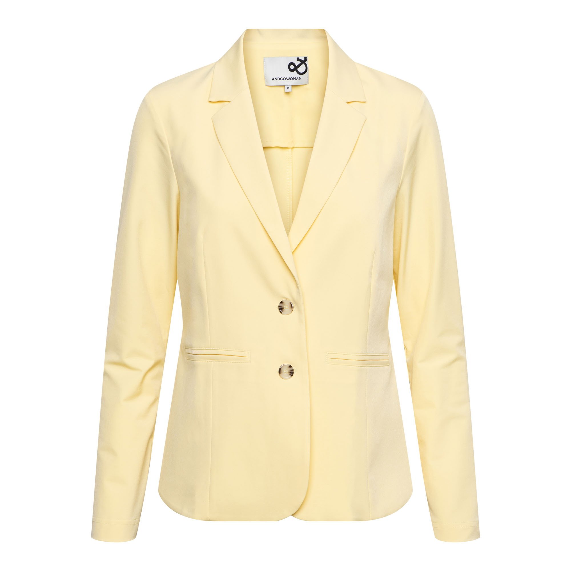 De zachte butter yellow kleur geeft de blazer een frisse en stijlvolle uitstraling. De reverskraag, twee knopen en steekzakken zorgen voor een klassieke maar moderne look die perfect past bij zowel zakelijke als casual outfits.