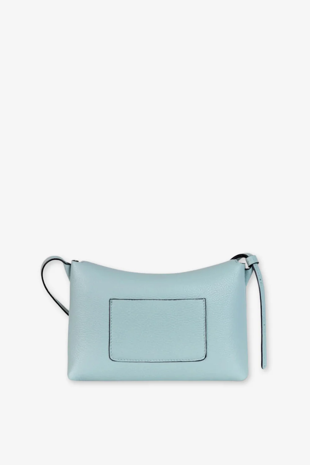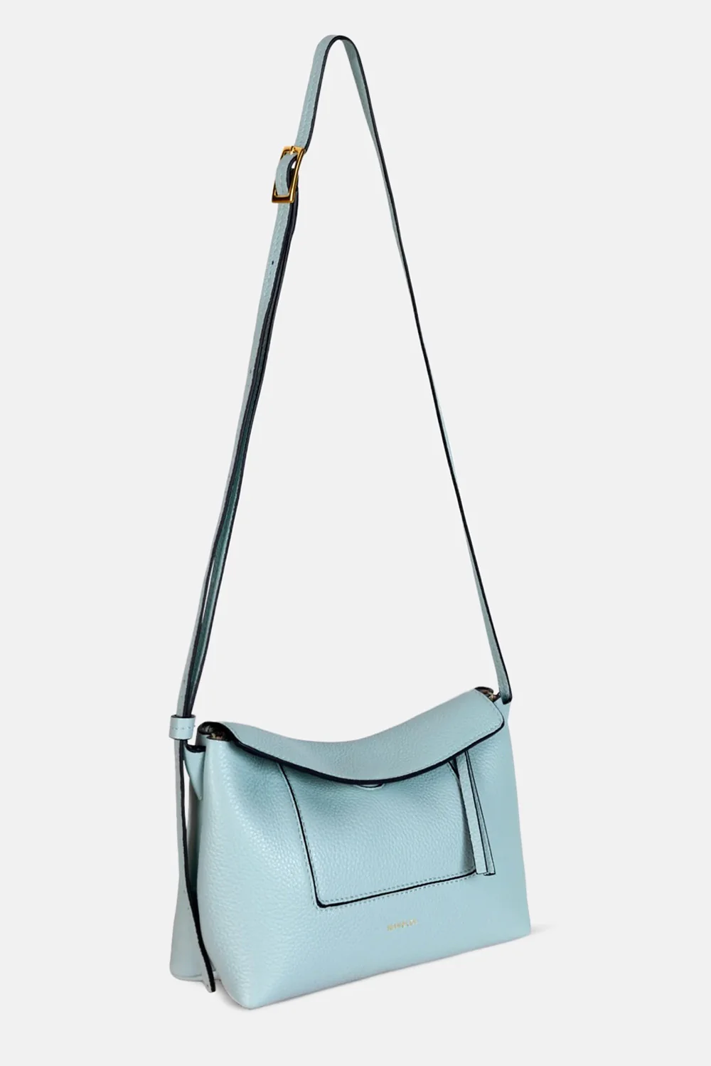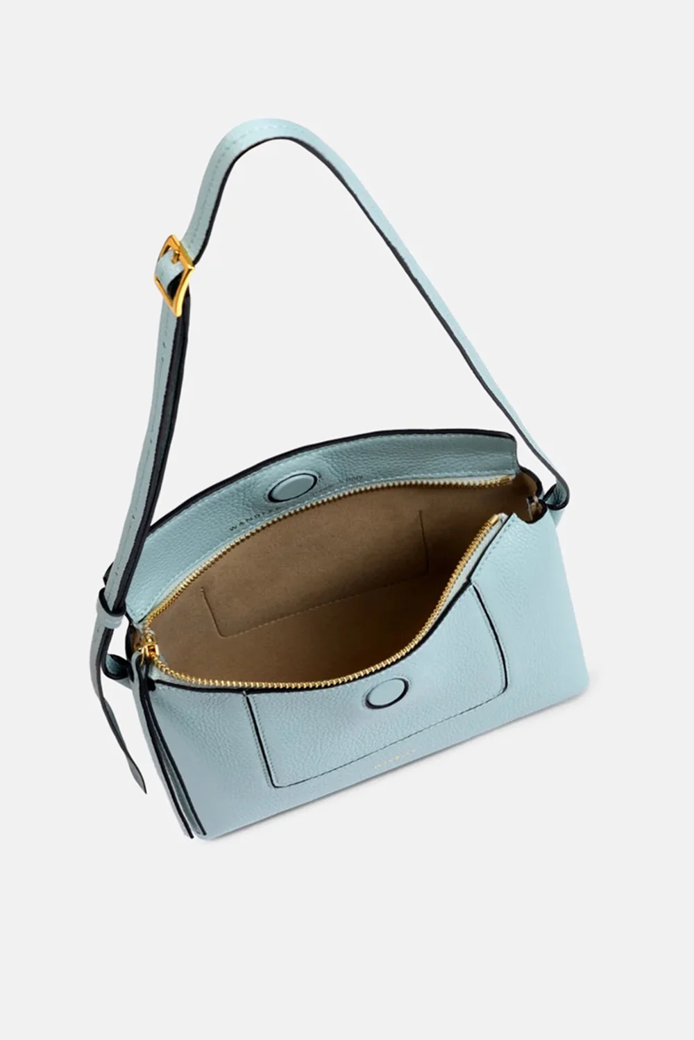 Dit is de Penelope Slouch Mini van Wandler, een compacte crossbody in Sea Crust die meteen opvalt door de lichtblauwe tint. Het silhouet voelt zacht door de licht afgeronde vorm, terwijl de grote klep met zwarte randafwerking het geheel duidelijk omlijst. Aan de voorkant zie je een vlak met strakke stiksels dat net iets uitsteekt en zo de vorm extra diepte geeft. Het formaat van 13,5 bij 19,5 bij 7 centimeter maakt haar handig voor dagelijks gebruik zonder zwaar te worden. Wandler staat bekend om heldere lijnen en vakmanschap uit Italië, en dat zie je hier in elke afwerking terug.
