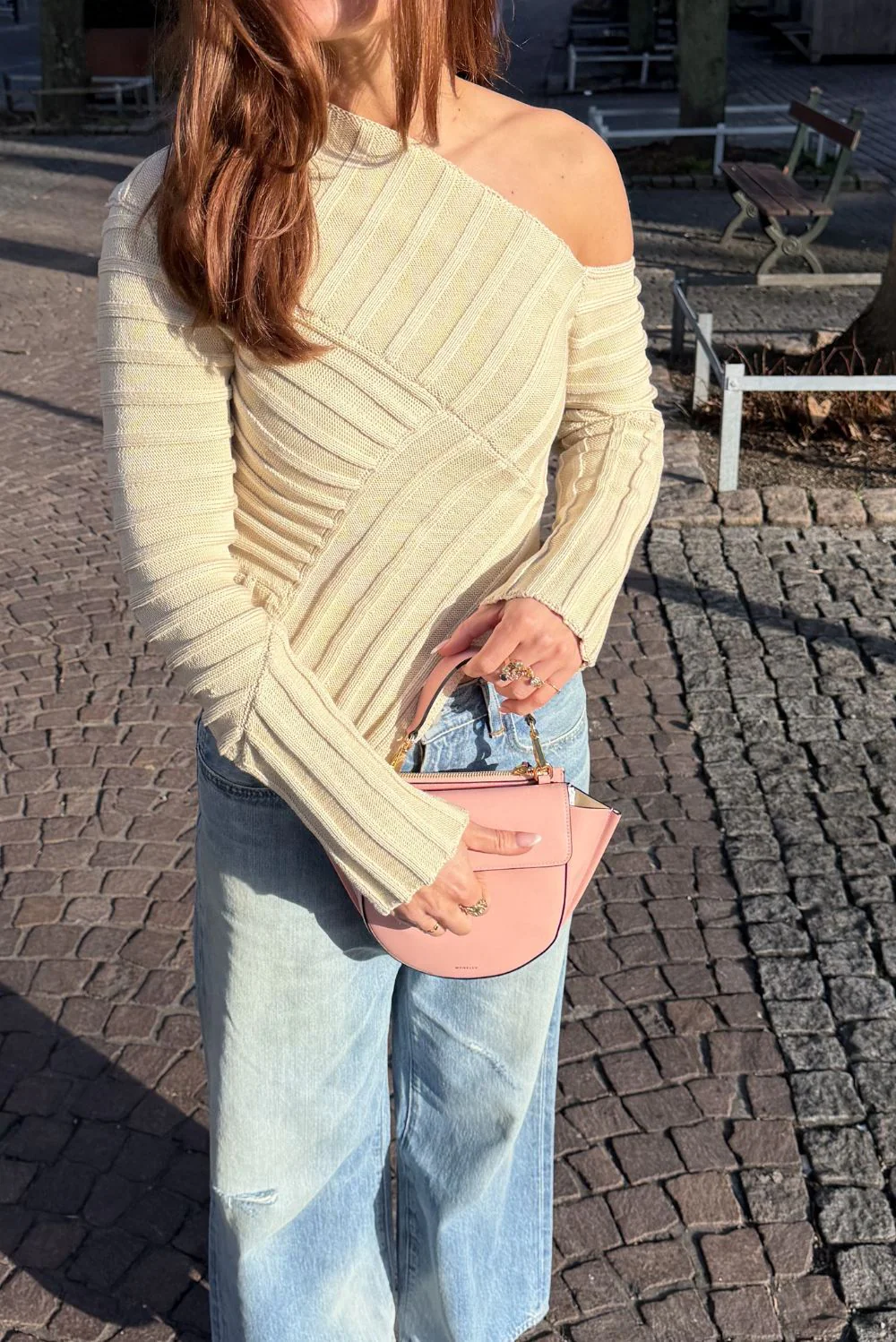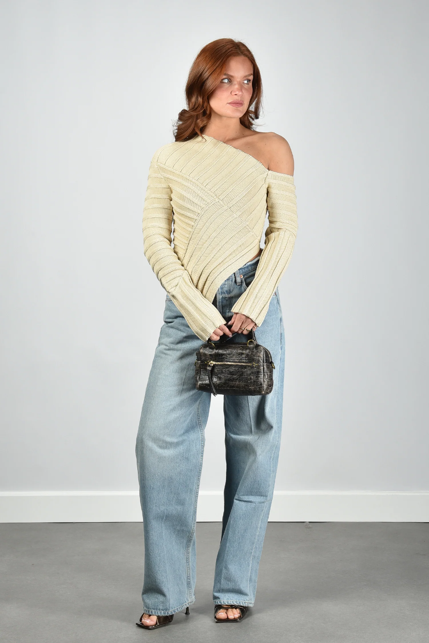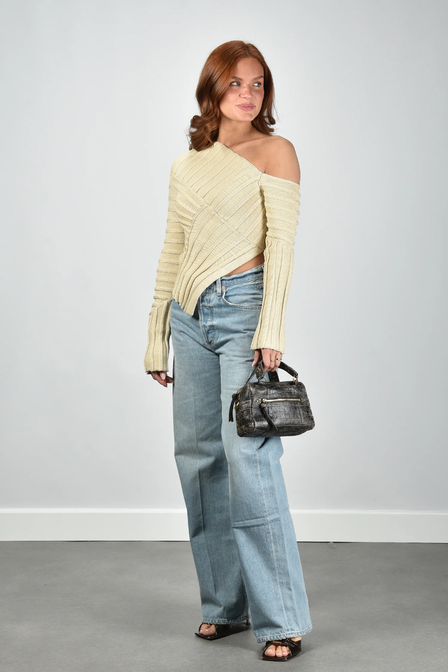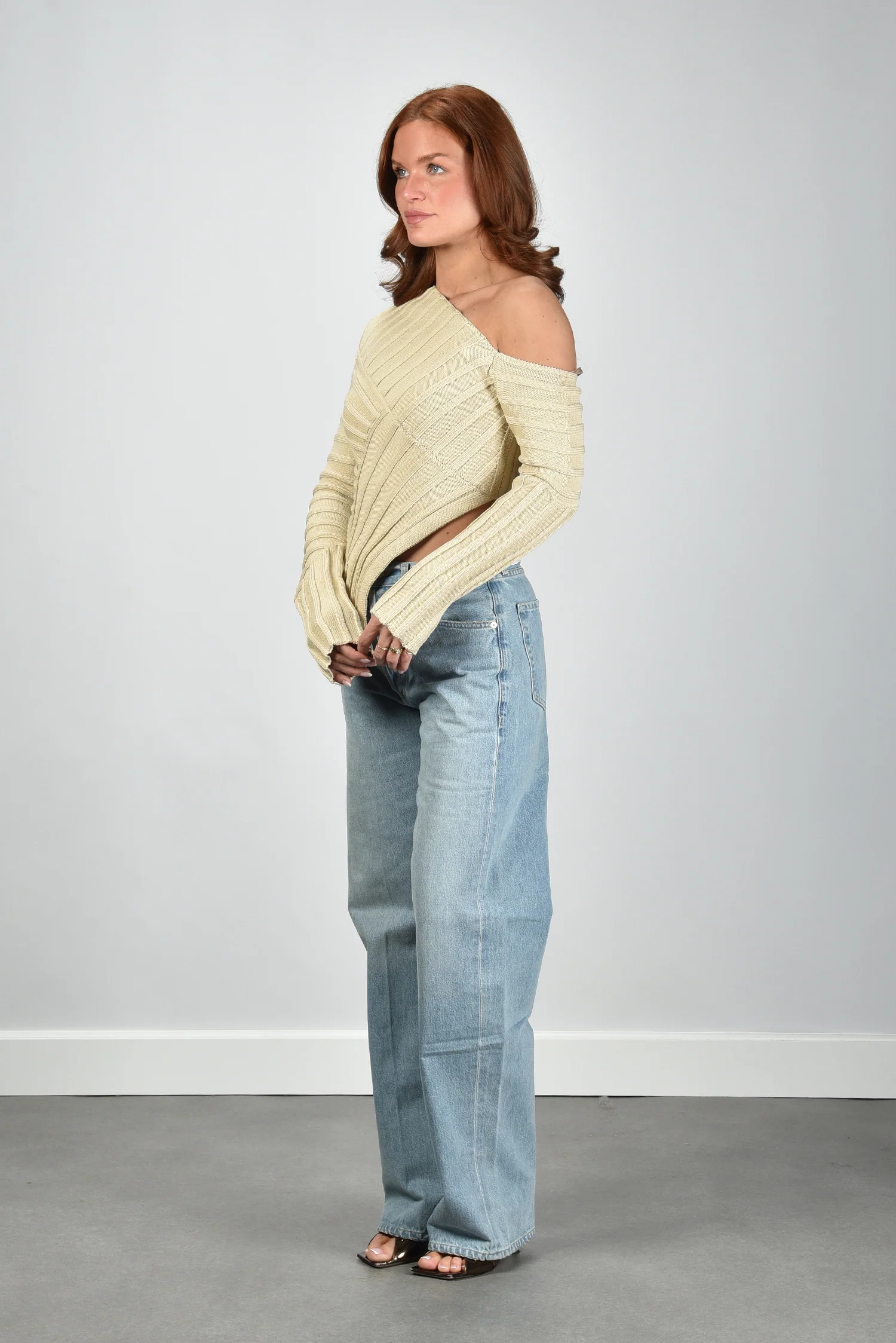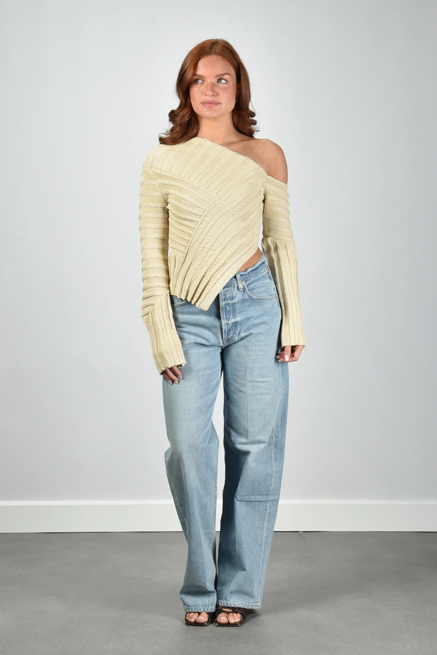 Ik laat je graag de Jaidan Knit top van Cult Gaia zien. De top heeft een asymmetrische hals die één schouder vrij laat en daardoor meteen de vorm laat spreken. De ribbelstructuur loopt in verschillende richtingen en geeft het beige katoen een levendige textuur. De mouwen zijn extra lang en hebben kleine splitjes aan de uiteinden die subtiel open vallen. Het katoen voelt stevig en licht tegelijk, prettig voor een top die mooi aansluit. De kleur beach sluit zacht aan op de huid. Deze top valt normaal op maat, dus je kunt uitgaan van je eigen maat. Cult Gaia staat bekend om zijn sculpturale ontwerpen en dat zie je hier terug in elke lijn en curve.