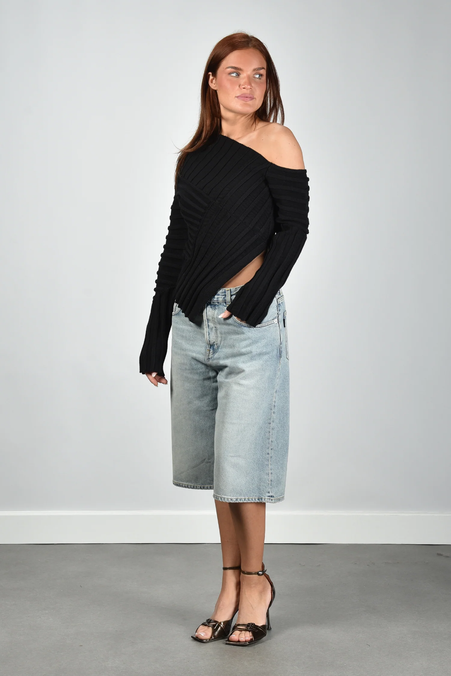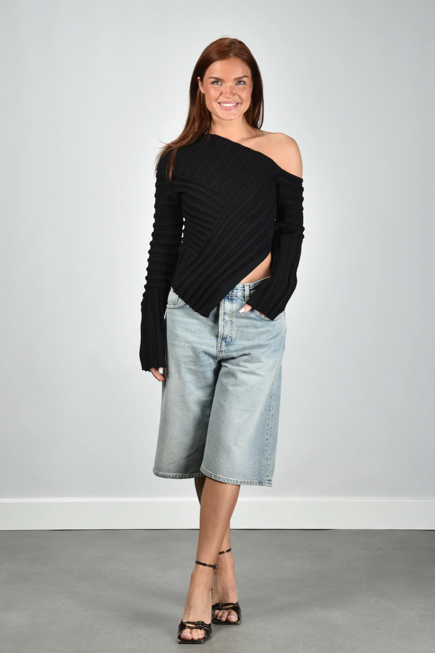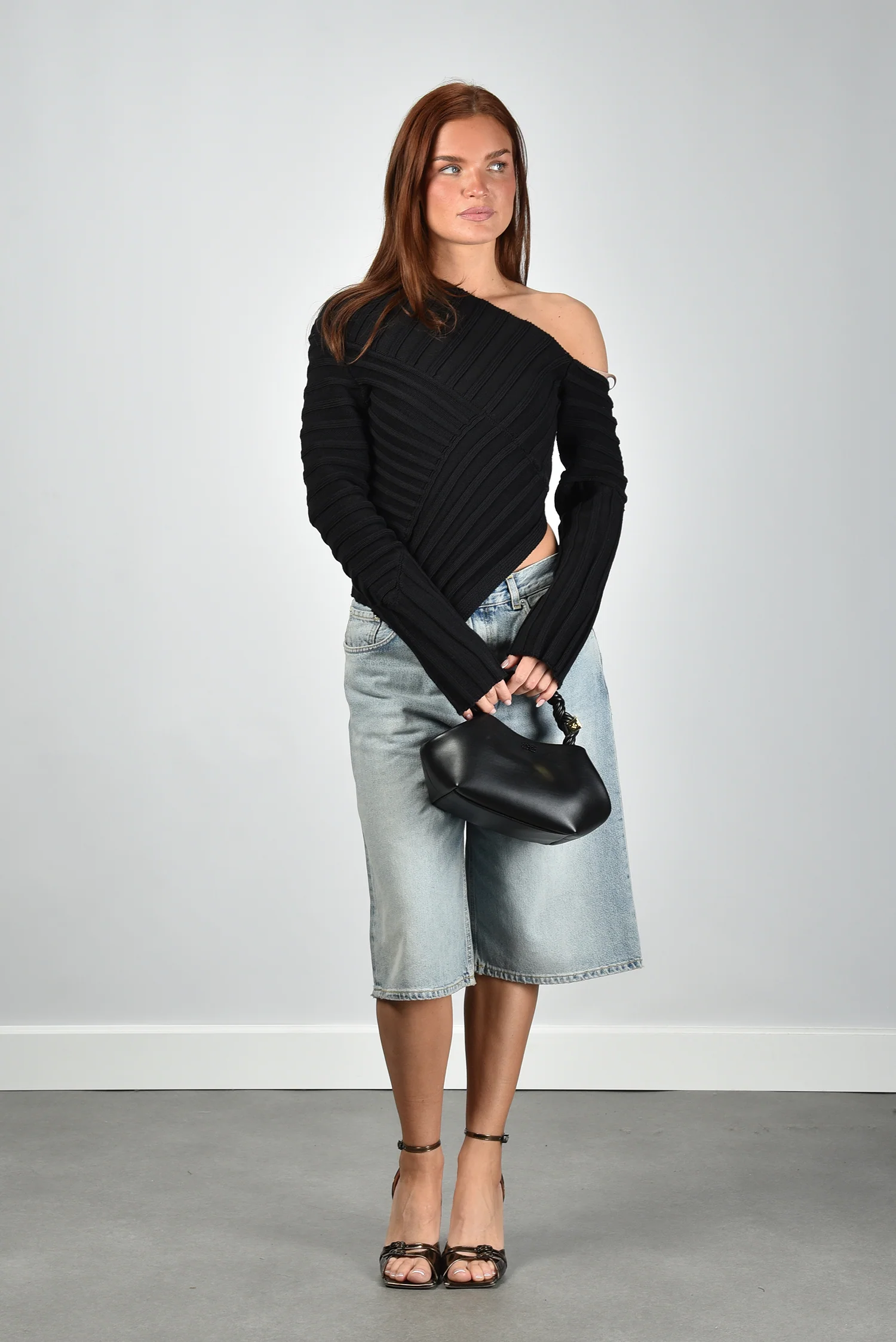 De top Jaiden Knit van Cult Gaia is zo’n item dat meteen in het oog springt. De zwarte knit heeft een asymmetrische halslijn met een open linkerschouder die het ontwerp spannend maakt zonder te overdrijven. Door het diagonale ribbreisel krijgt de top vorm en richting, wat het silhouet mooi volgt. De onregelmatige puntige zoom aan de voorkant geeft een subtiele twist, precies zoals je van Cult Gaia verwacht. Gemaakt van 100% katoen voelt de stof stevig en glad aan. Combineer hem met de Haikure jeans short New Becky voor een evenwichtige look die goed in balans is. De top valt normaal op maat, dus kies gerust je gebruikelijke maat.