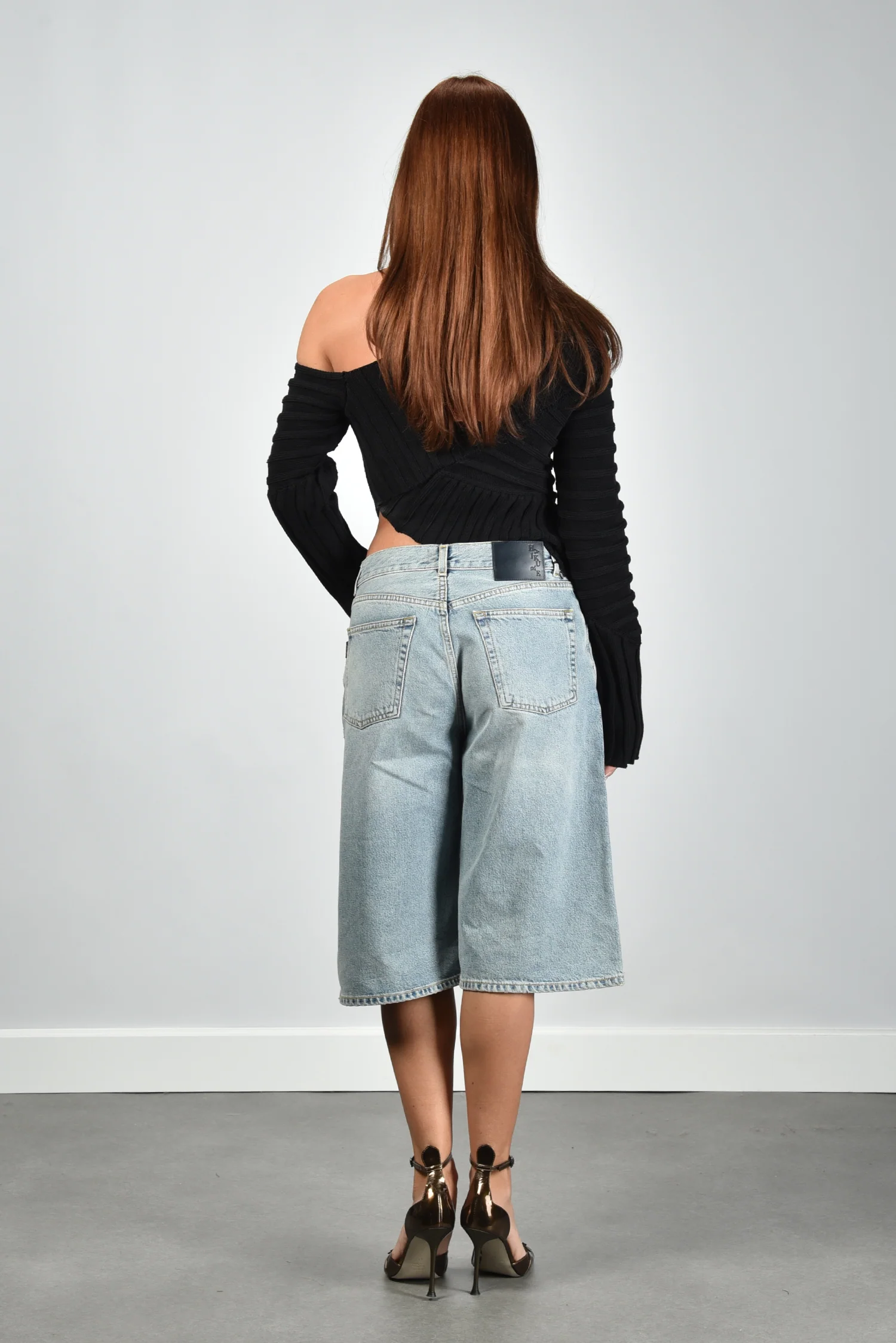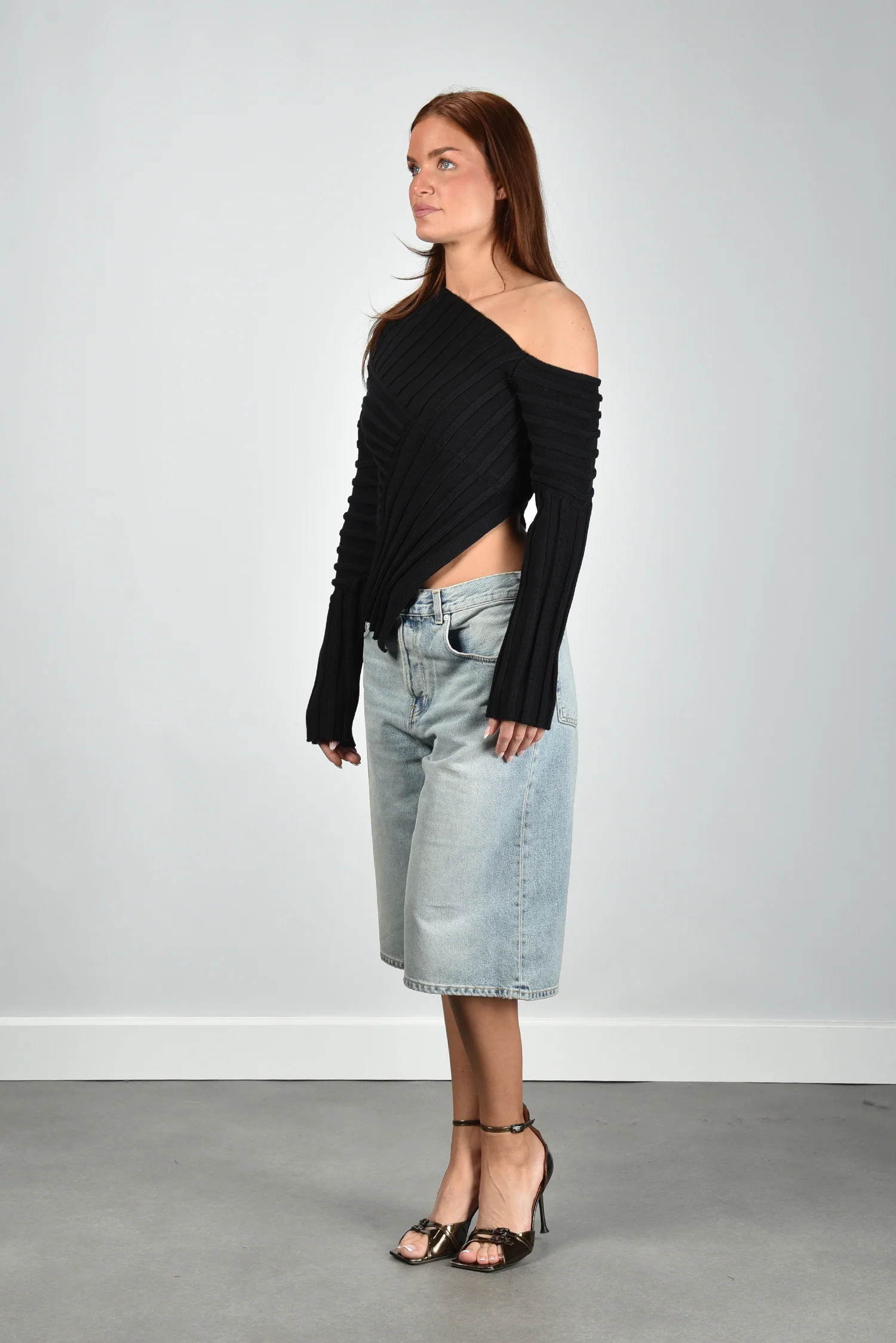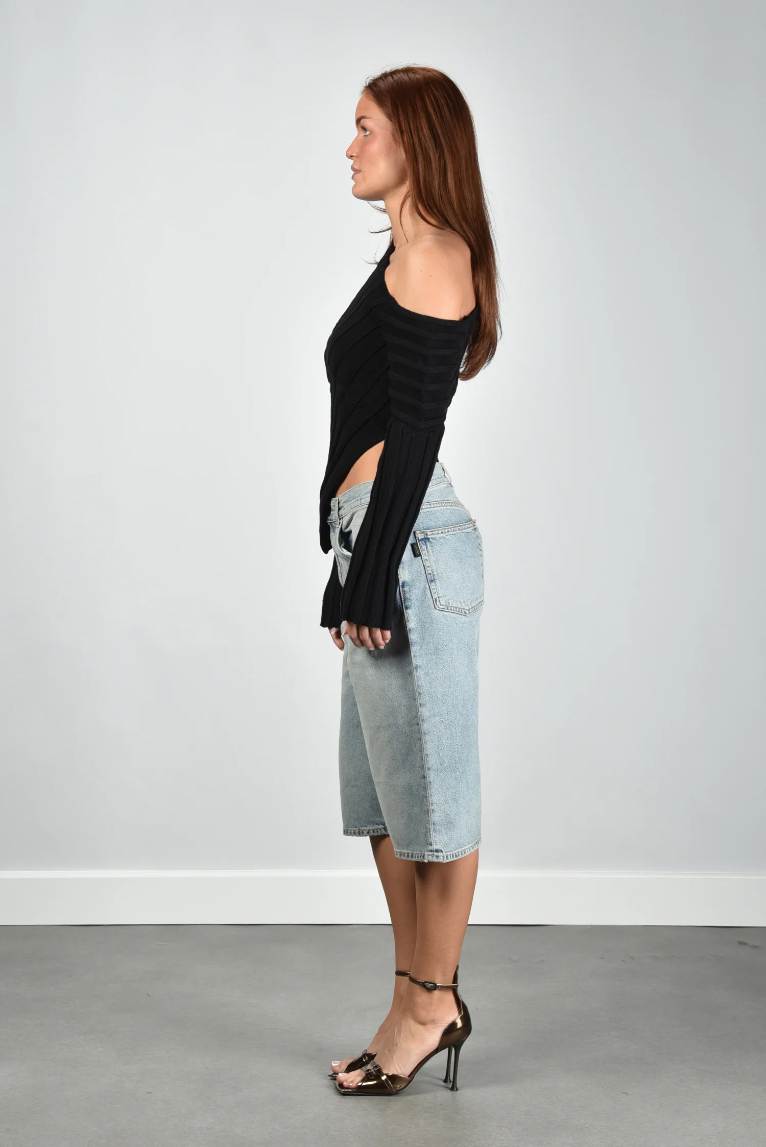 De top Jaiden Knit van Cult Gaia is zo’n item dat meteen in het oog springt. De zwarte knit heeft een asymmetrische halslijn met een open linkerschouder die het ontwerp spannend maakt zonder te overdrijven. Door het diagonale ribbreisel krijgt de top vorm en richting, wat het silhouet mooi volgt. De onregelmatige puntige zoom aan de voorkant geeft een subtiele twist, precies zoals je van Cult Gaia verwacht. Gemaakt van 100% katoen voelt de stof stevig en glad aan. Combineer hem met de Haikure jeans short New Becky voor een evenwichtige look die goed in balans is. De top valt normaal op maat, dus kies gerust je gebruikelijke maat.