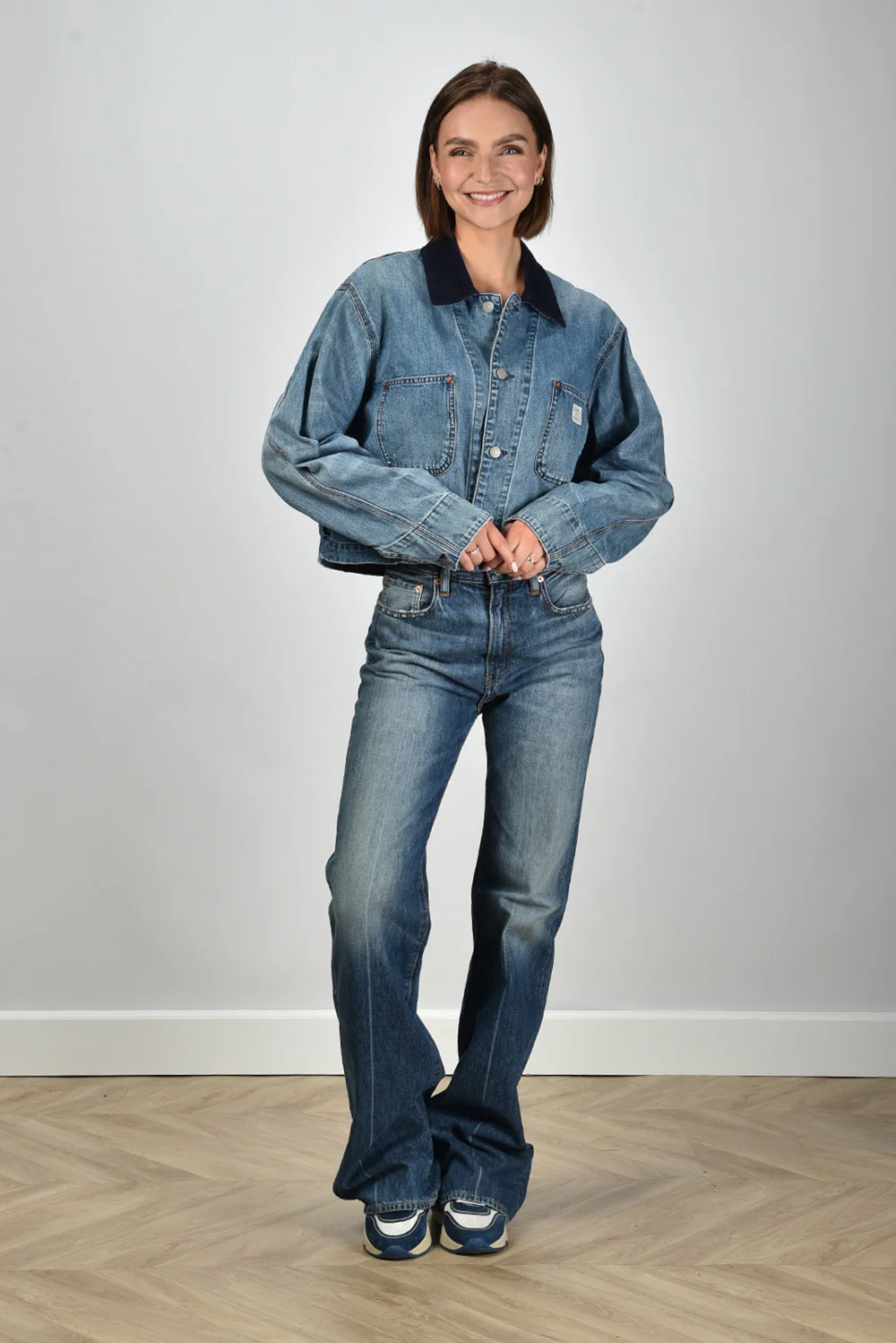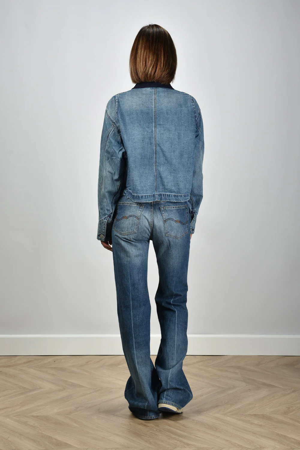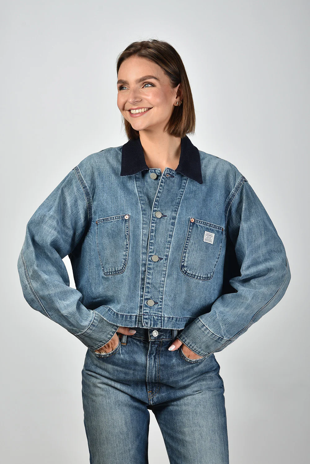 Hier zie je het jack cropped met corduroy kraag in blauw van Denimist. Het korte, boxy model valt recht en voelt door de 100 procent katoen stevig en licht aan. De donkere corduroy kraag steekt mooi af tegen het galton indigo, waardoor de bovenkant direct vorm krijgt. De twee ruime borstzakken met zichtbare stiksels en knoopdetails geven het jack een duidelijke structuur. De normale pasvorm draagt ontspannen en blijft netjes in model. Denimist staat bekend om stukken met karakter en dat zie je hier terug in de stoere afwerking en het compacte silhouet.