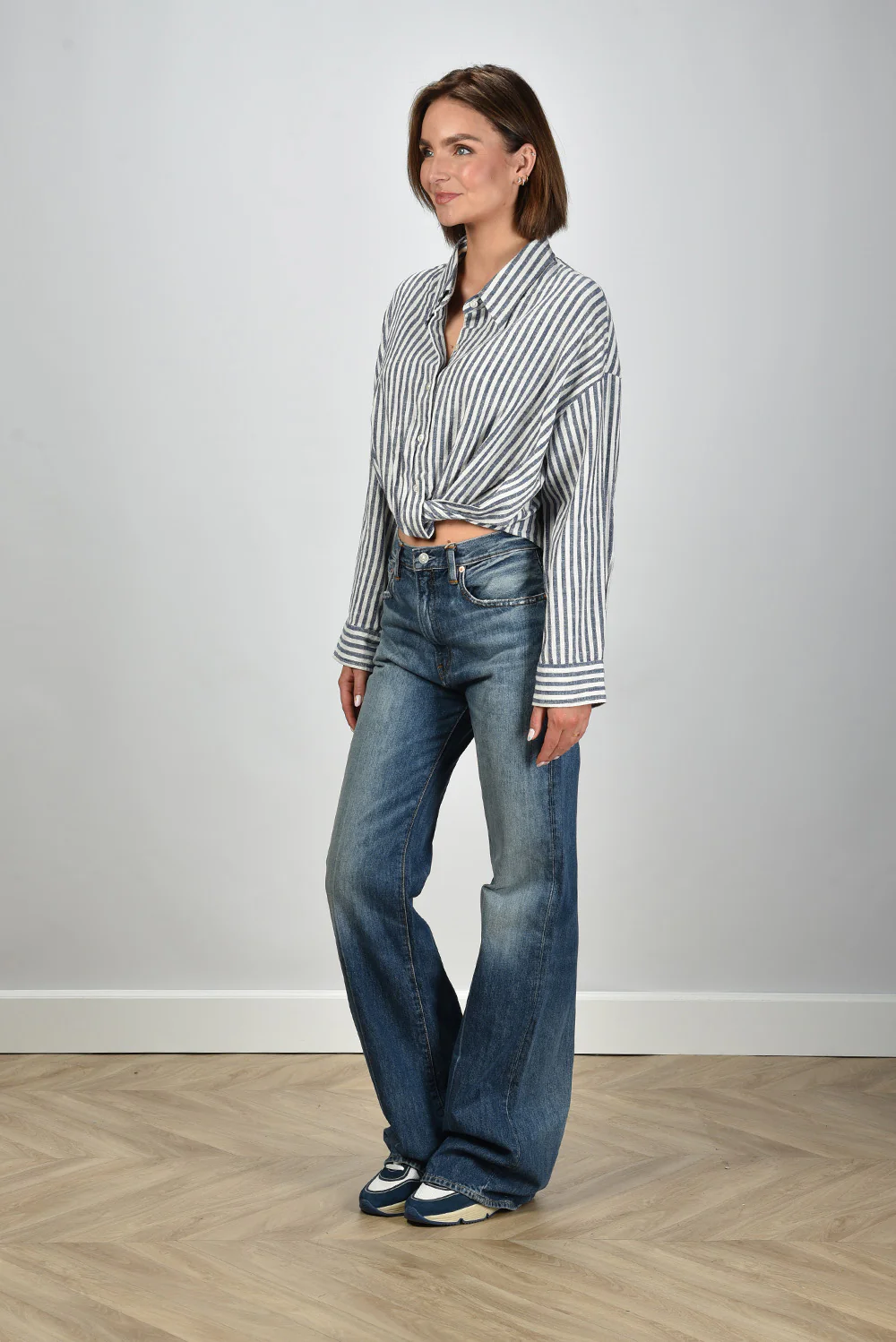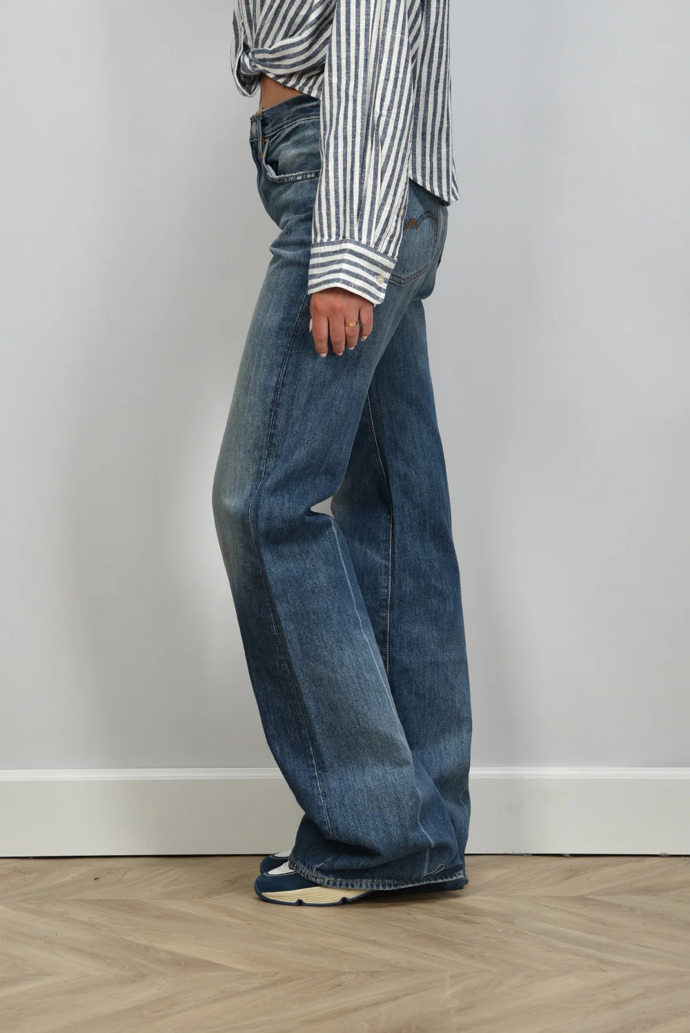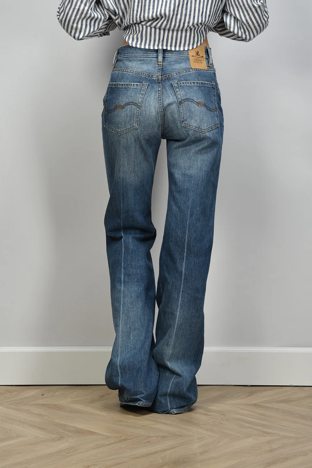 Dit is de jeans Dena fenmore blue van Denimist, met een straight basis en een wijd uitlopende pijp vanaf de knie. De vervaging op het bovenbeen en rond de knie geeft het denim een karakteristieke uitstraling die goed past bij het Amerikaanse label. De pijpen vallen ruim en raken net de vloer, waardoor de lengte mooi over je schoenen valt. Het stevige katoen voelt vol aan en houdt de vorm strak. Deze jeans valt wat kleiner, dus een maat groter kan prettiger zitten.