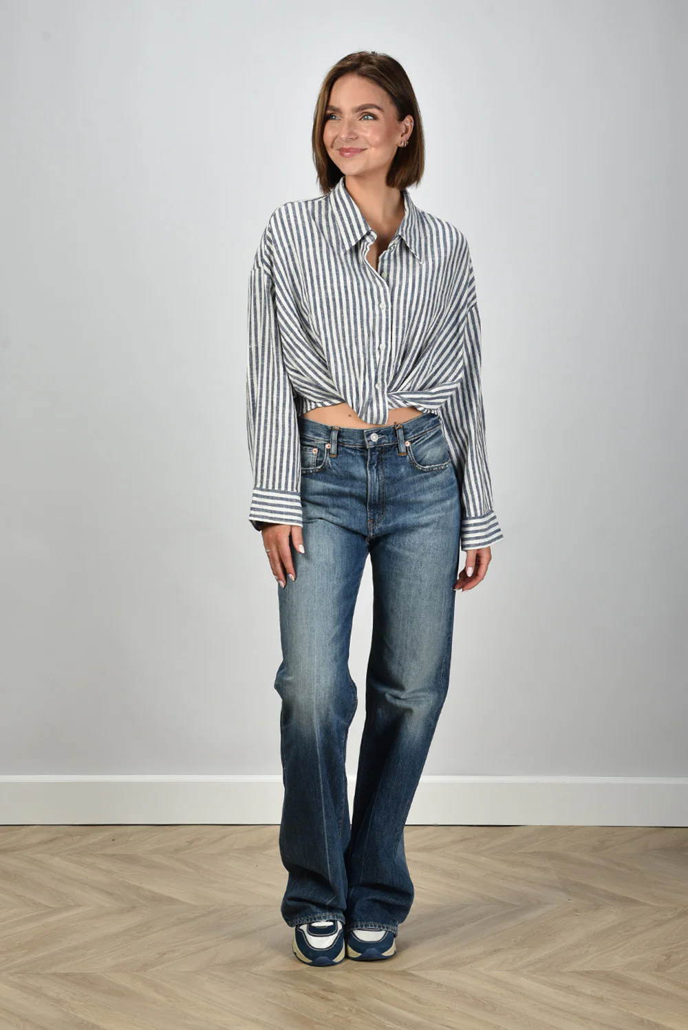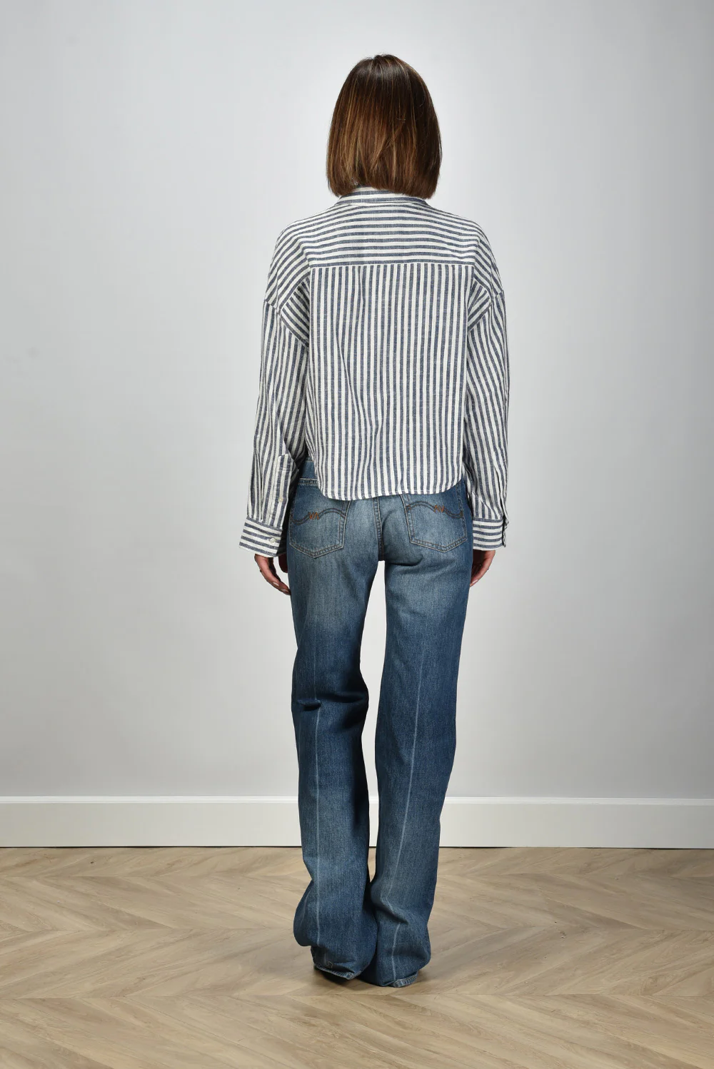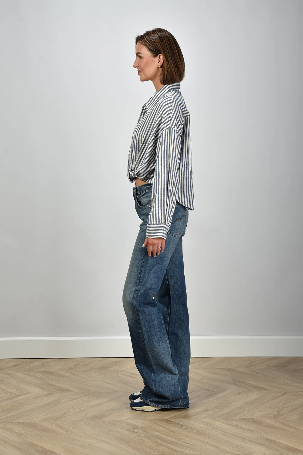 Dit is de jeans Dena fenmore blue van Denimist, met een straight basis en een wijd uitlopende pijp vanaf de knie. De vervaging op het bovenbeen en rond de knie geeft het denim een karakteristieke uitstraling die goed past bij het Amerikaanse label. De pijpen vallen ruim en raken net de vloer, waardoor de lengte mooi over je schoenen valt. Het stevige katoen voelt vol aan en houdt de vorm strak. Deze jeans valt wat kleiner, dus een maat groter kan prettiger zitten.
