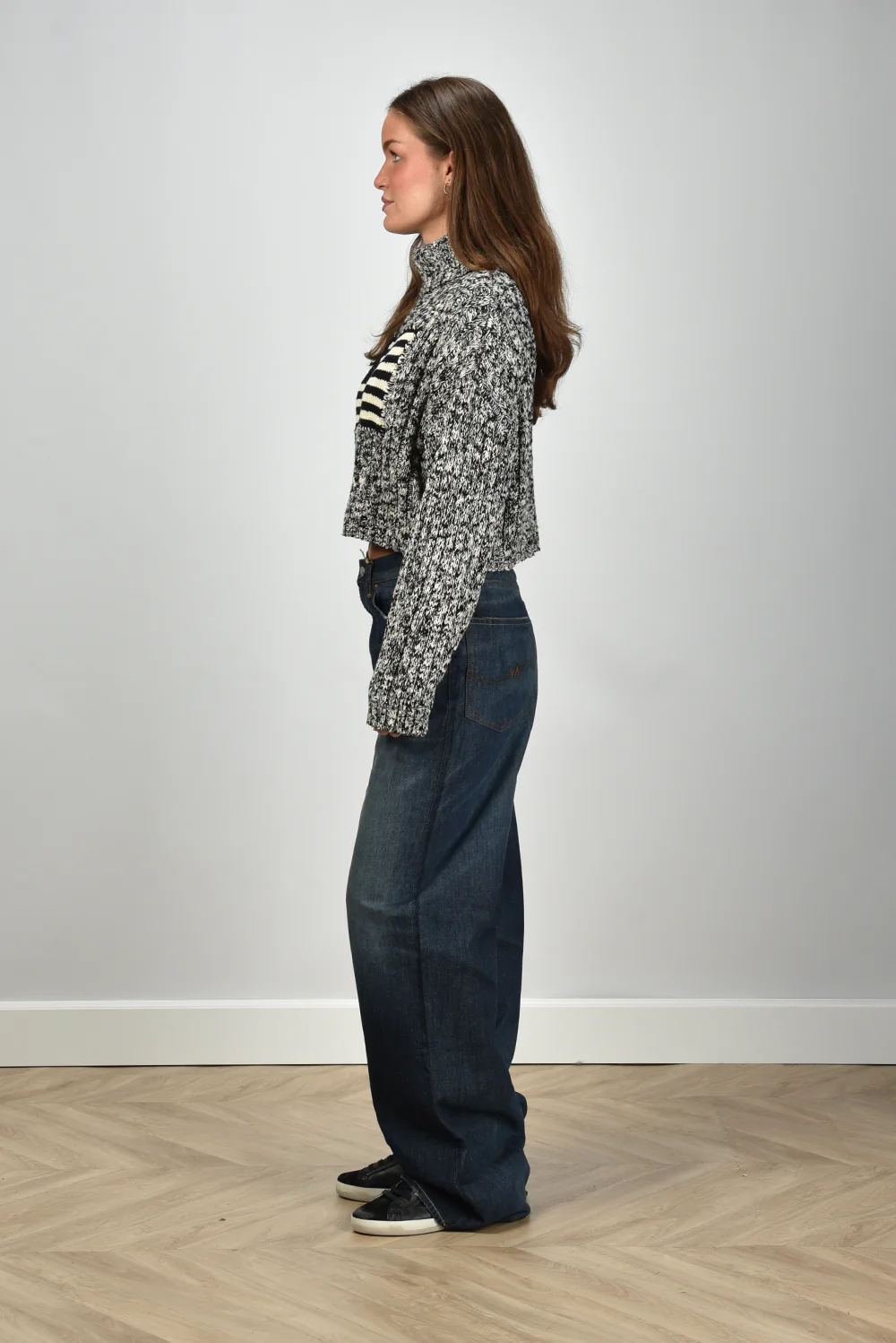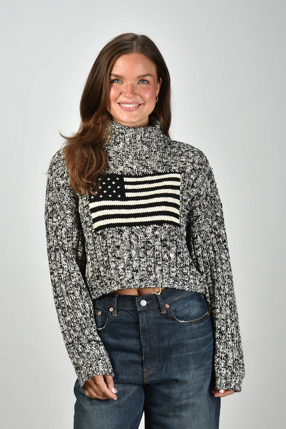 De trui American Flag van Denimist heeft die stoere nonchalance waar het merk om bekendstaat. Het grove breisel van 100% katoen voelt stevig en comfortabel aan, met een duidelijke structuur die meteen opvalt. De zwart-witte vlag op de voorkant geeft een grafisch accent dat het eenvoudige silhouet extra karakter geeft. De trui valt op maat, heeft een hoge col en een iets korter model dat mooi combineert met een high-waist jeans. Draag hem bijvoorbeeld met de Denimist jeans Teri voor een casual look met een uitgesproken randje.