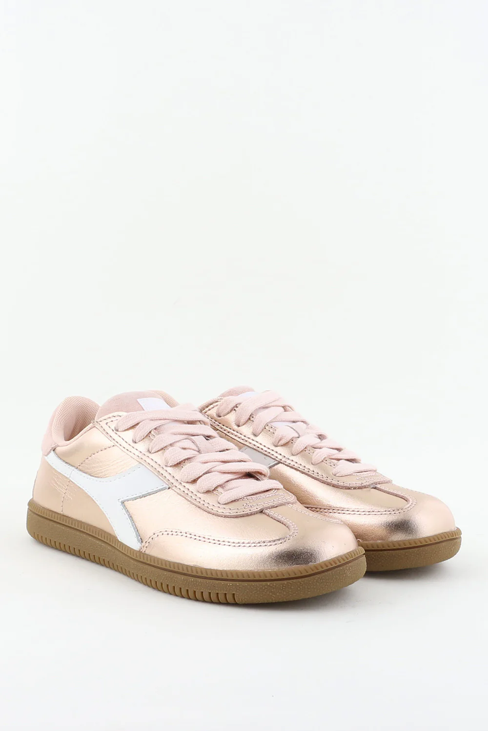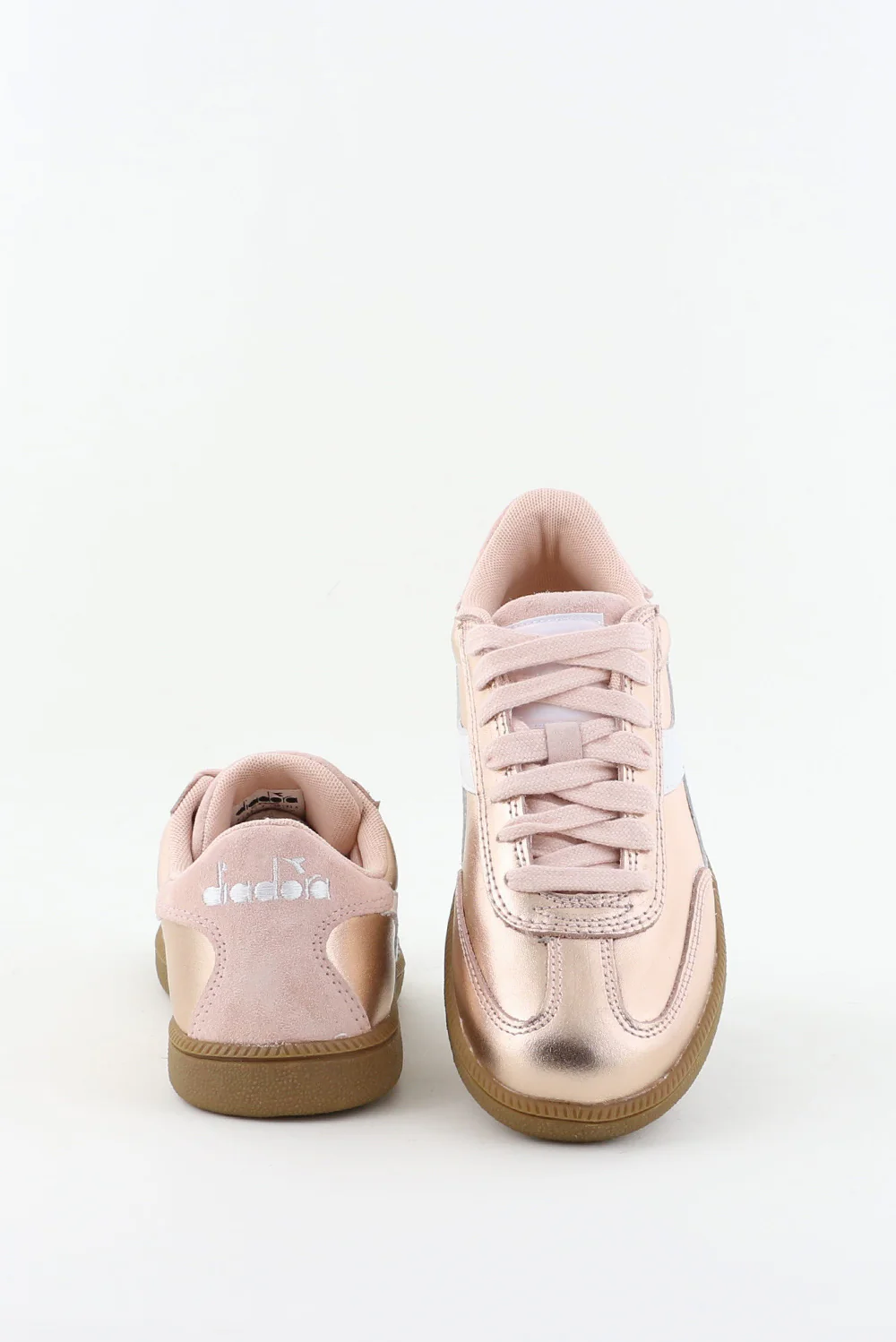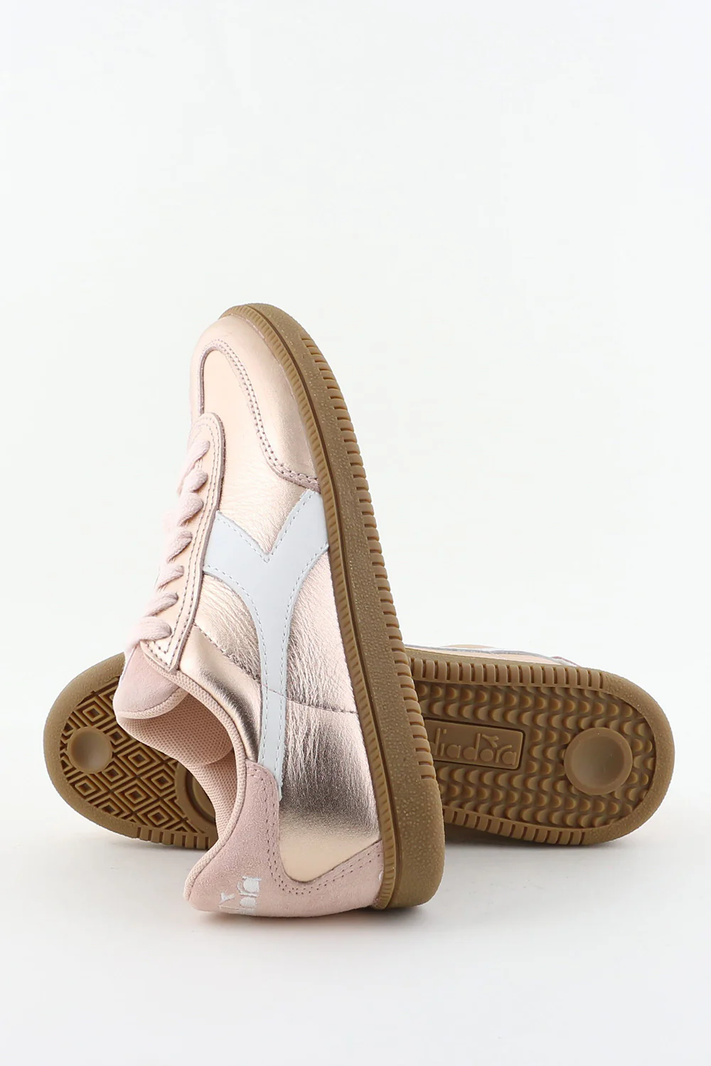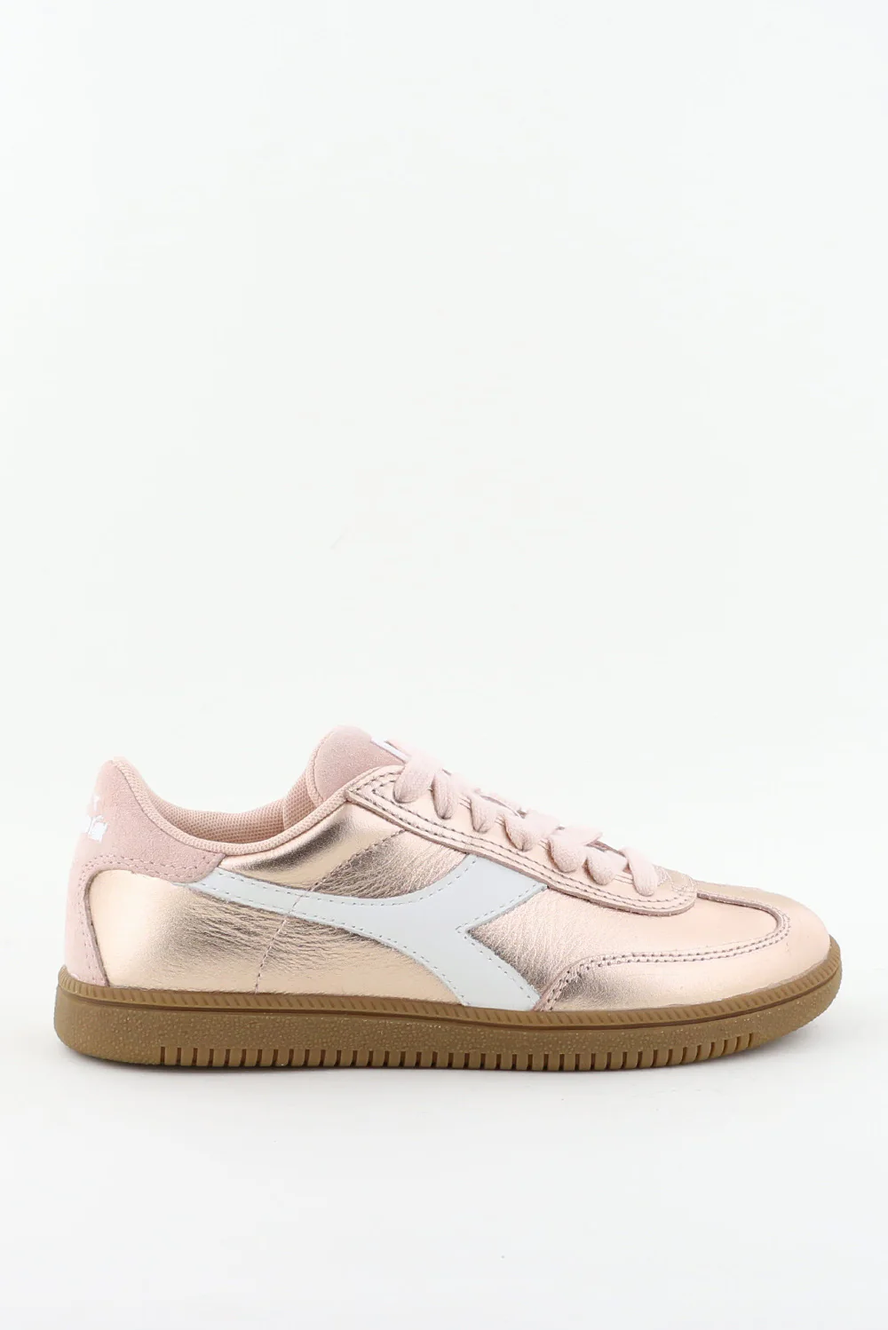 Hier zie je de sneakers Metallic pink van Diadora Heritage. De metallic roze tint valt meteen op en krijgt een zachte tegenhanger door het suede dat langs de panelen loopt. Het grote witte logo aan de zijkant geeft de sneaker een stevige, sportieve lijn. De bruine zool met de getande rand zorgt voor grip en voelt licht tijdens het lopen. Door het metallic leer blijft de vorm mooi strak. Deze sneaker valt een maat kleiner, dus een maat groter kan prettiger zitten. Diadora Heritage brengt hier opnieuw hun Italiaanse sportachtergrond samen met nauwkeurig vakmanschap.