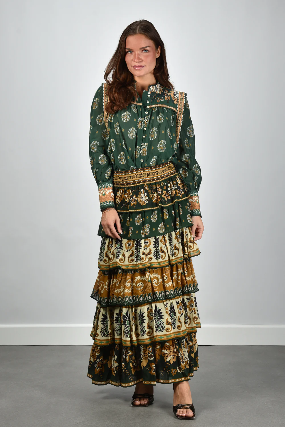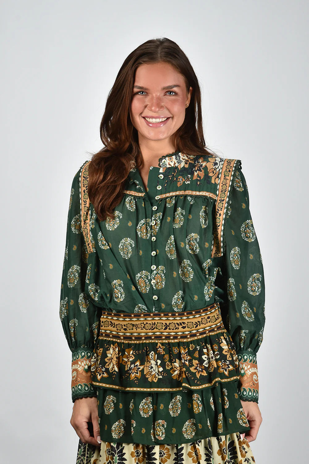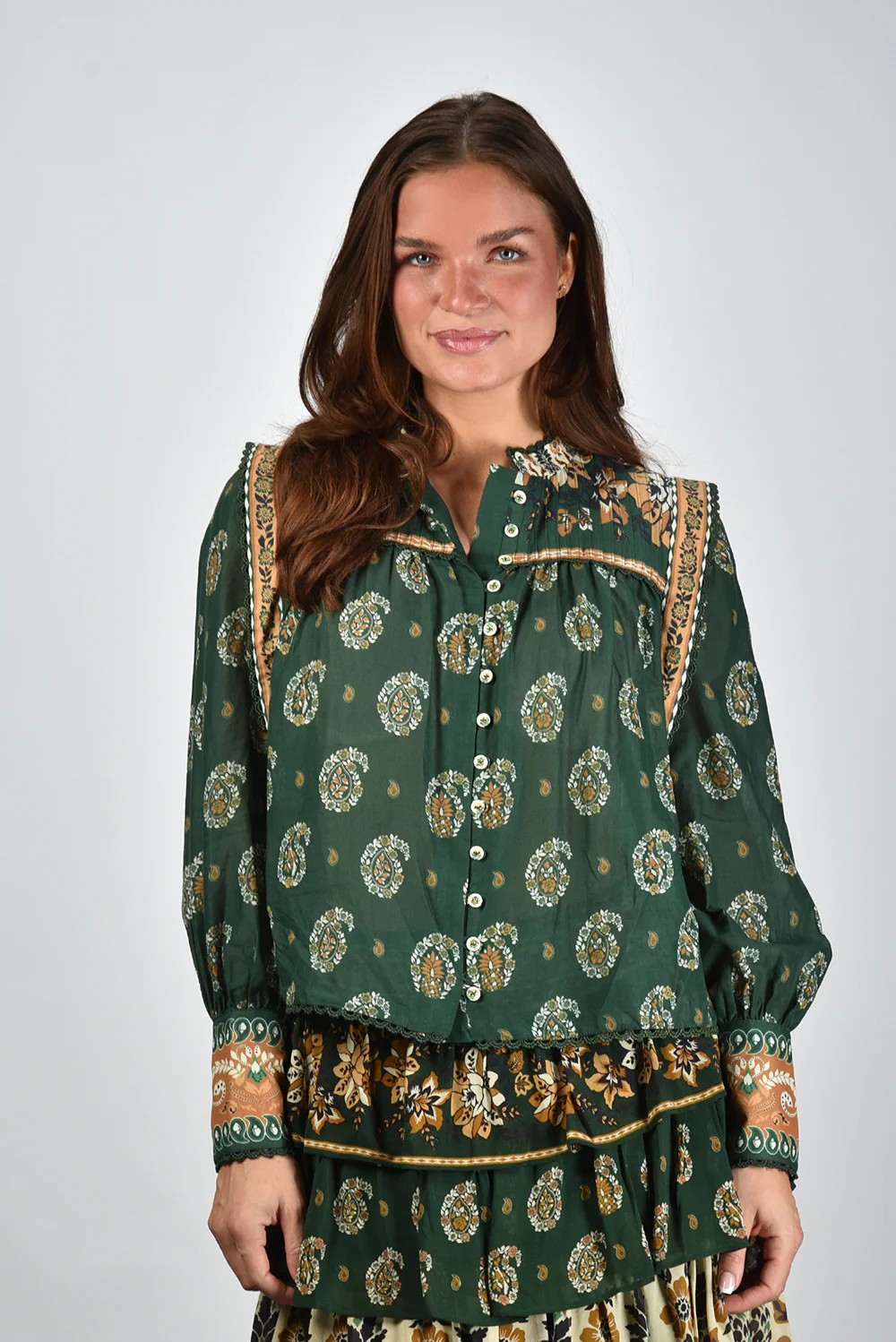 De blouse multicolour van Farm Rio vangt meteen de aandacht met haar rijke mix van kleuren en patronen. Het model heeft opvallende pofmouwen en een opstaande kraag die zijn afgewerkt met gebloemde sierlijsten. De paisleyprint in donkergroen, lichtgroen en okergeel geeft het item een levendig karakter. De 100% katoenen stof voelt fris en soepel aan, fijn voor de huid en geschikt voor alle seizoenen. De blouse valt normaal op maat, dus je kunt gerust je eigen maat kiezen. Combineer haar met de bijpassende Farm Rio rok 251136 ayla green voor een samenhangend geheel dat speels en elegant oogt. Elk ontwerp van Farm Rio vertelt zijn eigen verhaal vol kleur en karakter, en deze blouse vormt daarop geen uitzondering.