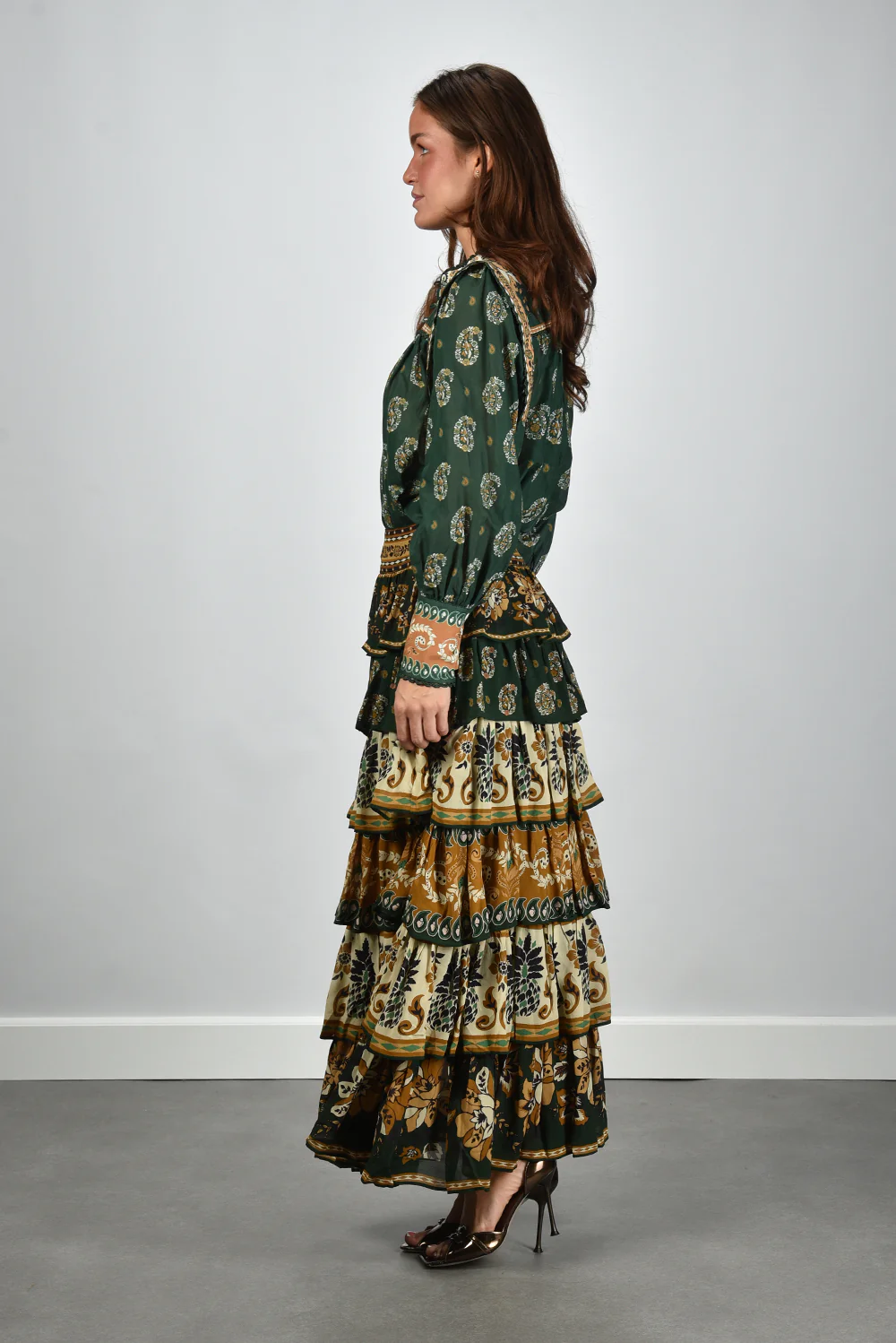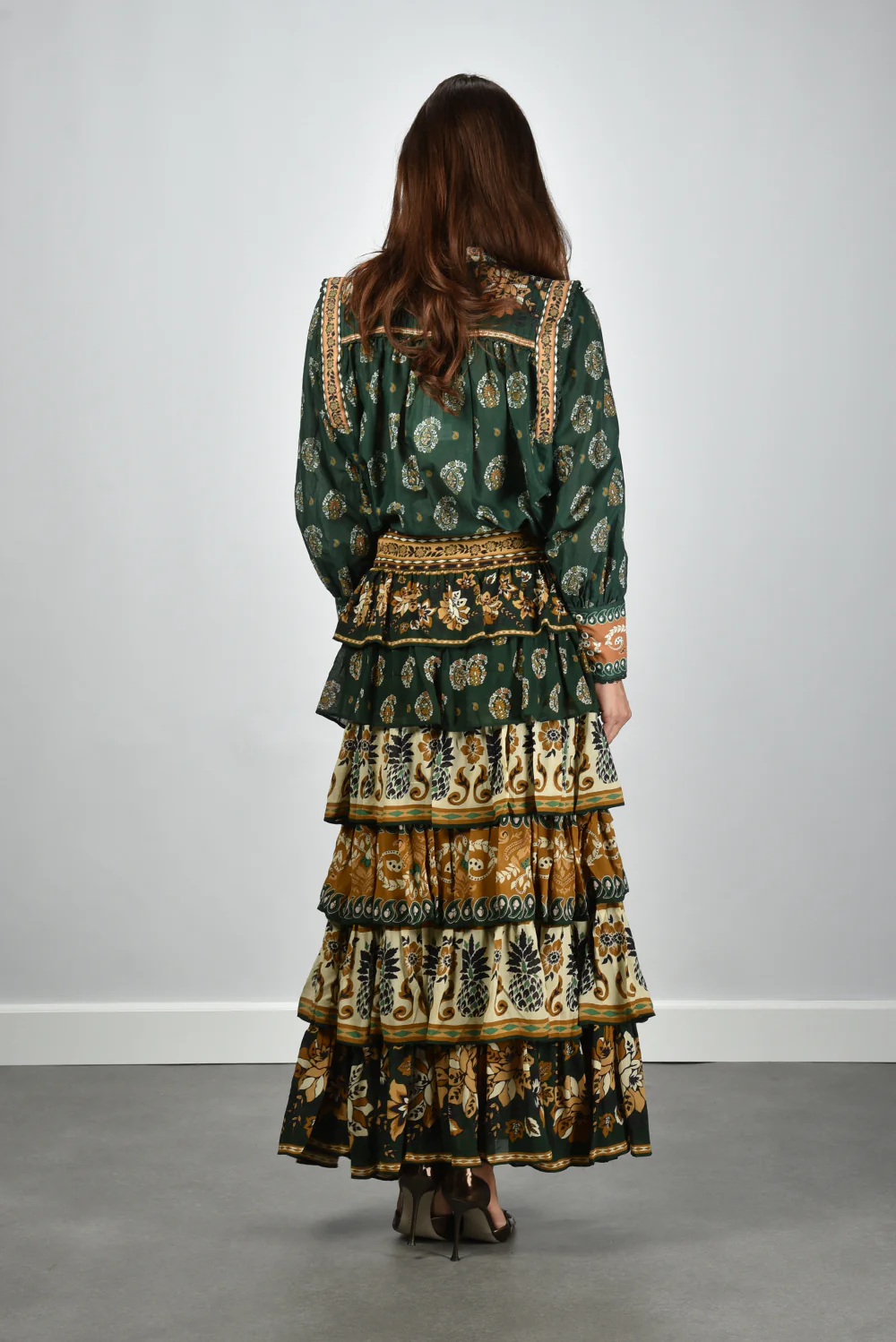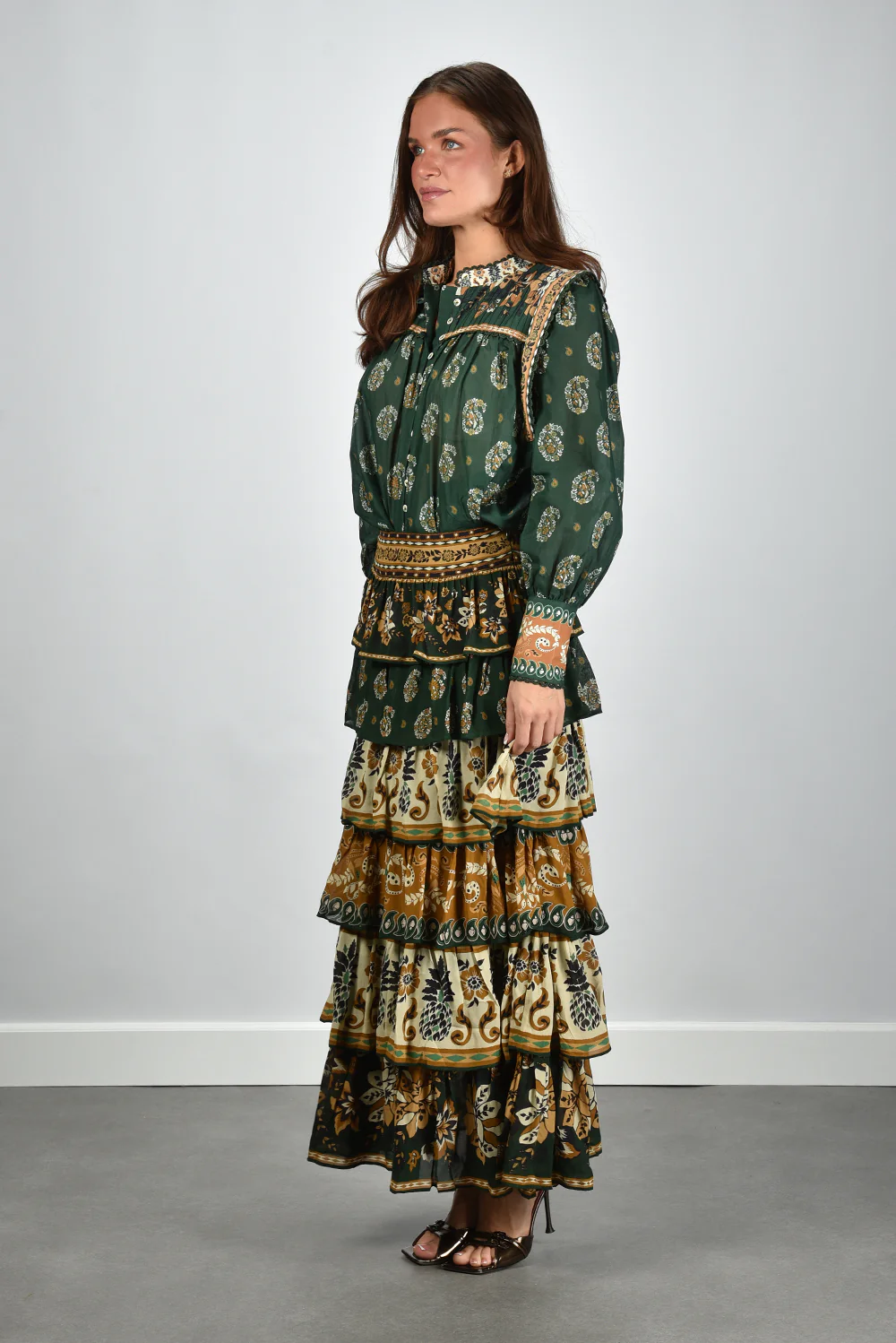 De blouse multicolour van Farm Rio vangt meteen de aandacht met haar rijke mix van kleuren en patronen. Het model heeft opvallende pofmouwen en een opstaande kraag die zijn afgewerkt met gebloemde sierlijsten. De paisleyprint in donkergroen, lichtgroen en okergeel geeft het item een levendig karakter. De 100% katoenen stof voelt fris en soepel aan, fijn voor de huid en geschikt voor alle seizoenen. De blouse valt normaal op maat, dus je kunt gerust je eigen maat kiezen. Combineer haar met de bijpassende Farm Rio rok 251136 ayla green voor een samenhangend geheel dat speels en elegant oogt. Elk ontwerp van Farm Rio vertelt zijn eigen verhaal vol kleur en karakter, en deze blouse vormt daarop geen uitzondering.