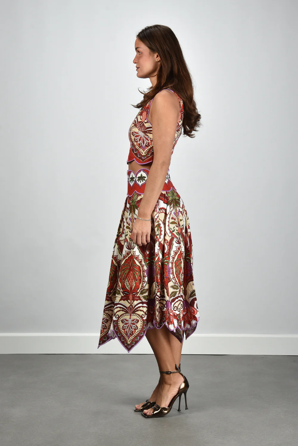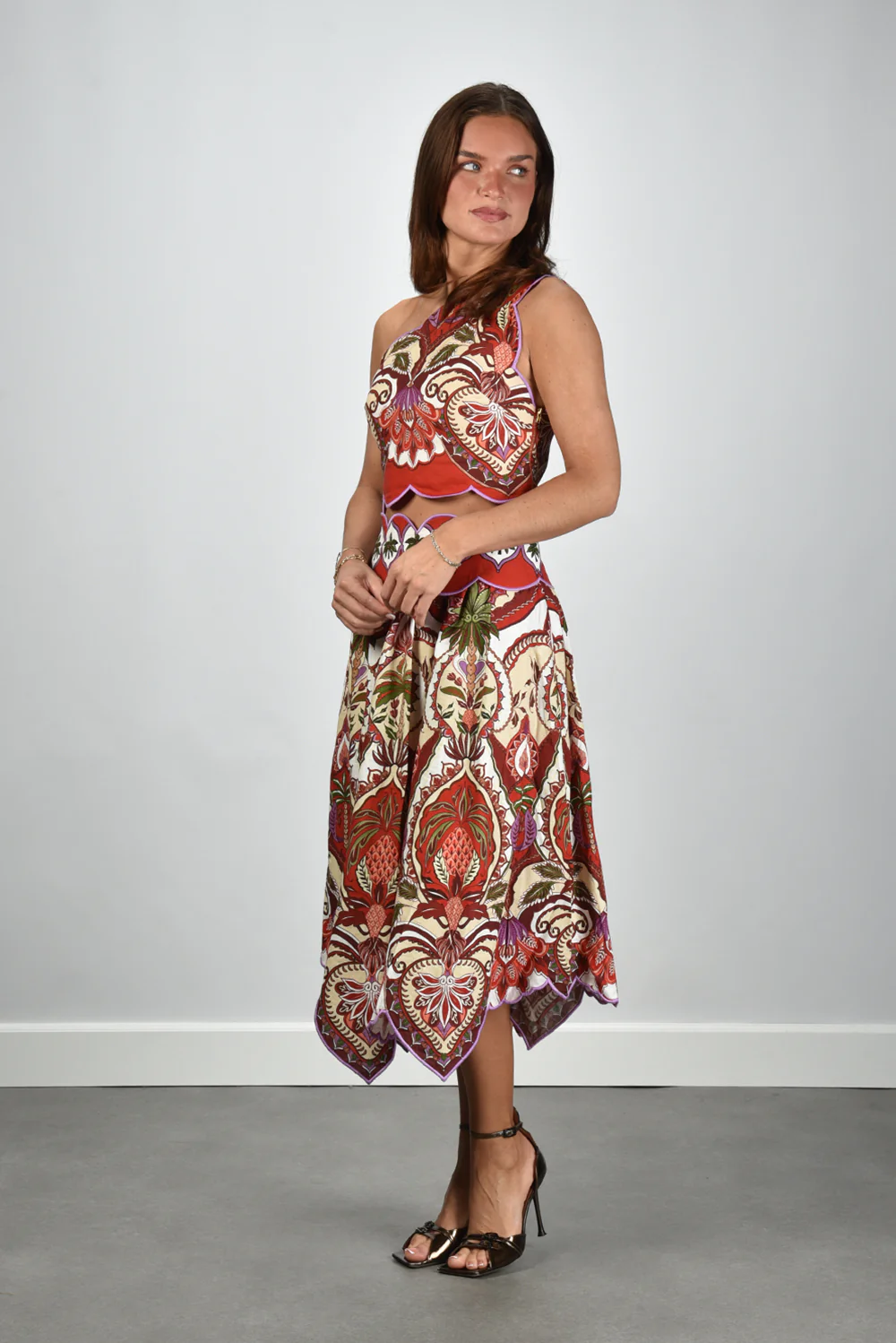 De one shoulder top Odara rood van Farm Rio trekt meteen de aandacht met haar asymmetrische halslijn en levendige print. De combinatie van rood, paars, groen en crème geeft het dessin die typische Braziliaanse energie waar Farm Rio om bekendstaat. De top is gemaakt van linnen en viscose, wat zorgt voor een luchtig en soepel gevoel op de huid. De geschulpte zomen langs taille en onderkant zorgen voor een speelse afwerking die mooi soepel valt. Deze top valt normaal op maat en vormt een opvallende basis voor zomerse looks. Draag haar met de Morobe sandalen Abbie 03 bronze specchio voor een elegante, zonnige combinatie.