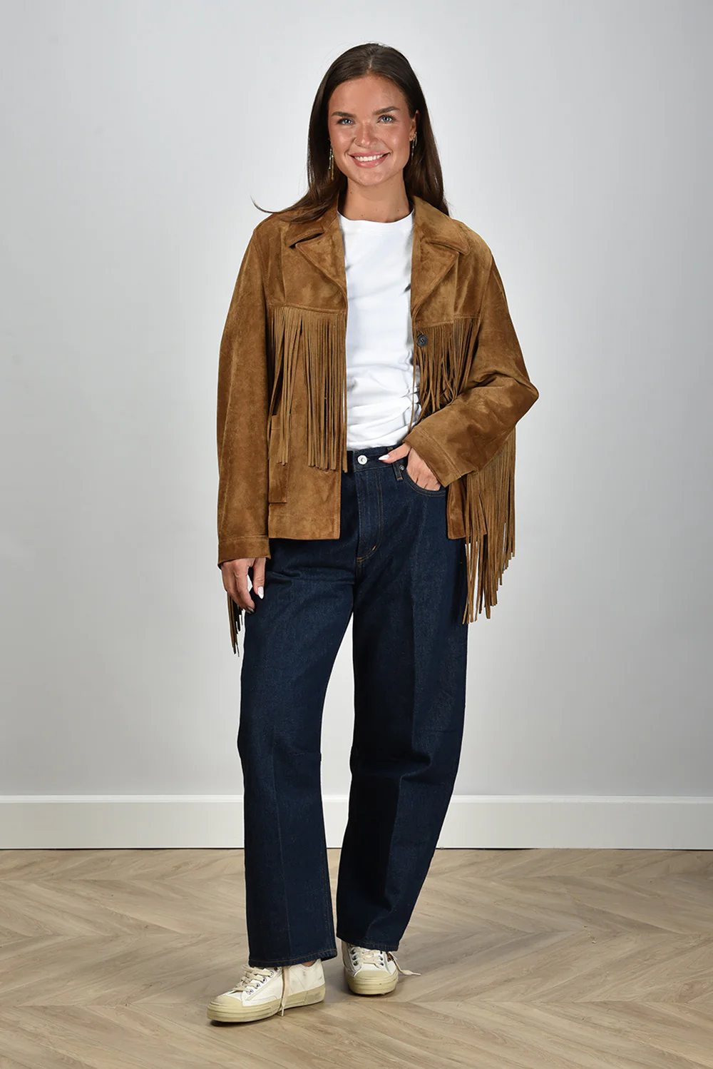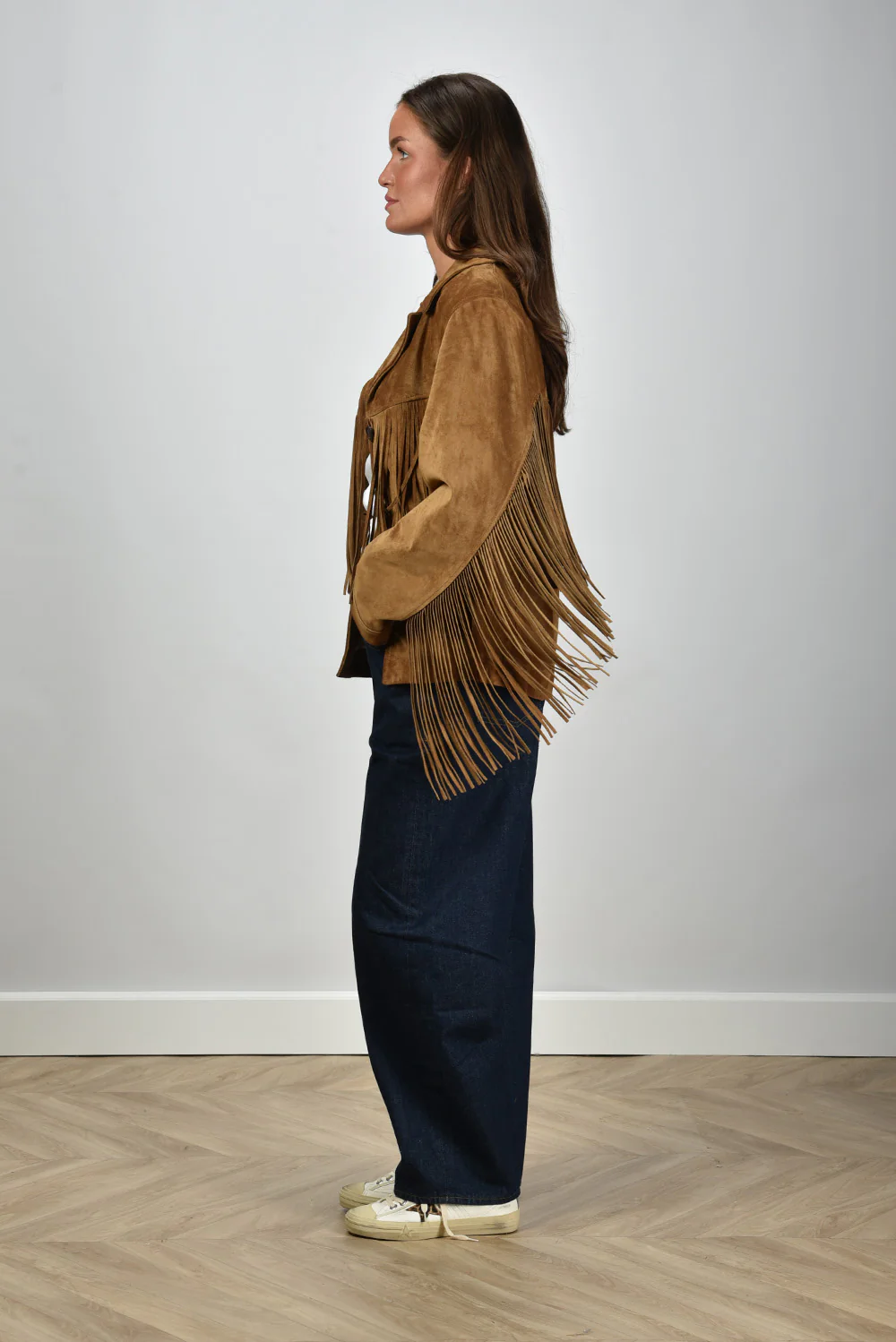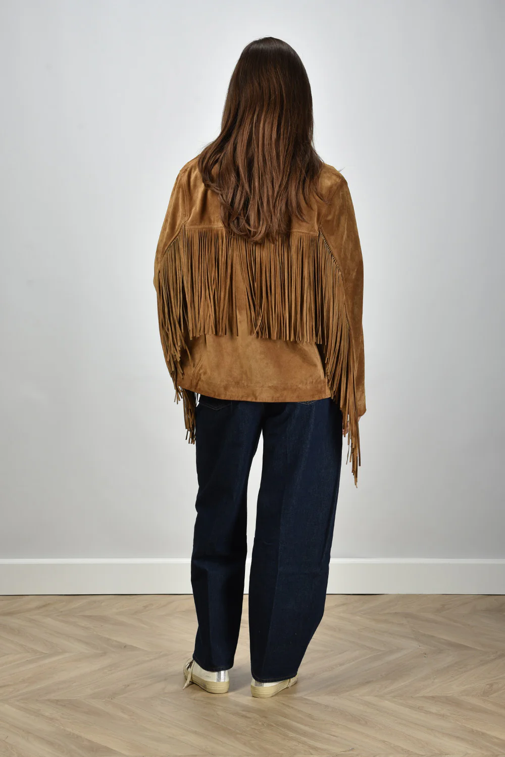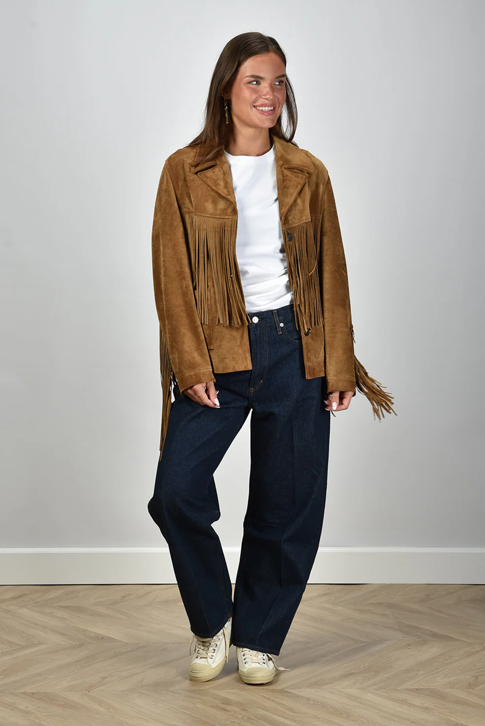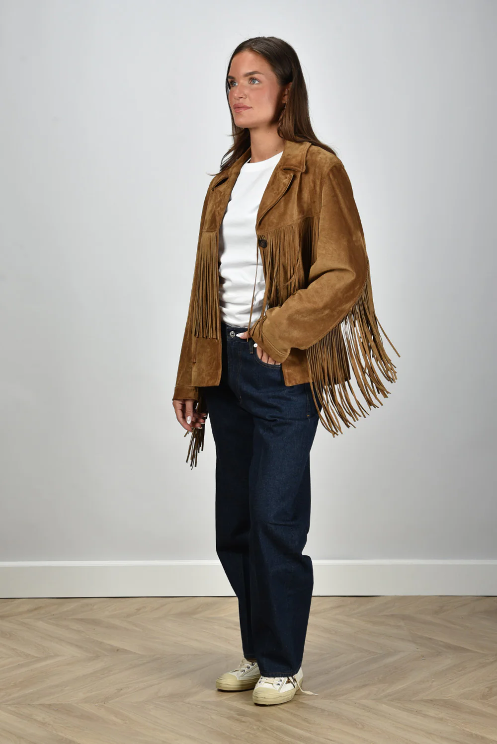 Het jack tabasco bruin van Golden Goose is zo’n item dat direct karakter toont. Gemaakt van 100% leer met een warme tabasco brown tint. De franjes langs de mouwen en borst geven het silhouet extra flair en een stoere knipoog. De puntige kraag en donkere knopen zorgen voor een klassieke western-touch, zonder dat het te uitgesproken wordt. De pasvorm valt normaal op maat en sluit mooi aan. Draag dit leren jack op de Citizens of Humanity jeans Miro amherst voor een ontspannen, maar doordachte look. Golden Goose staat bekend om zijn Italiaanse vakmanschap en eigenzinnige stijl, en dat voel je in elk detail van dit jack.
