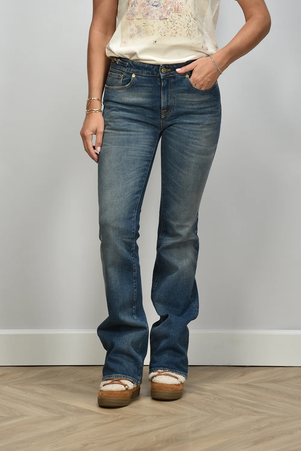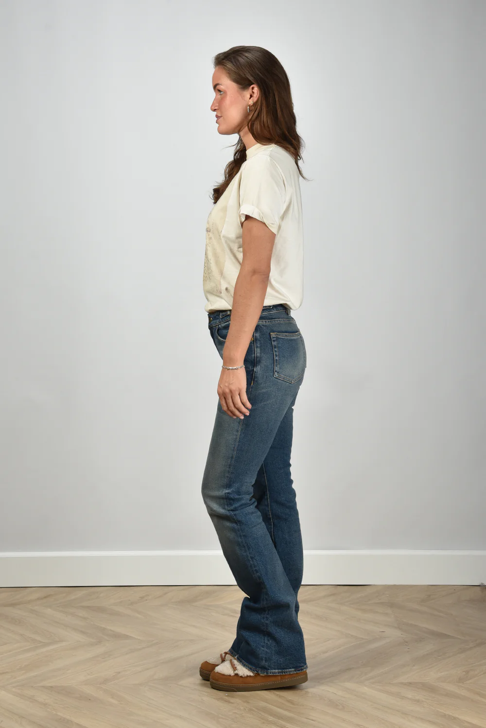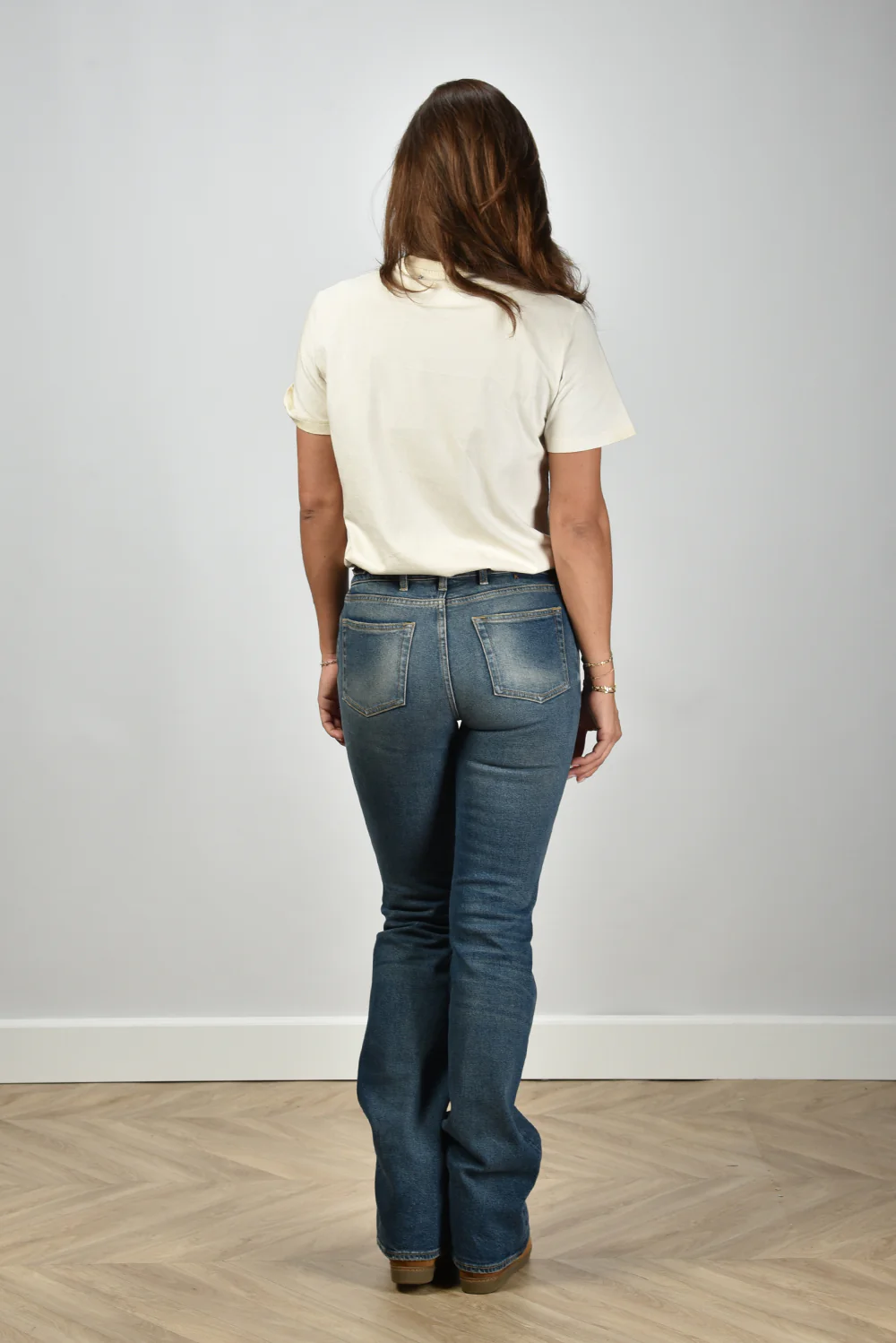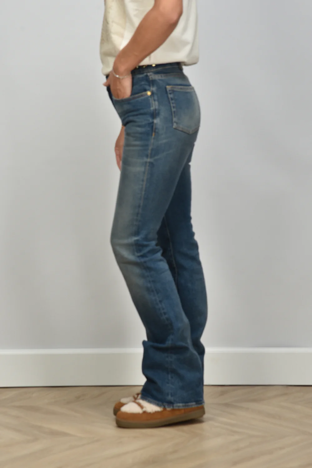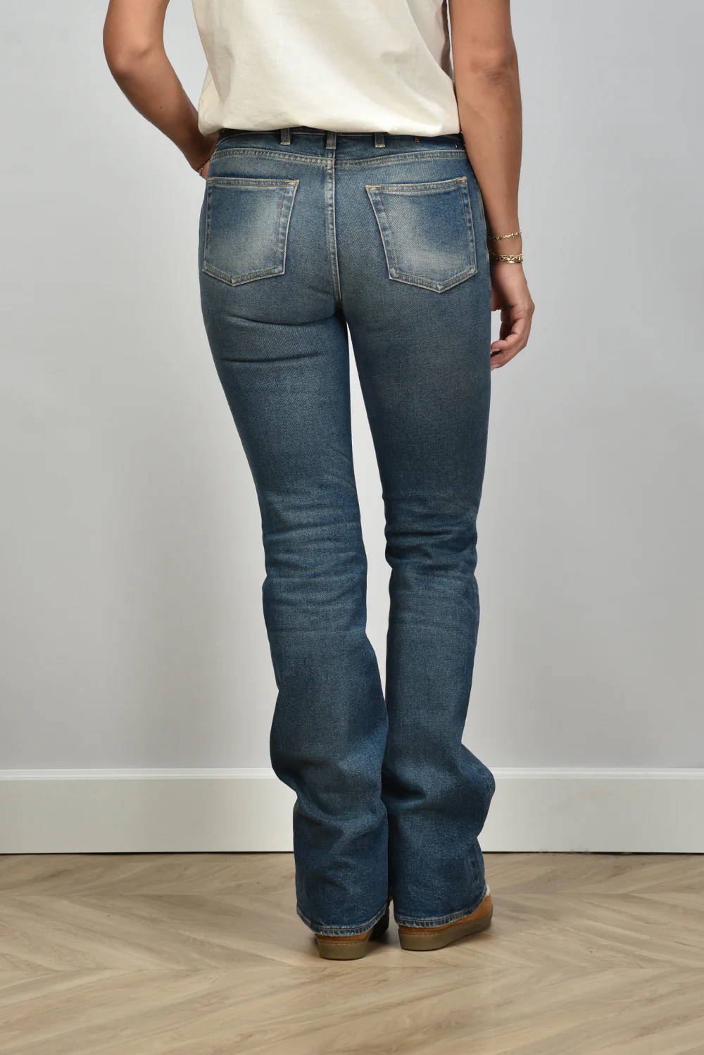 De jeans bootcut van Golden Goose heeft een ontspannen blauwe wassing die elk seizoen past. De lichte vervaging op de bovenbenen en knieën geeft het denim karakter zonder te overdrijven. De licht uitlopende pijpen zorgen voor een mooie lijn langs het been. Gemaakt van 99% katoen met een vleugje elastaan voor een soepele pasvorm. Deze jeans valt één maat kleiner, dus neem bij twijfel een maat groter. Mooi te dragen met de Isabel Marant enkellaarsjes Nowles in ecru en cognac voor een gebalanceerde look. Een item waarin het vakmanschap van Golden Goose goed zichtbaar is, met stiksels en een vleugje nonchalance dat kenmerkend is voor het merk.