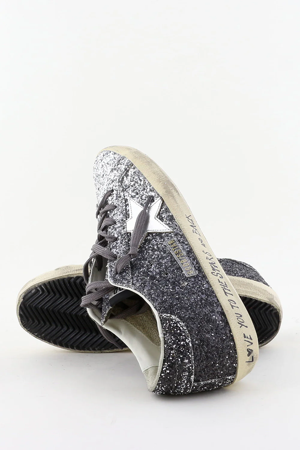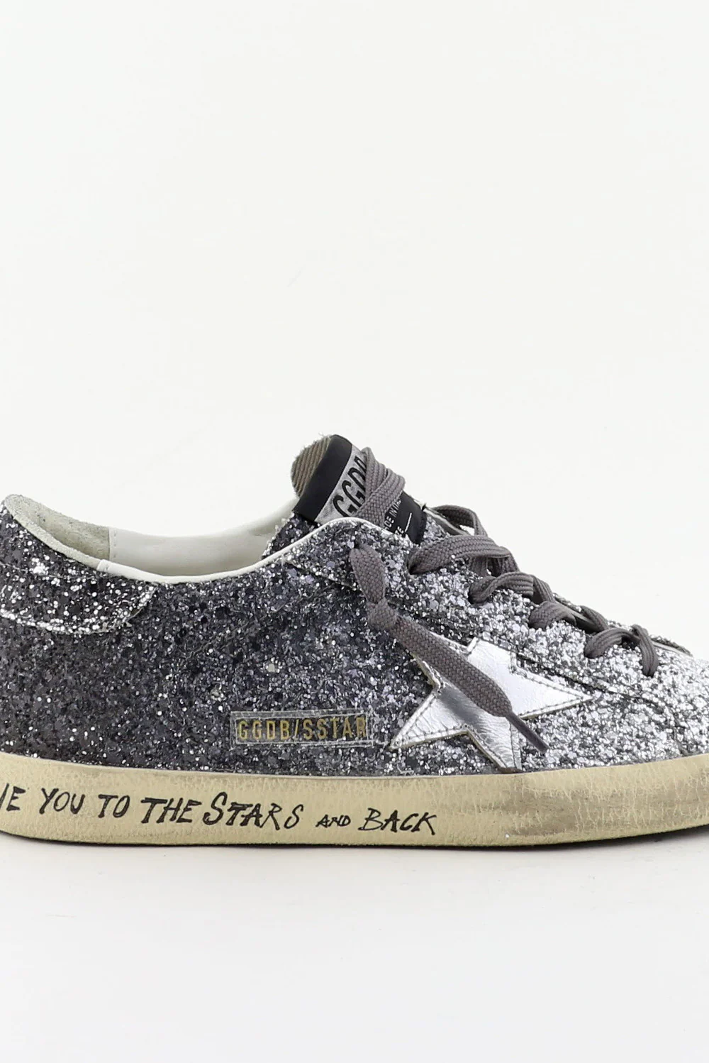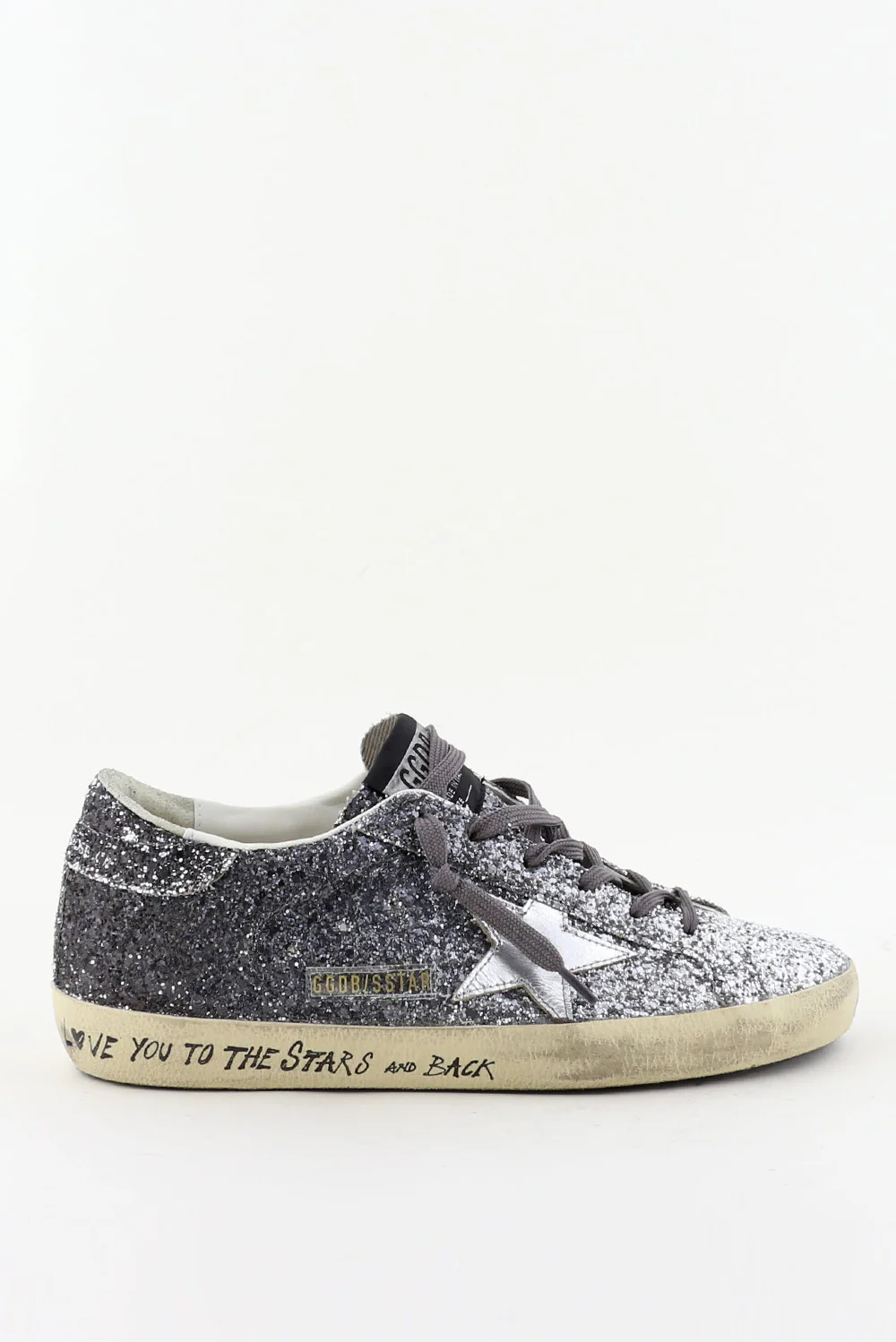 De sneakers Superstar zilver van Golden Goose trekken direct de aandacht met hun grove glitters die van diepgrijs naar licht zilver overlopen. De iconische ster op de zijkant vangt subtiel het licht en benadrukt het stoere karakter van het ontwerp. De geleefde zool met de handgeschreven tekst ‘LOVE YOU TO THE STARS AND BACK’ geeft de sneaker de herkenbare Golden Gooseāsignatuur. Gemaakt met Italiaans vakmanschap en een rebelse touch, zoals je van dit merk gewend bent. De fit valt normaal, dus bestel gerust je eigen maat. Draag ze bijvoorbeeld bij de Golden Goose sneakers Superstar white light pink voor een speels contrast binnen dezelfde lijn.