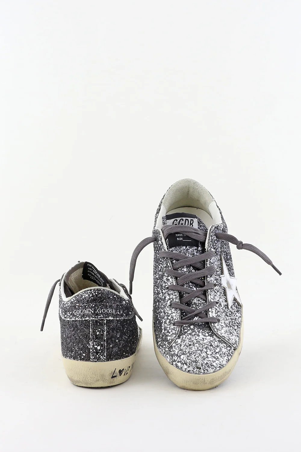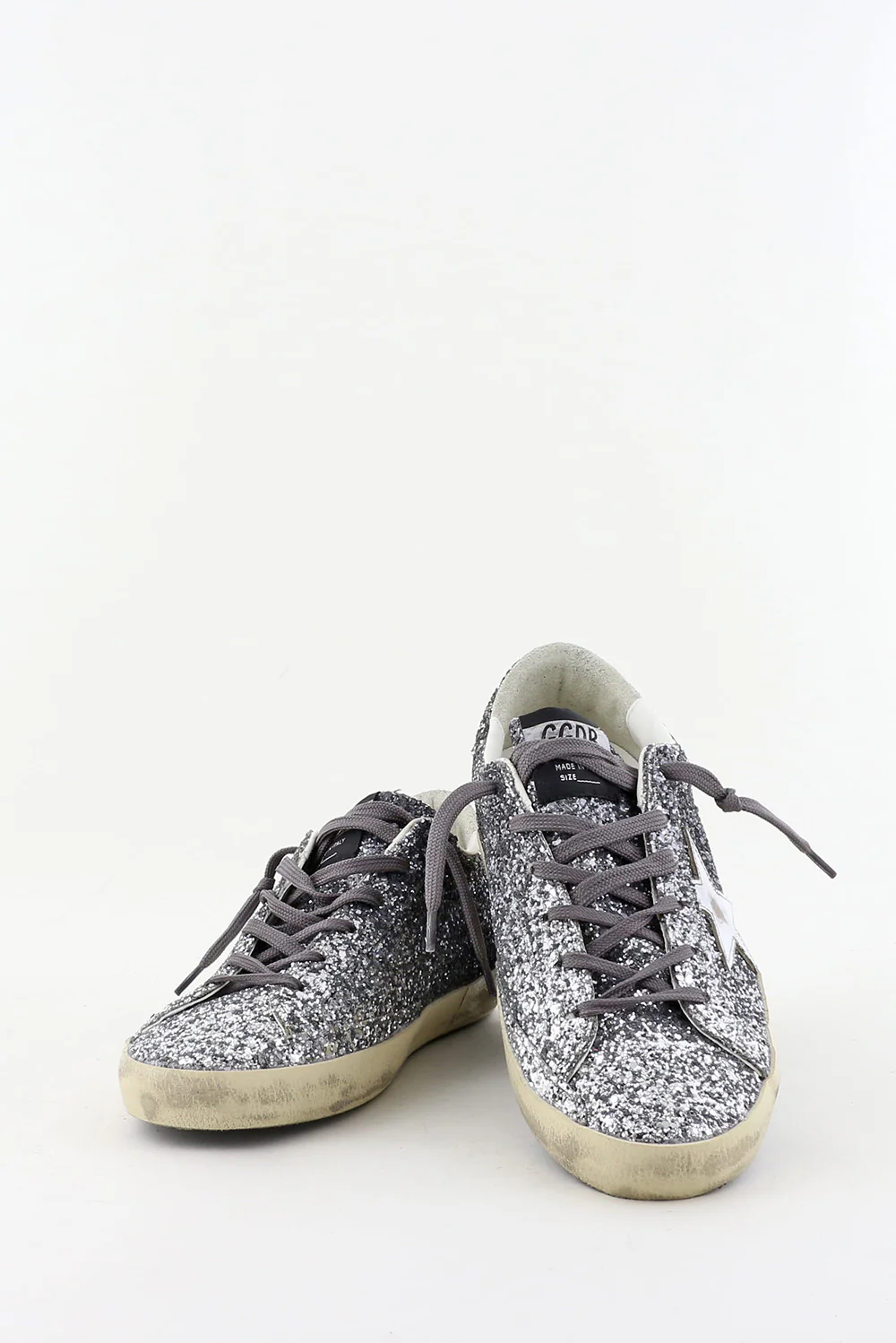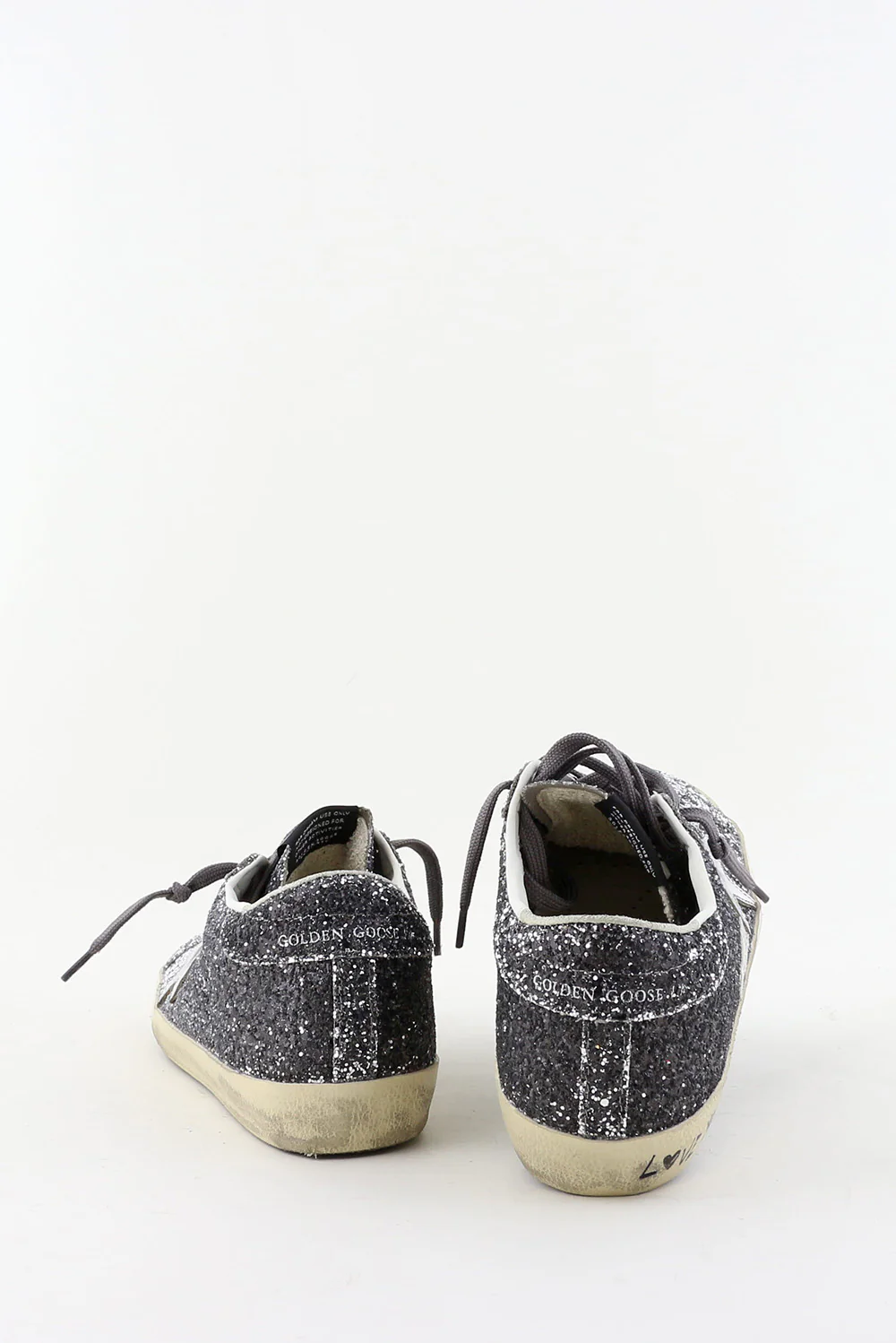 De sneakers Superstar zilver van Golden Goose trekken direct de aandacht met hun grove glitters die van diepgrijs naar licht zilver overlopen. De iconische ster op de zijkant vangt subtiel het licht en benadrukt het stoere karakter van het ontwerp. De geleefde zool met de handgeschreven tekst ‘LOVE YOU TO THE STARS AND BACK’ geeft de sneaker de herkenbare Golden Gooseāsignatuur. Gemaakt met Italiaans vakmanschap en een rebelse touch, zoals je van dit merk gewend bent. De fit valt normaal, dus bestel gerust je eigen maat. Draag ze bijvoorbeeld bij de Golden Goose sneakers Superstar white light pink voor een speels contrast binnen dezelfde lijn.
