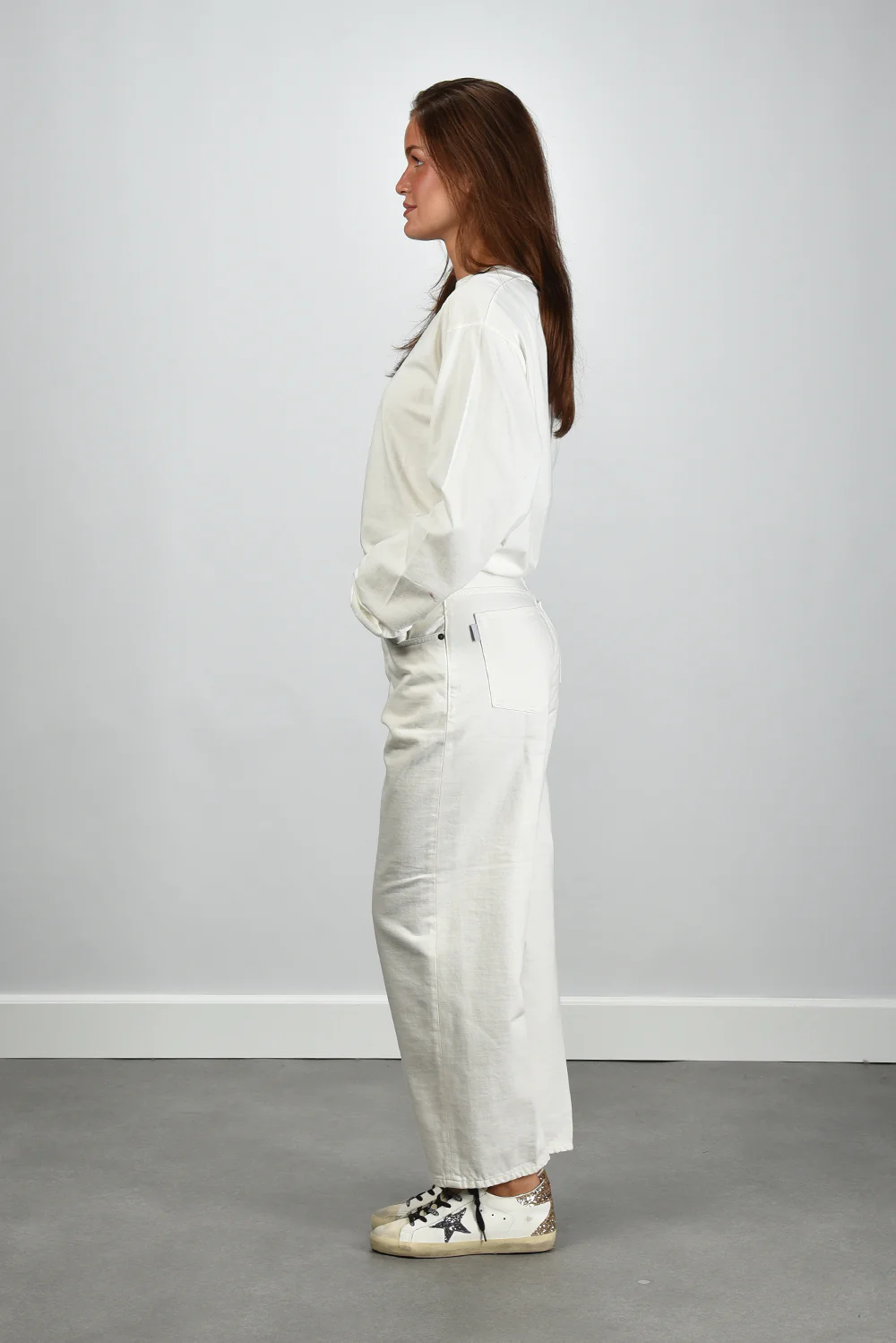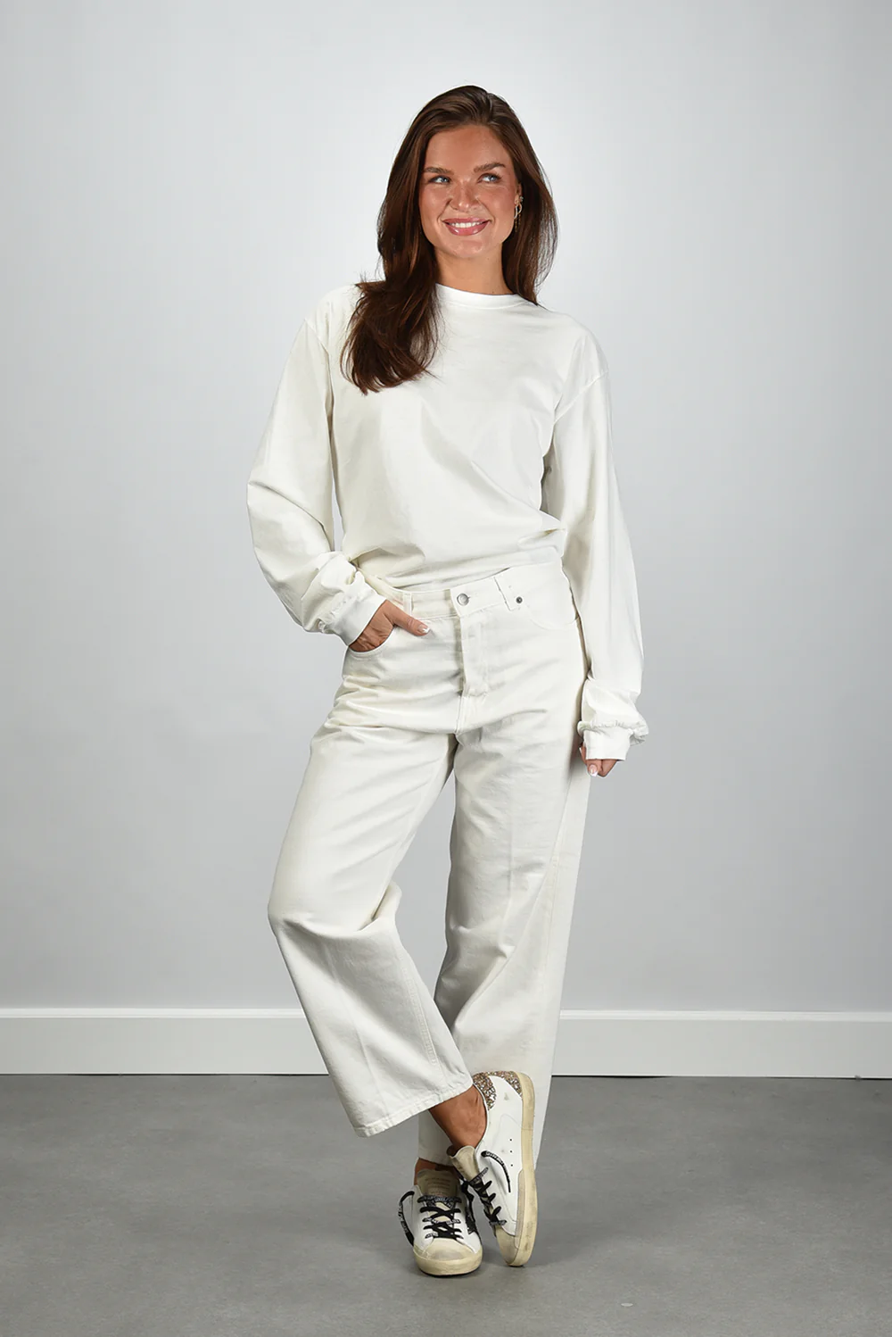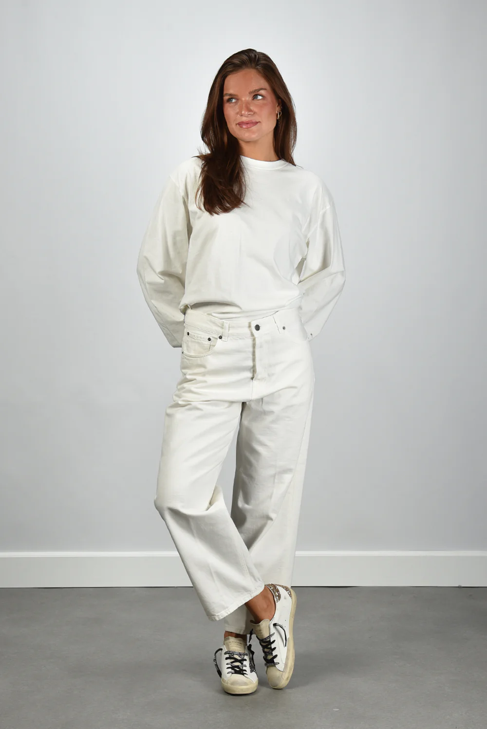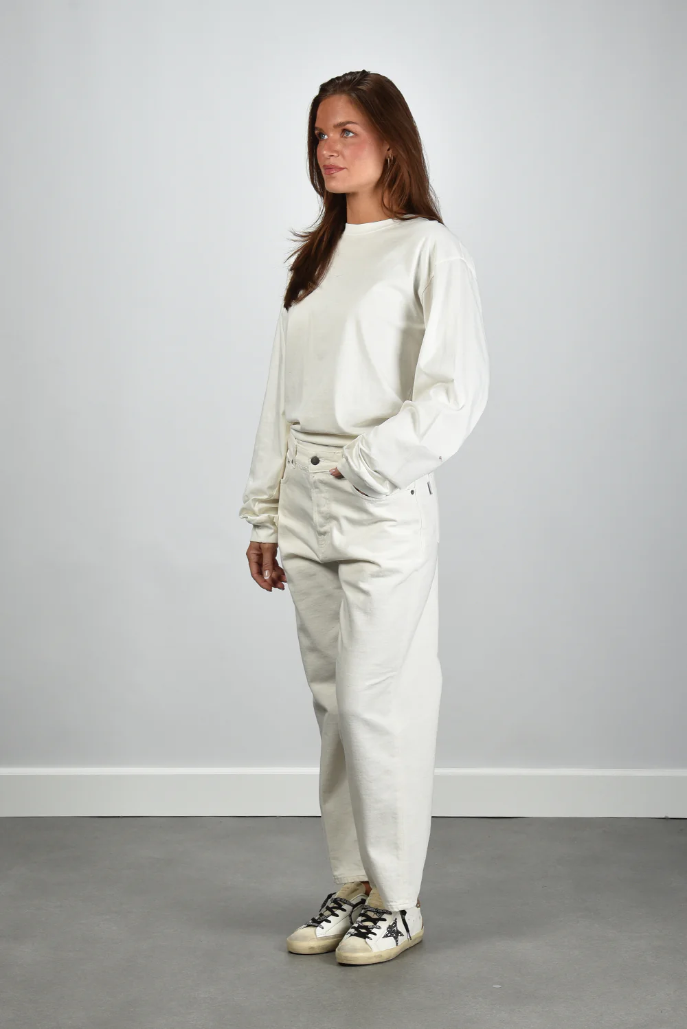 Het Haikure t-shirt Ellys in wit heeft een ontspannen, lange mouw en een ronde hals zonder opvallende afwerking. De zachte stof van 100% katoen voelt stevig en soepel tegelijk. De kleur is off white, een rustige tint die fris oogt en goed te stylen is. Dit model valt normaal op maat en heeft door de lichte plooivorming bij de polsen een subtiel nonchalant effect. Mooi bij denim of een wijde pantalon voor een verzorgde, eenvoudige look. Combineer met de Golden Goose sneakers Superstar voor een casual en moderne uitstraling.