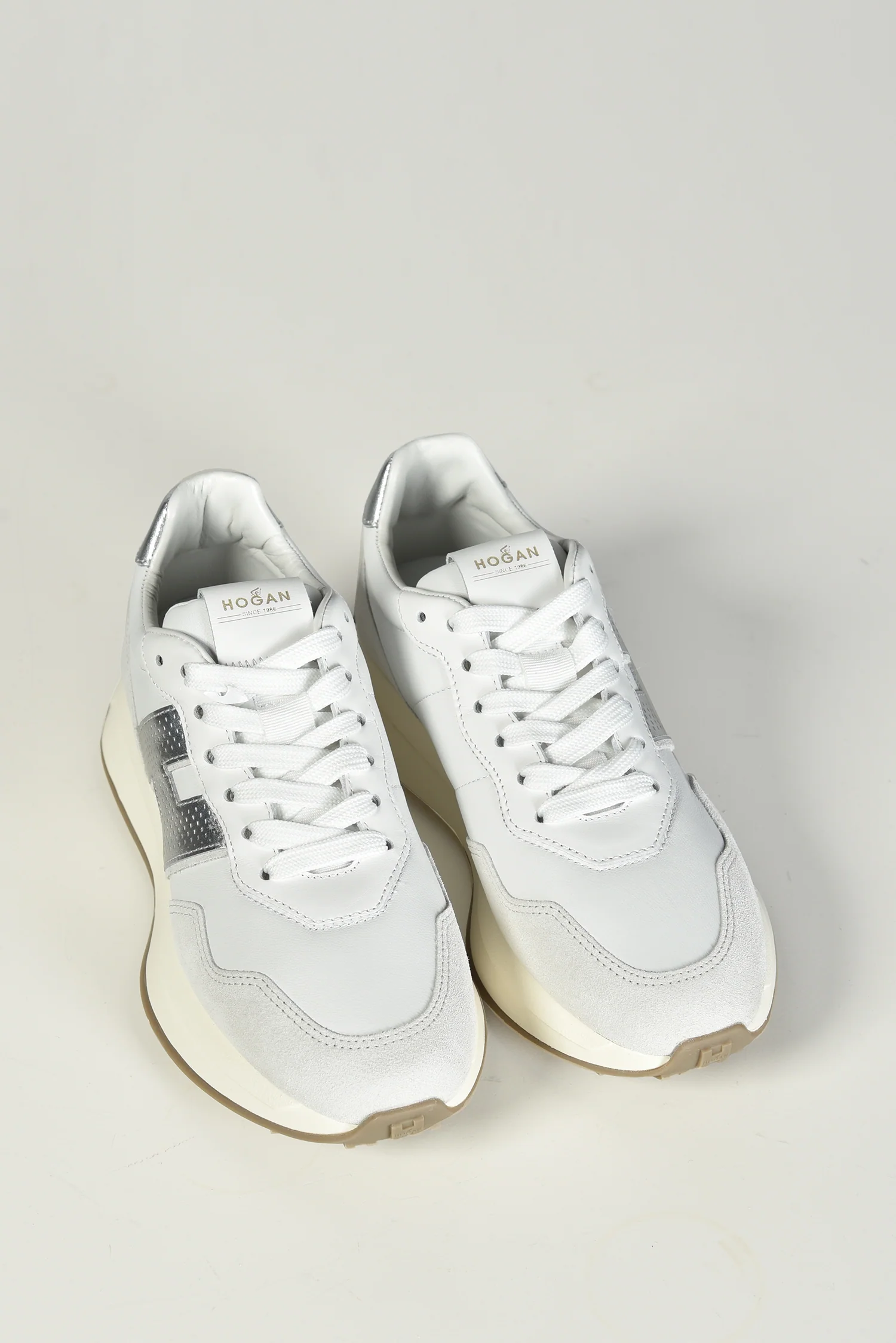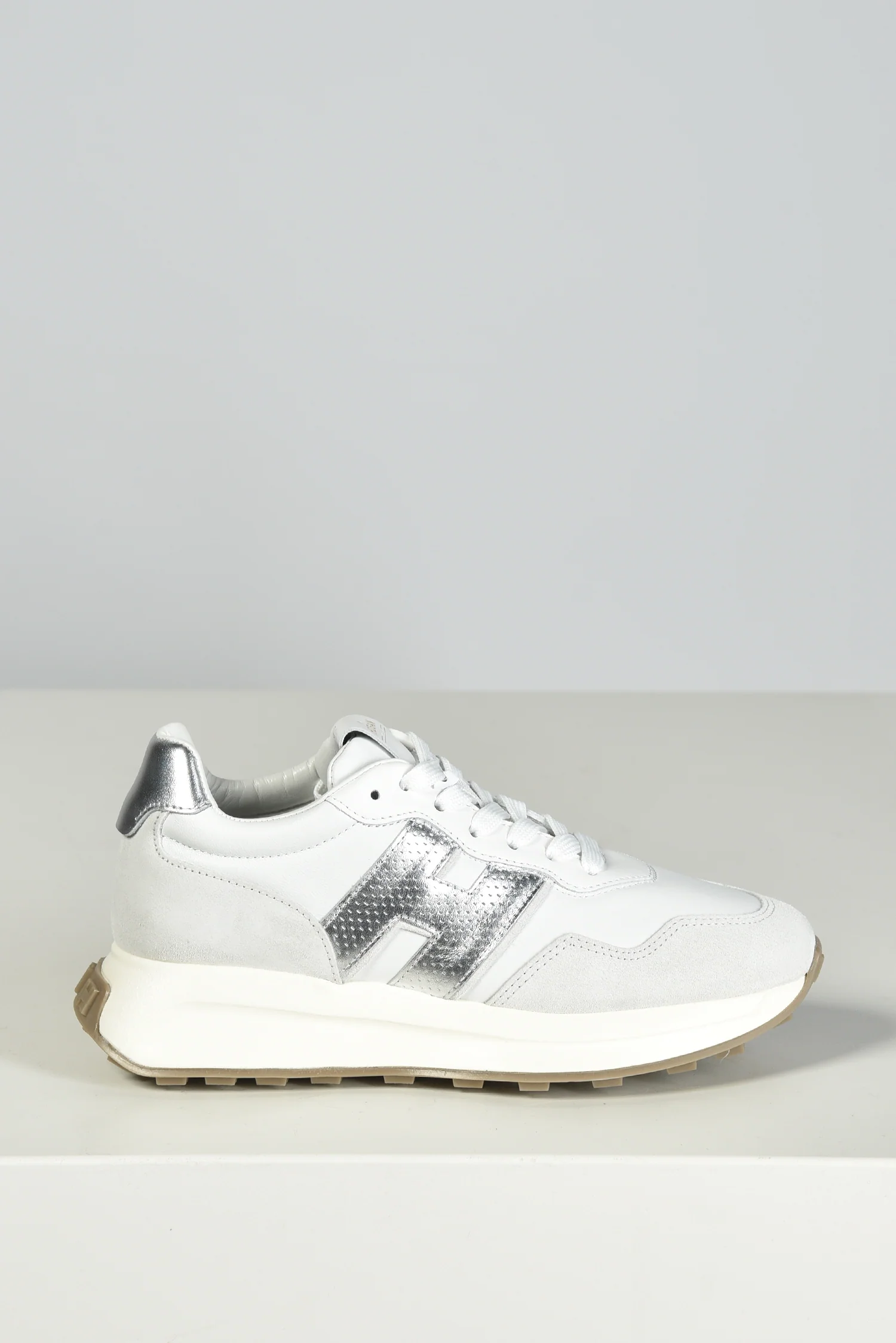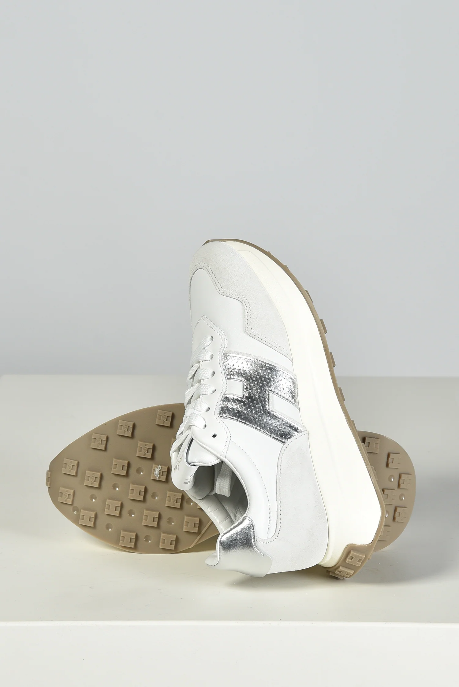 De Hogan sneakers H641 in wit trekken direct de aandacht met de metallic zilveren H aan de zijkant. Het leer en suĆØde bovenwerk geeft de sneaker een stevige, rijke structuur. Op de hiel zorgt een glanzend zilverkleurig accent voor een extra opvallend detail. De dikke crĆØmekleurige zool met grof profiel maakt het ontwerp sportief en herkenbaar als een Hogan model. Ze vallen een halve maat groter, dus dat is goed om mee te nemen bij het passen. Je krijgt er extra veters bij, ideaal om te wisselen wanneer je dat wilt. Deze sneakers laten goed zien waarom Hogan zo geliefd is: hoge kwaliteit, Italiaans vakmanschap en een moderne uitstraling die past bij veel outfits.
