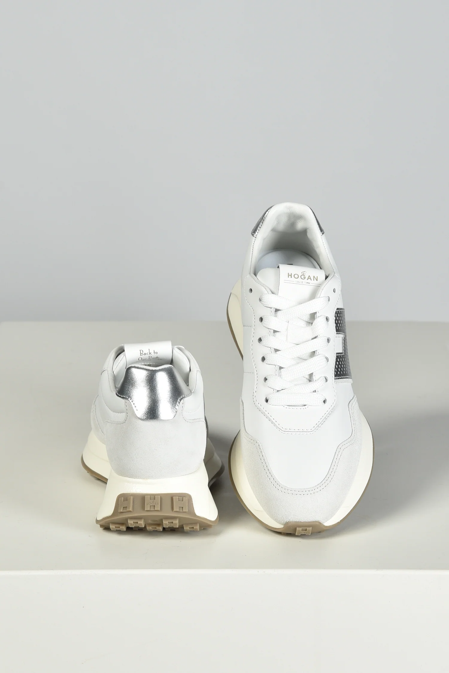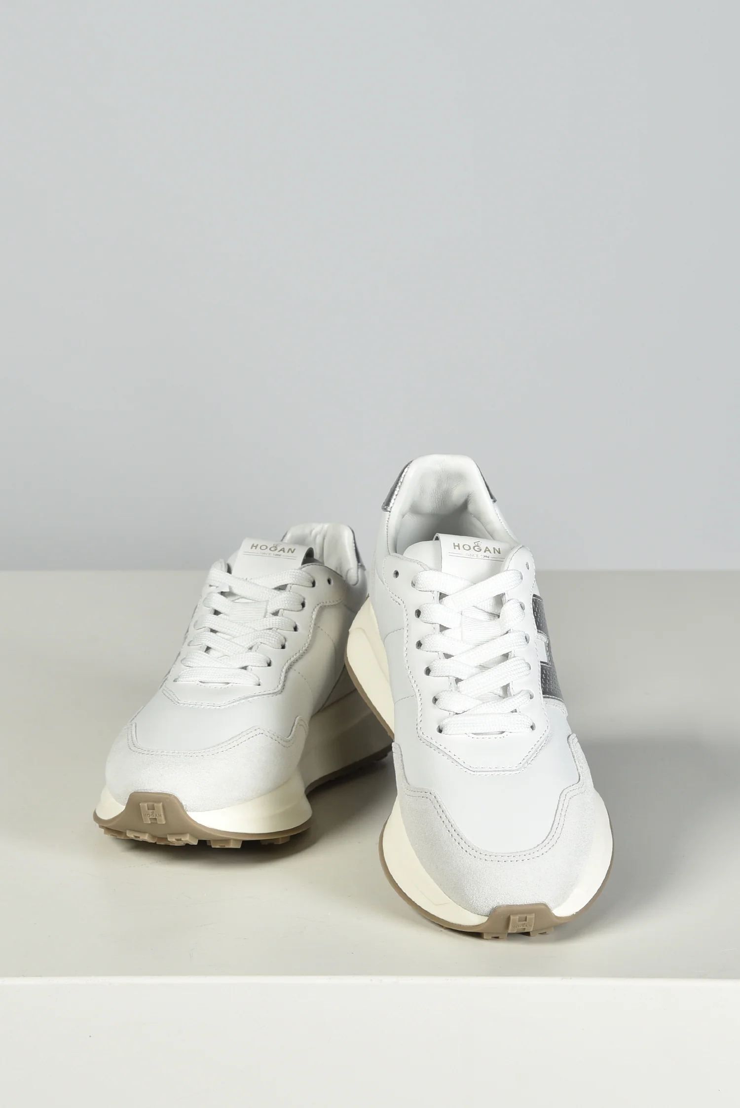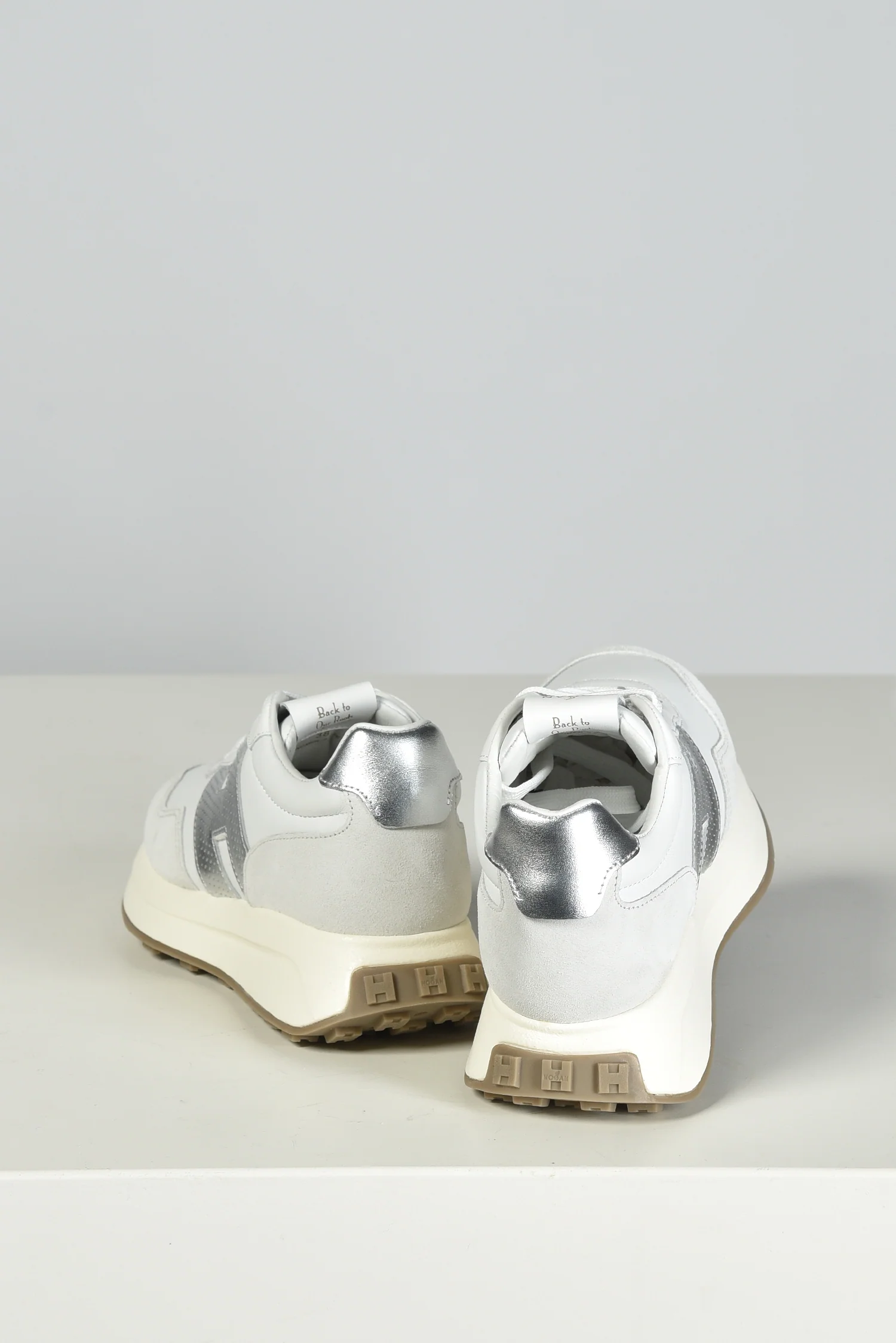 De Hogan sneakers H641 in wit trekken direct de aandacht met de metallic zilveren H aan de zijkant. Het leer en suĆØde bovenwerk geeft de sneaker een stevige, rijke structuur. Op de hiel zorgt een glanzend zilverkleurig accent voor een extra opvallend detail. De dikke crĆØmekleurige zool met grof profiel maakt het ontwerp sportief en herkenbaar als een Hogan model. Ze vallen een halve maat groter, dus dat is goed om mee te nemen bij het passen. Je krijgt er extra veters bij, ideaal om te wisselen wanneer je dat wilt. Deze sneakers laten goed zien waarom Hogan zo geliefd is: hoge kwaliteit, Italiaans vakmanschap en een moderne uitstraling die past bij veel outfits.