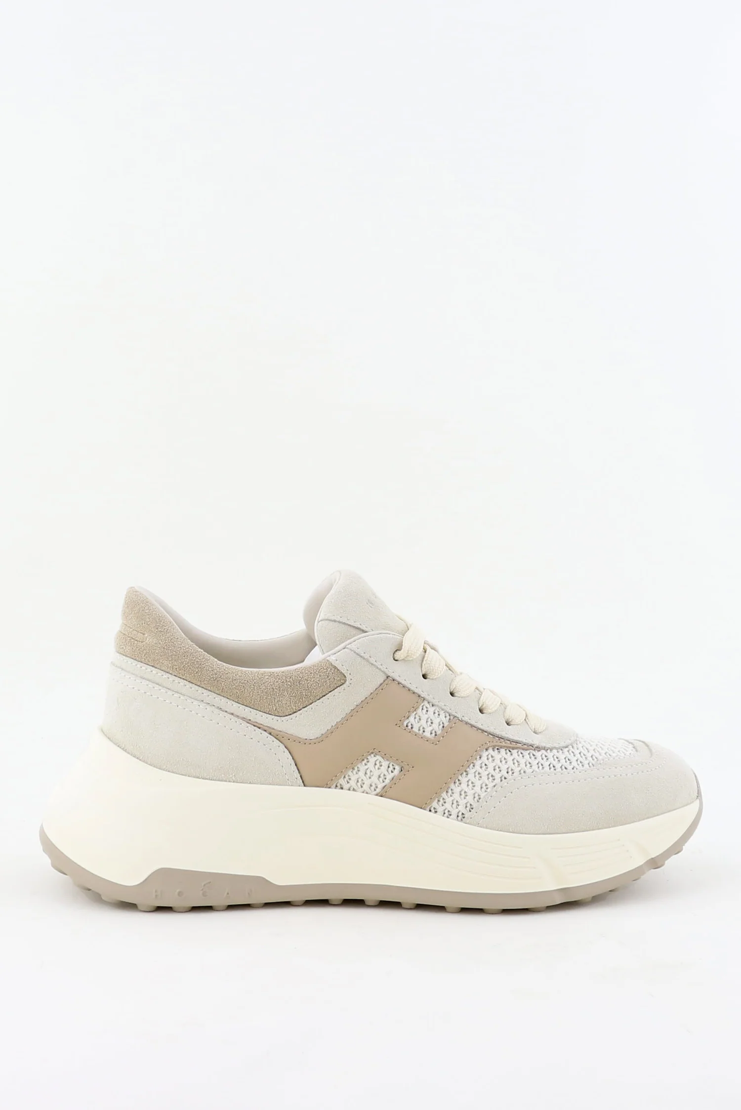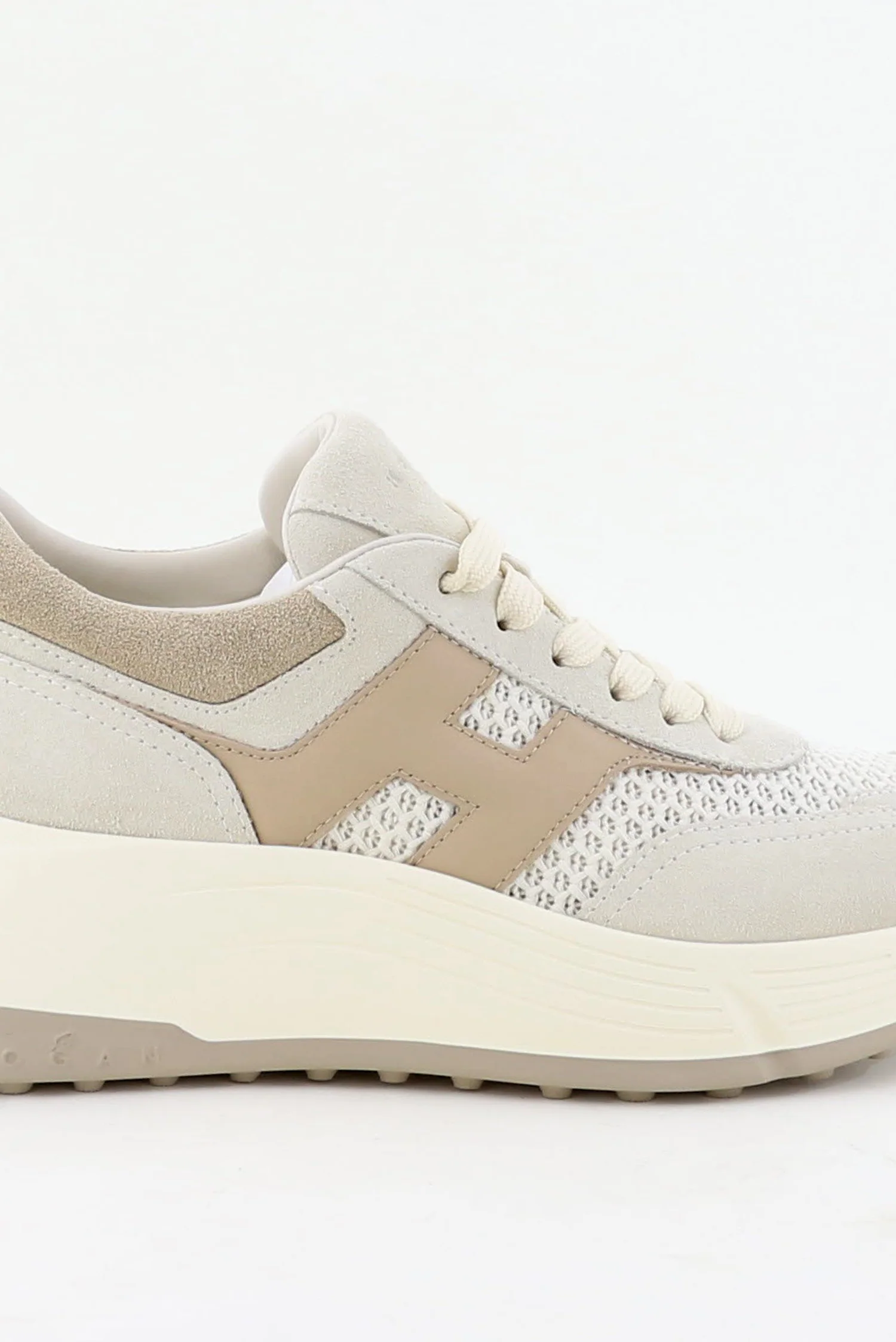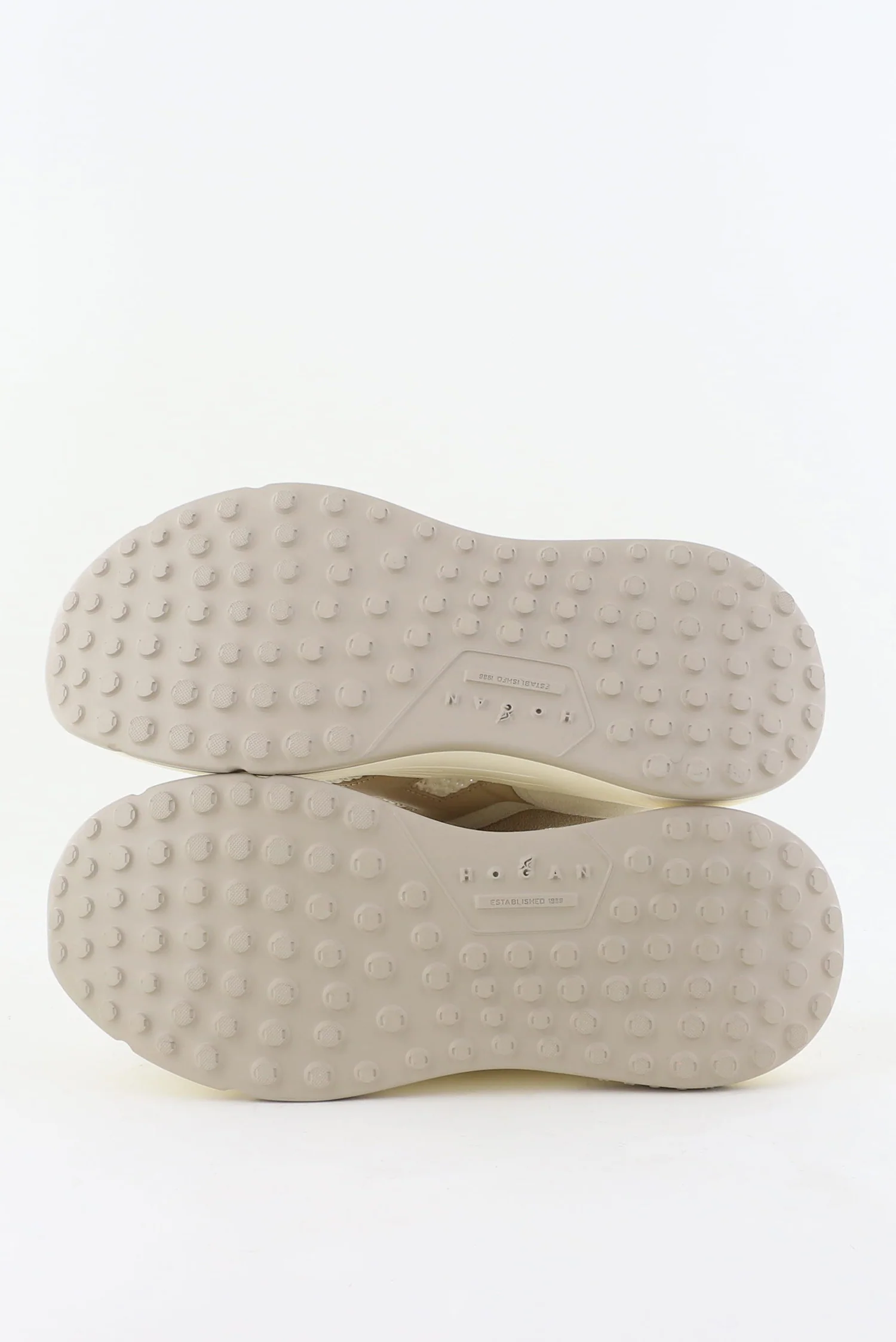 Hier zie je de sneakers H669 van Hogan in een zachte beige tint. De schoen heeft een stevige, verhoogde zool in licht creme met een golvend profiel dat meteen opvalt. Het suĆØde, leer en textiel geven samen een duidelijk contrast, vooral door het geperforeerde middenstuk. Aan de zijkant zie je de grote H applicatie in een iets donkerder beige, strak geplaatst en mooi in verhouding. De pasvorm voelt solide en ondersteunend door de brede basis van de zool. Hogan staat bekend om het zorgvuldige vakmanschap en dat merk je direct in de nette afwerking en het soepele materiaalgebruik. Deze sneakers vallen een maat groter, dus een maat kleiner werkt vaak beter.