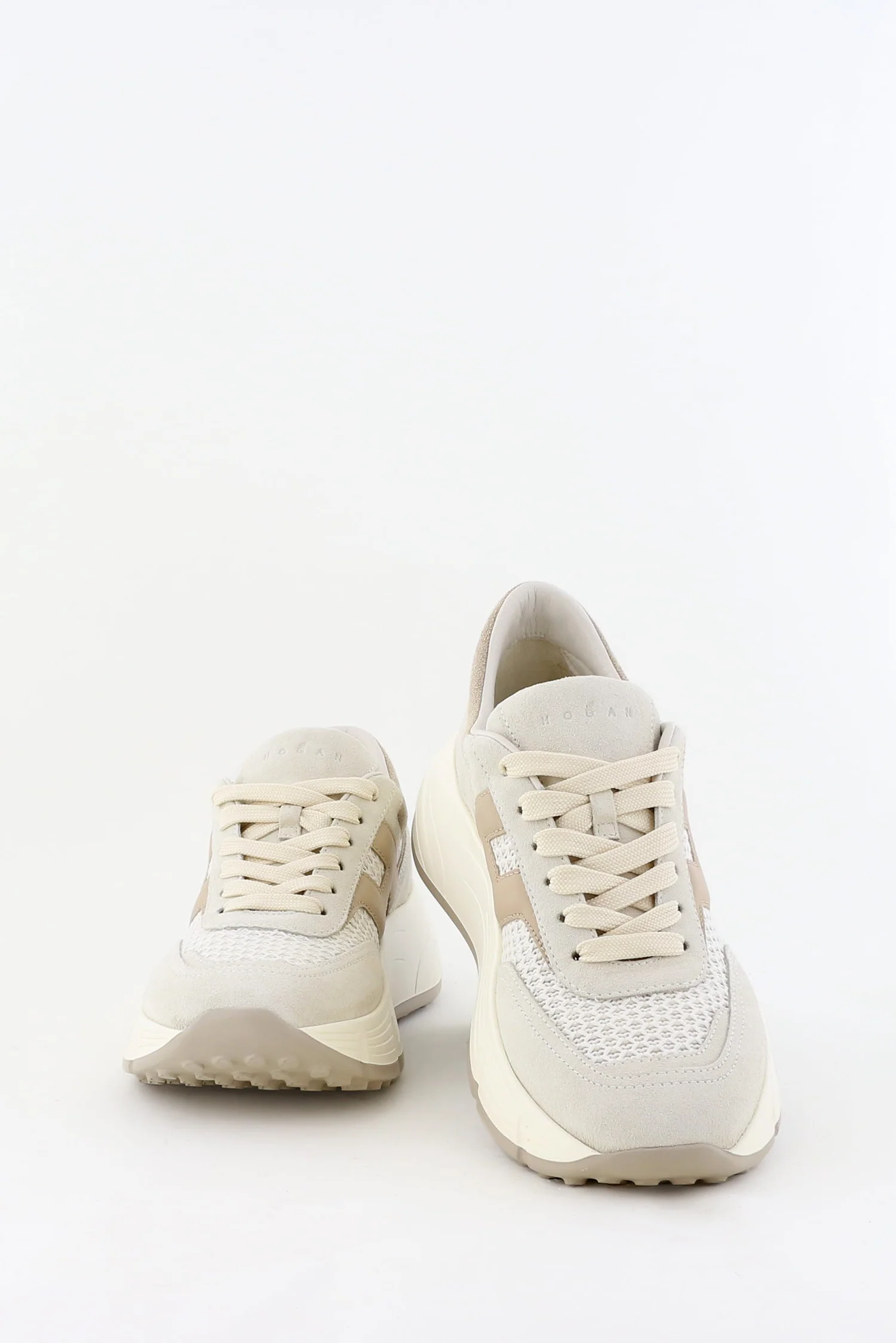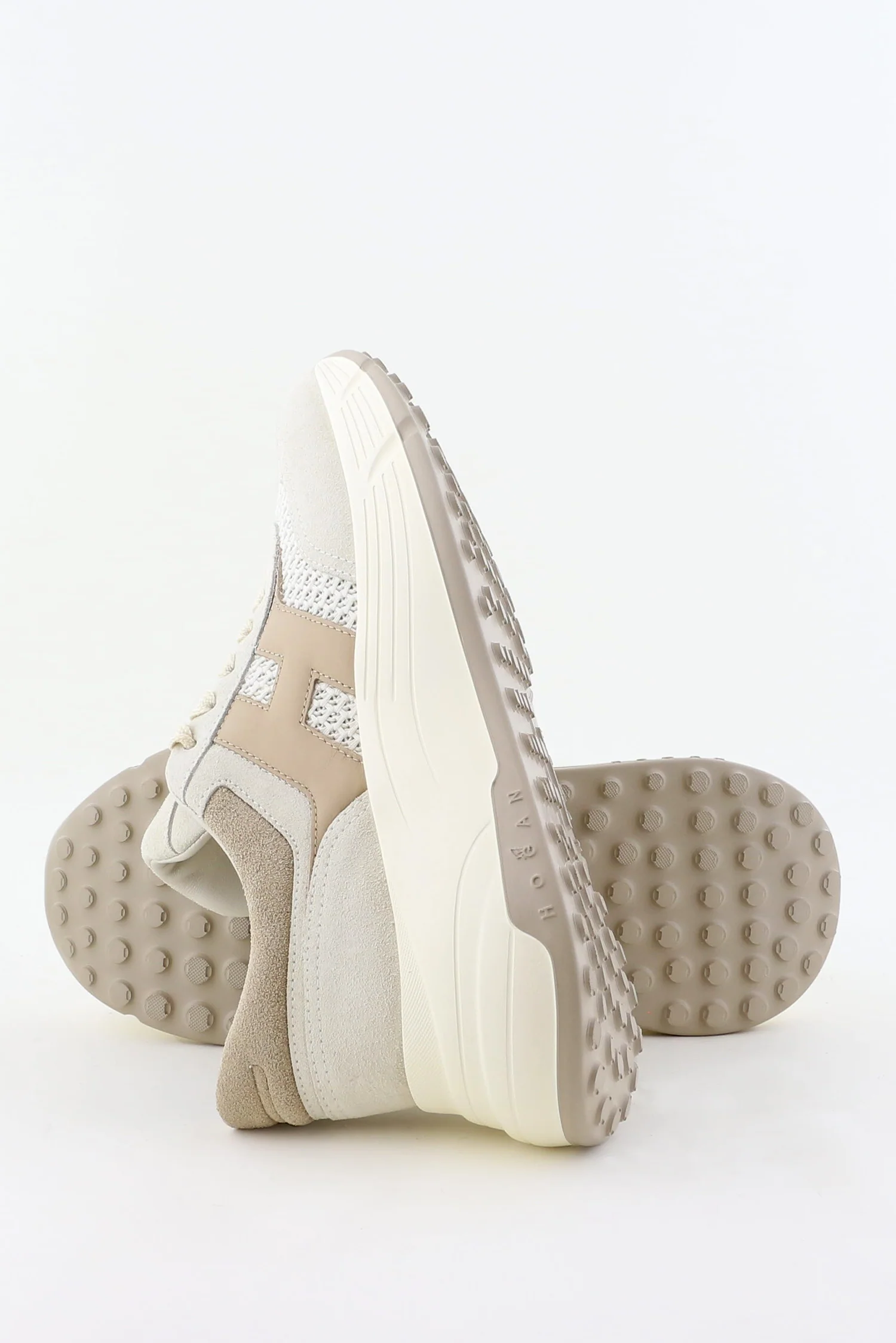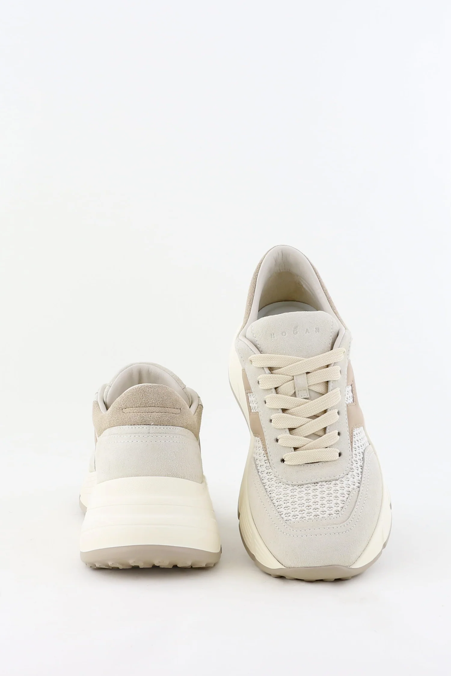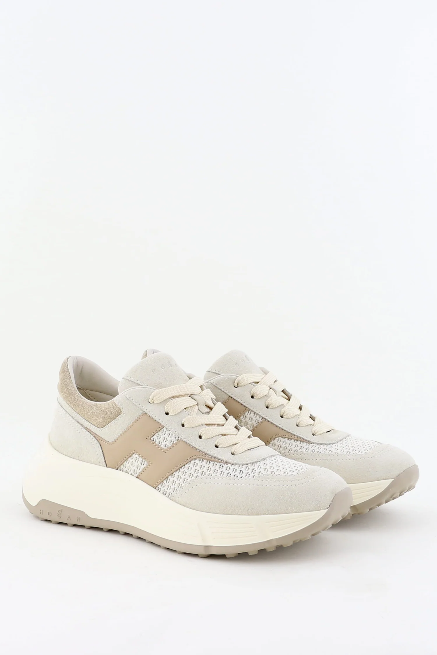 Hier zie je de sneakers H669 van Hogan in een zachte beige tint. De schoen heeft een stevige, verhoogde zool in licht creme met een golvend profiel dat meteen opvalt. Het suĆØde, leer en textiel geven samen een duidelijk contrast, vooral door het geperforeerde middenstuk. Aan de zijkant zie je de grote H applicatie in een iets donkerder beige, strak geplaatst en mooi in verhouding. De pasvorm voelt solide en ondersteunend door de brede basis van de zool. Hogan staat bekend om het zorgvuldige vakmanschap en dat merk je direct in de nette afwerking en het soepele materiaalgebruik. Deze sneakers vallen een maat groter, dus een maat kleiner werkt vaak beter.