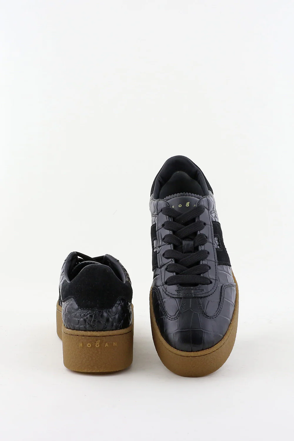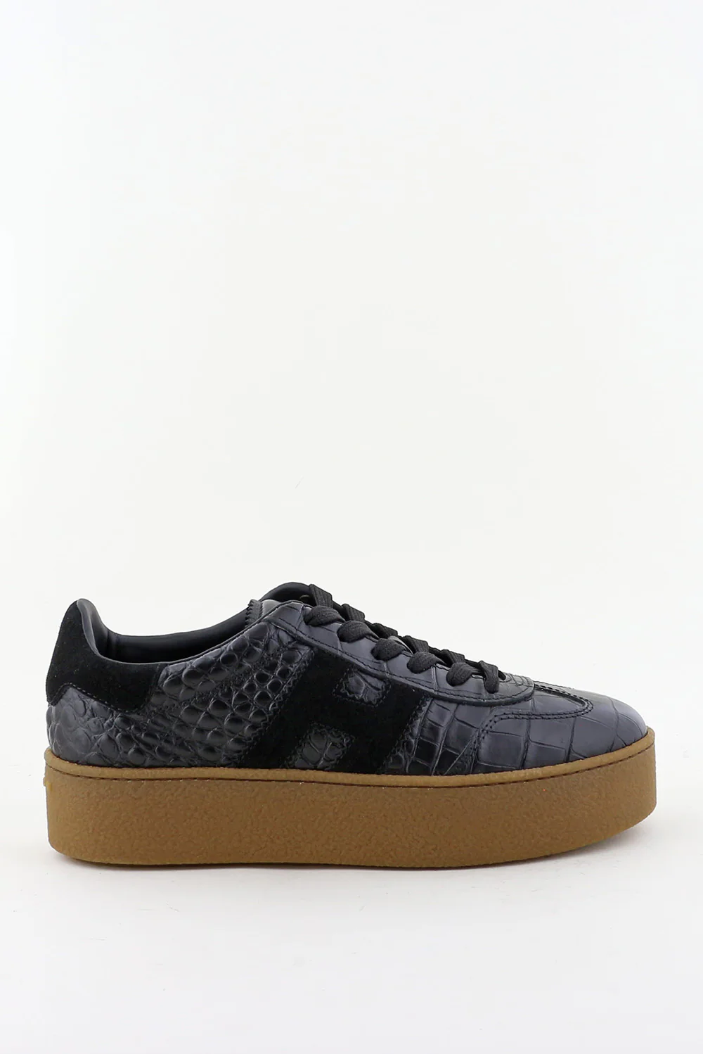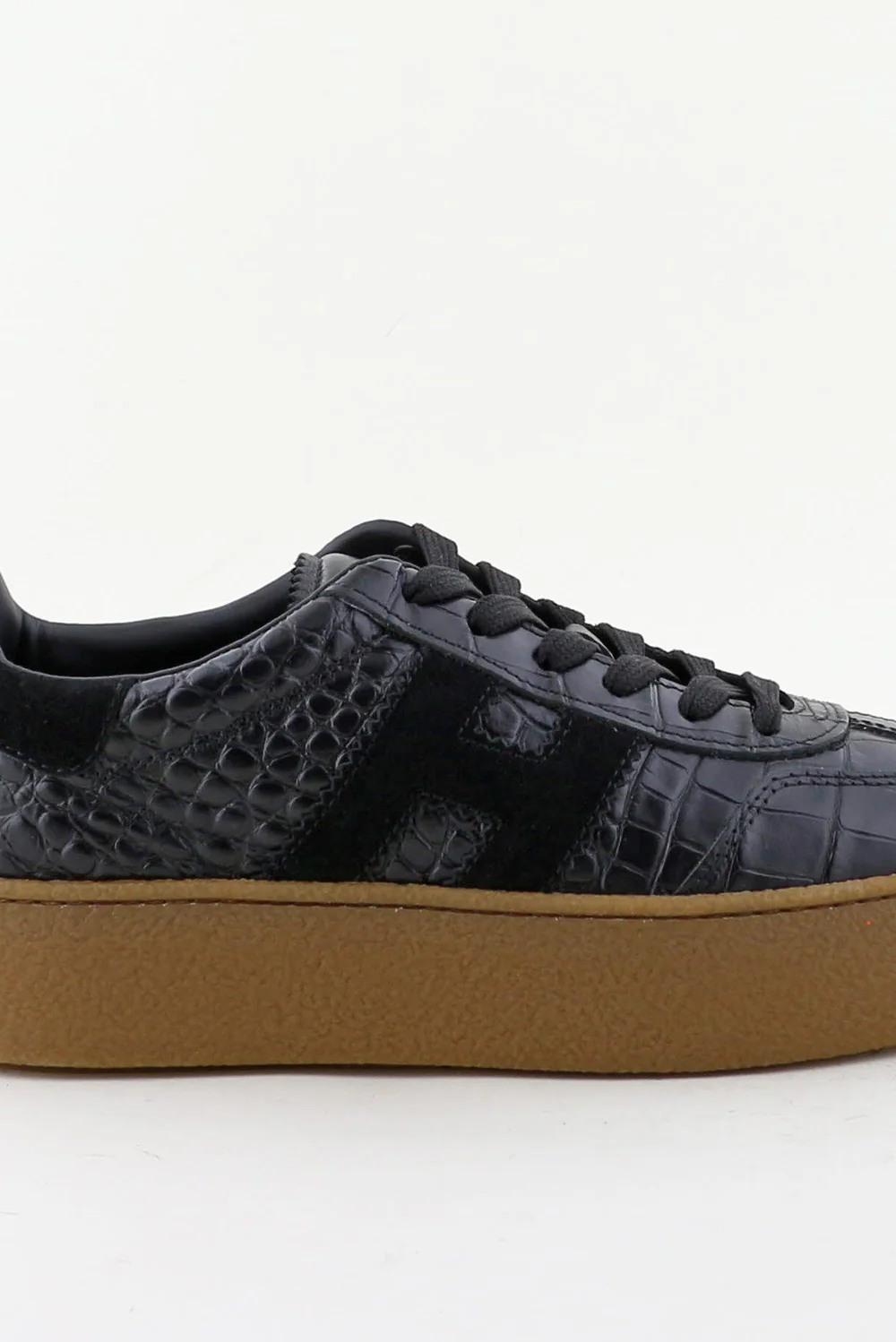 Dit zijn de sneakers H698 van Hogan, een zwarte uitvoering met een krokodillenreliƫf dat meteen de structuur laat spreken. Het bovenwerk van leer heeft een stevige vorm en voelt glad maar duidelijk getekend door het reliƫf. De zwarte H aan de zijkant sluit strak aan bij het ontwerp. De lichtbruine plateauzool geeft hoogte en voelt stabiel door de brede basis. Hogan staat bekend om Italiaans vakmanschap, en dat merk je aan de nette afwerking en de soepele stap. Deze sneakers vallen een maat groter; een maat kleiner werkt vaak beter.