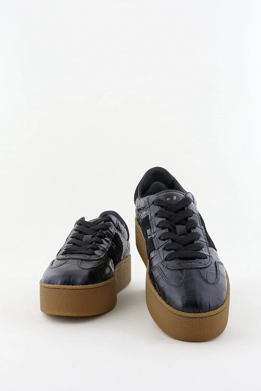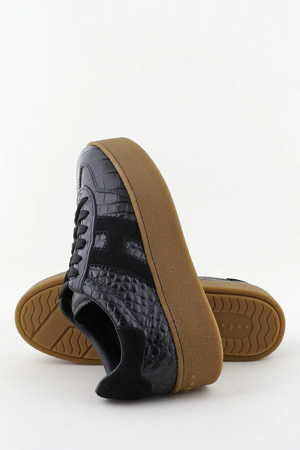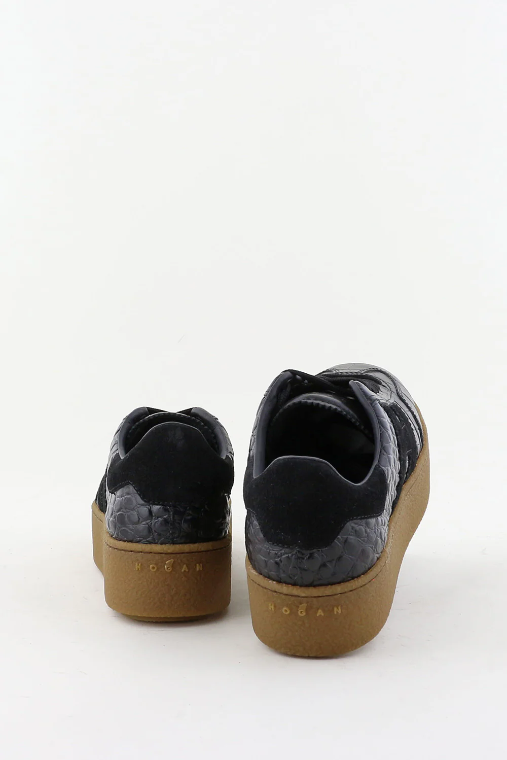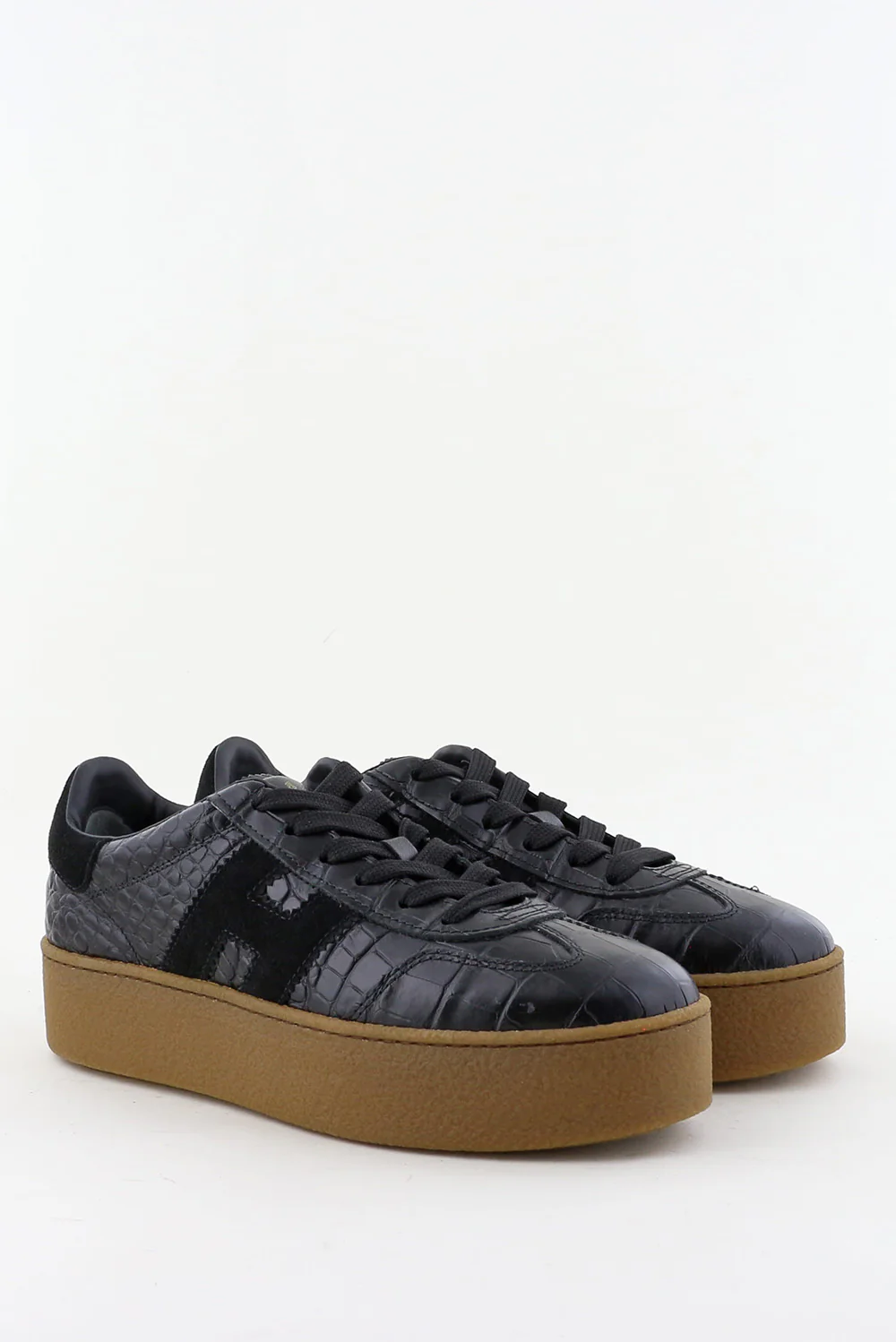 Dit zijn de sneakers H698 van Hogan, een zwarte uitvoering met een krokodillenreliƫf dat meteen de structuur laat spreken. Het bovenwerk van leer heeft een stevige vorm en voelt glad maar duidelijk getekend door het reliƫf. De zwarte H aan de zijkant sluit strak aan bij het ontwerp. De lichtbruine plateauzool geeft hoogte en voelt stabiel door de brede basis. Hogan staat bekend om Italiaans vakmanschap, en dat merk je aan de nette afwerking en de soepele stap. Deze sneakers vallen een maat groter; een maat kleiner werkt vaak beter.