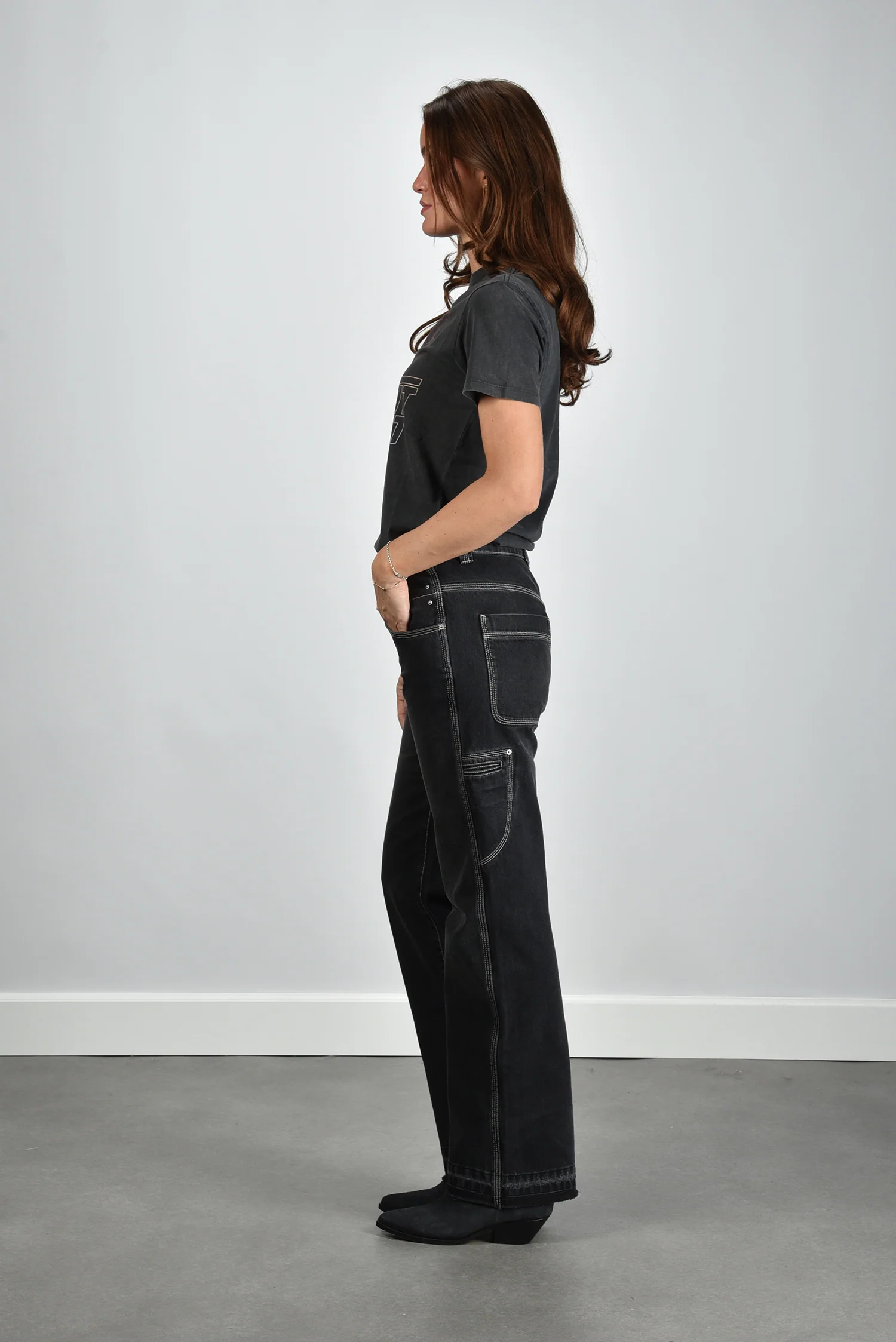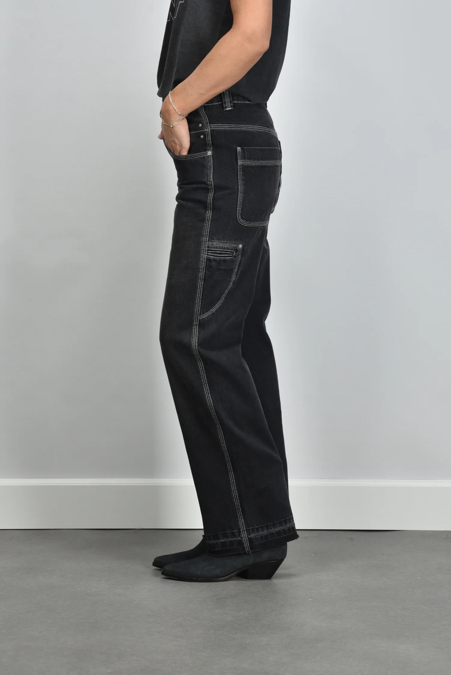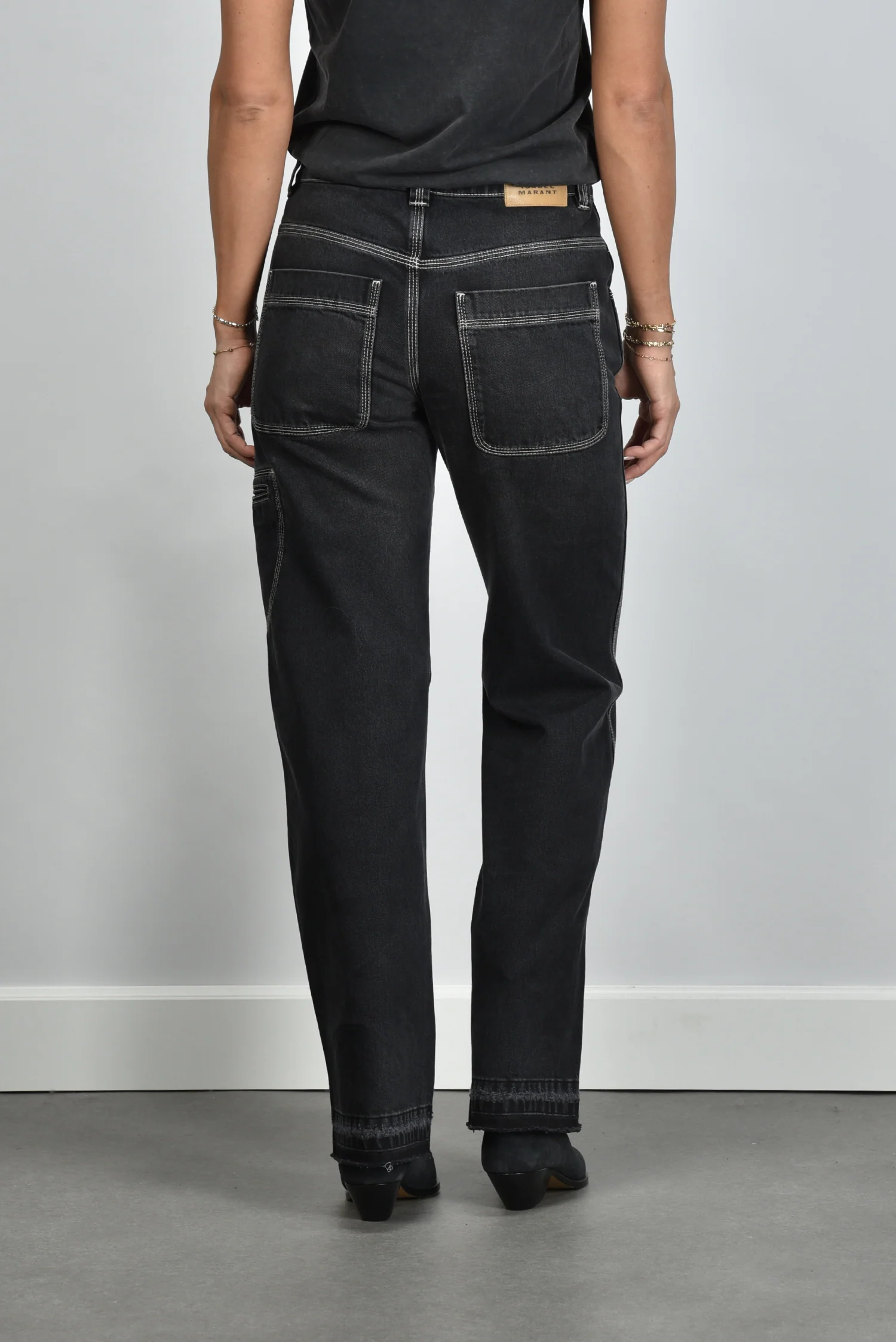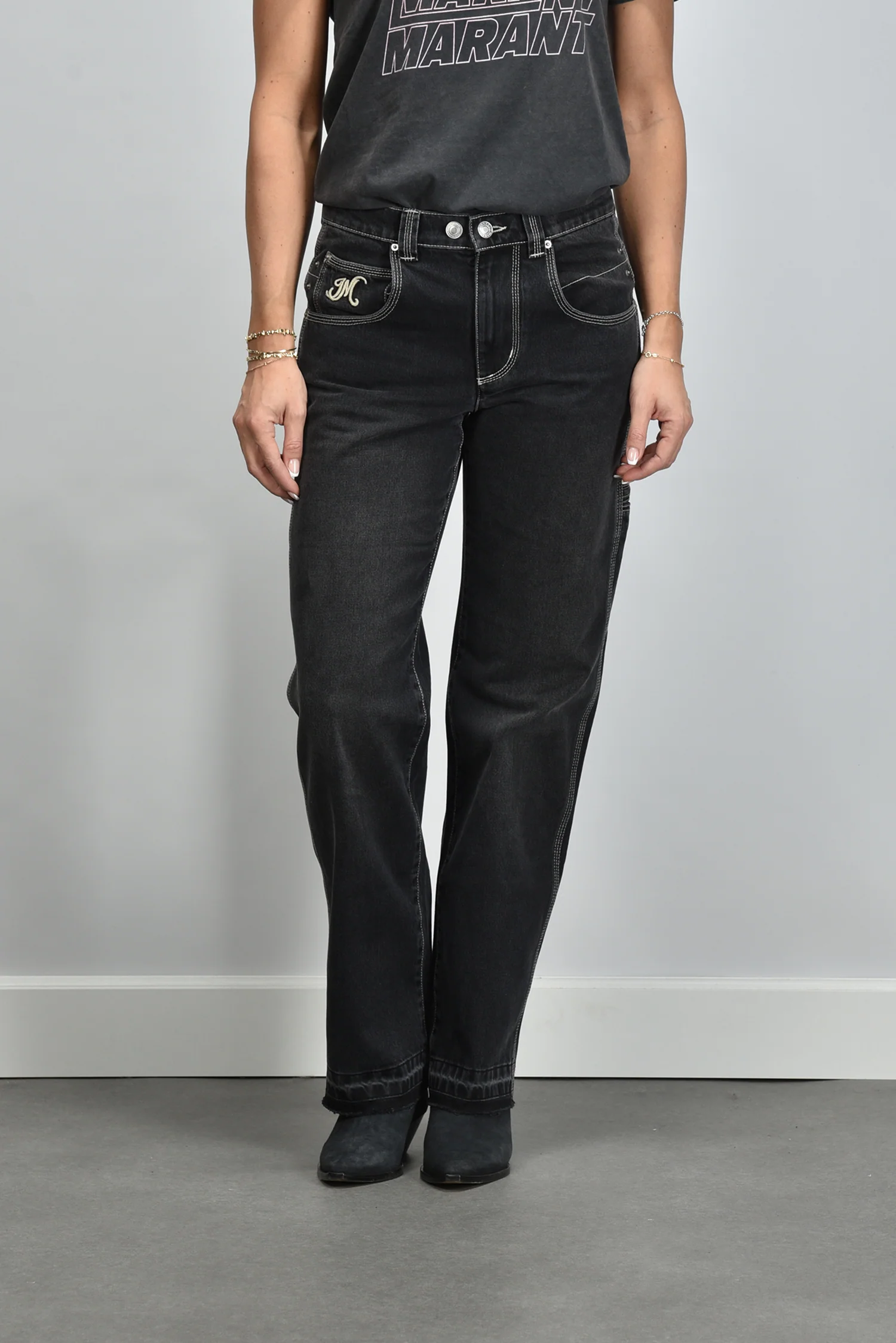 De jeans Jeyda faded black van Marant Etoile heeft een stoere rechte pijp die subtiel uitloopt. De witte stiksels langs de naden en zakken geven het donkere denim een fris contrast. Op de rechter voorzak is het logo fijn geborduurd en daardoor net zichtbaar tijdens het dragen. De jeans is gemaakt van 100% katoen, stevig en met een droge denimstructuur die het vakmanschap direct laat merken. Hij valt normaal op maat, dus je kunt je eigen maat aanhouden. Combineer hem met het Marant Etoile t-shirt Zoeline offblack voor een ontspannen ton sur ton look met een vleugje Parijse nonchalance.