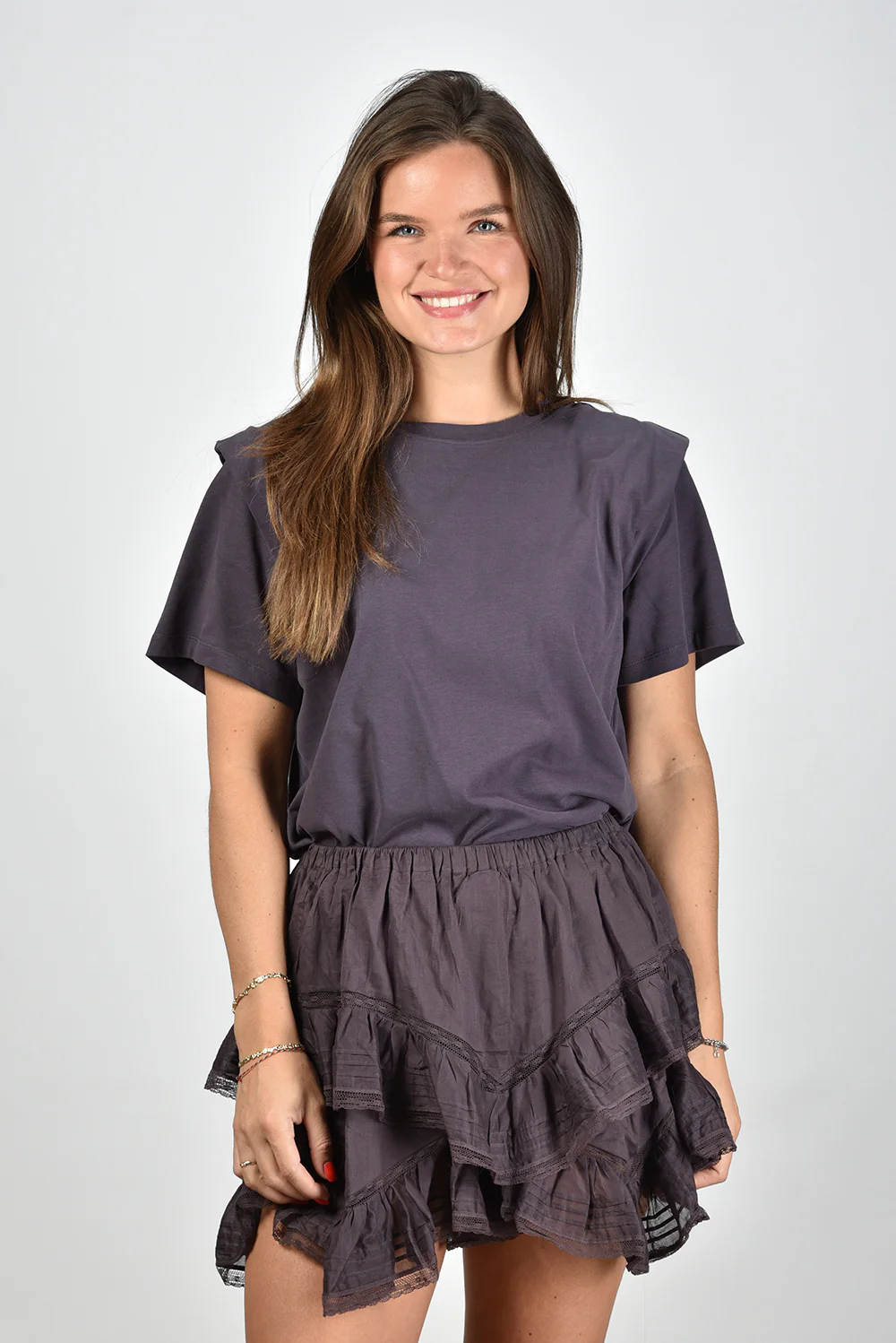 Gaaf t-shirt van het merk Isabel Marant, model Zelitos, in de kleur faded night. Het t-shirt is voorzien van schoudervullingen. Door de oversized pasvorm krijgt het t-shirt een wat stoerdere én casual uitstraling. Verder heeft het t-shirt een ronde hals en korte mouwen. Combineer met andere items van Isabel Marant. Dit t-shirt valt normaal. Model is 1,73m, heeft maat M en draagt maat M.