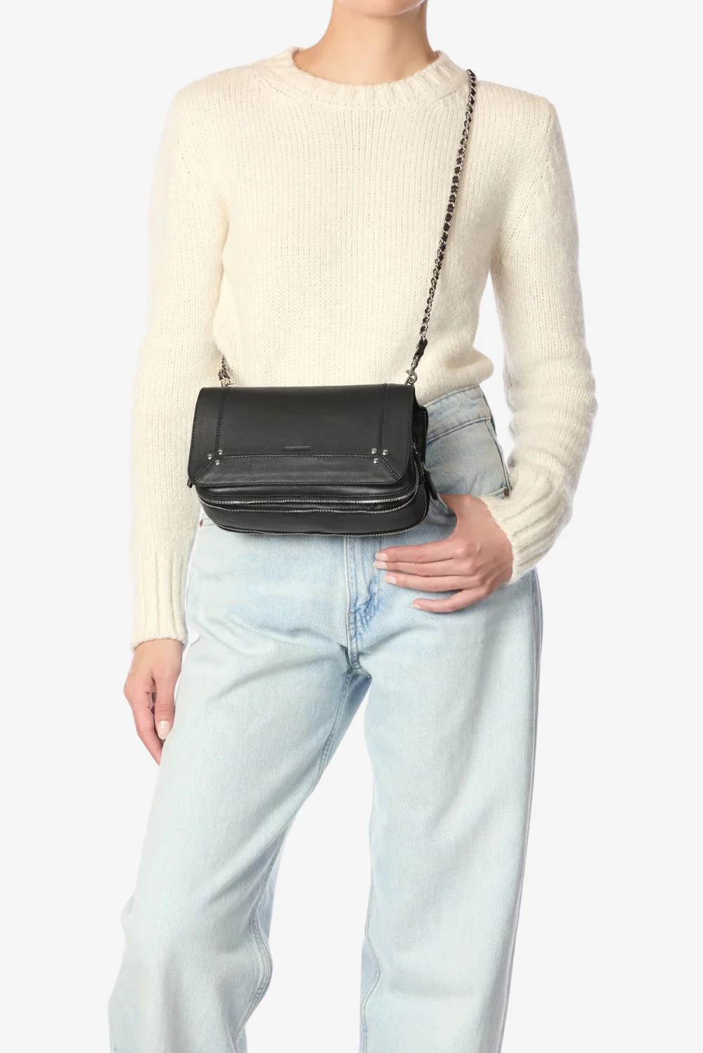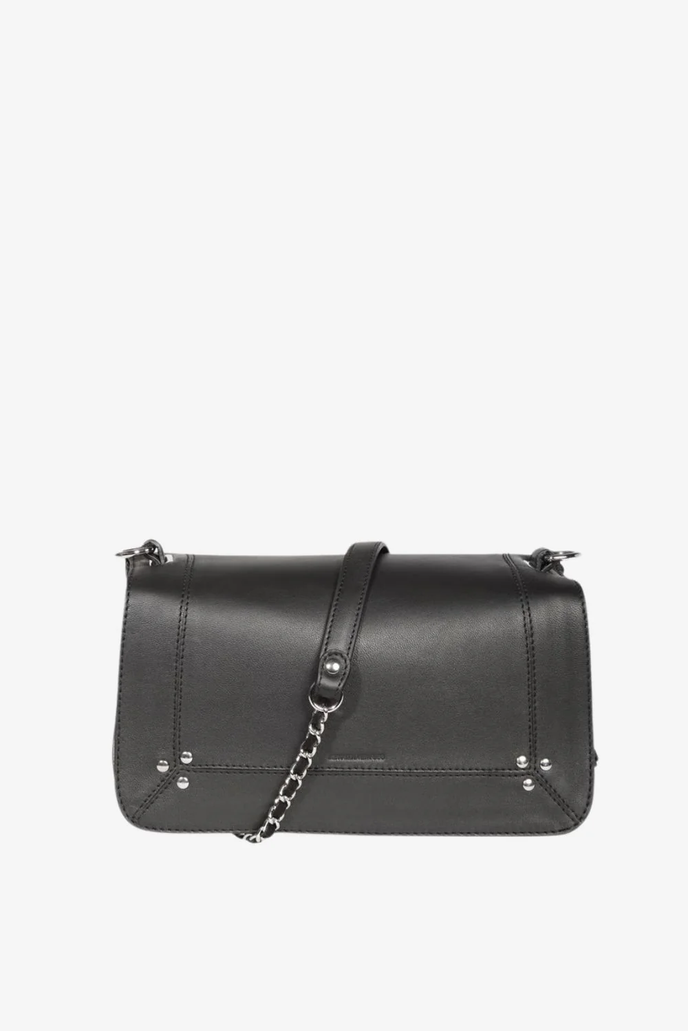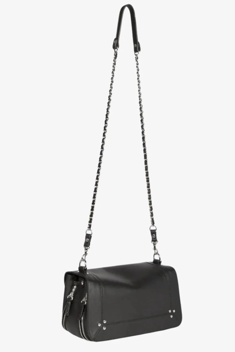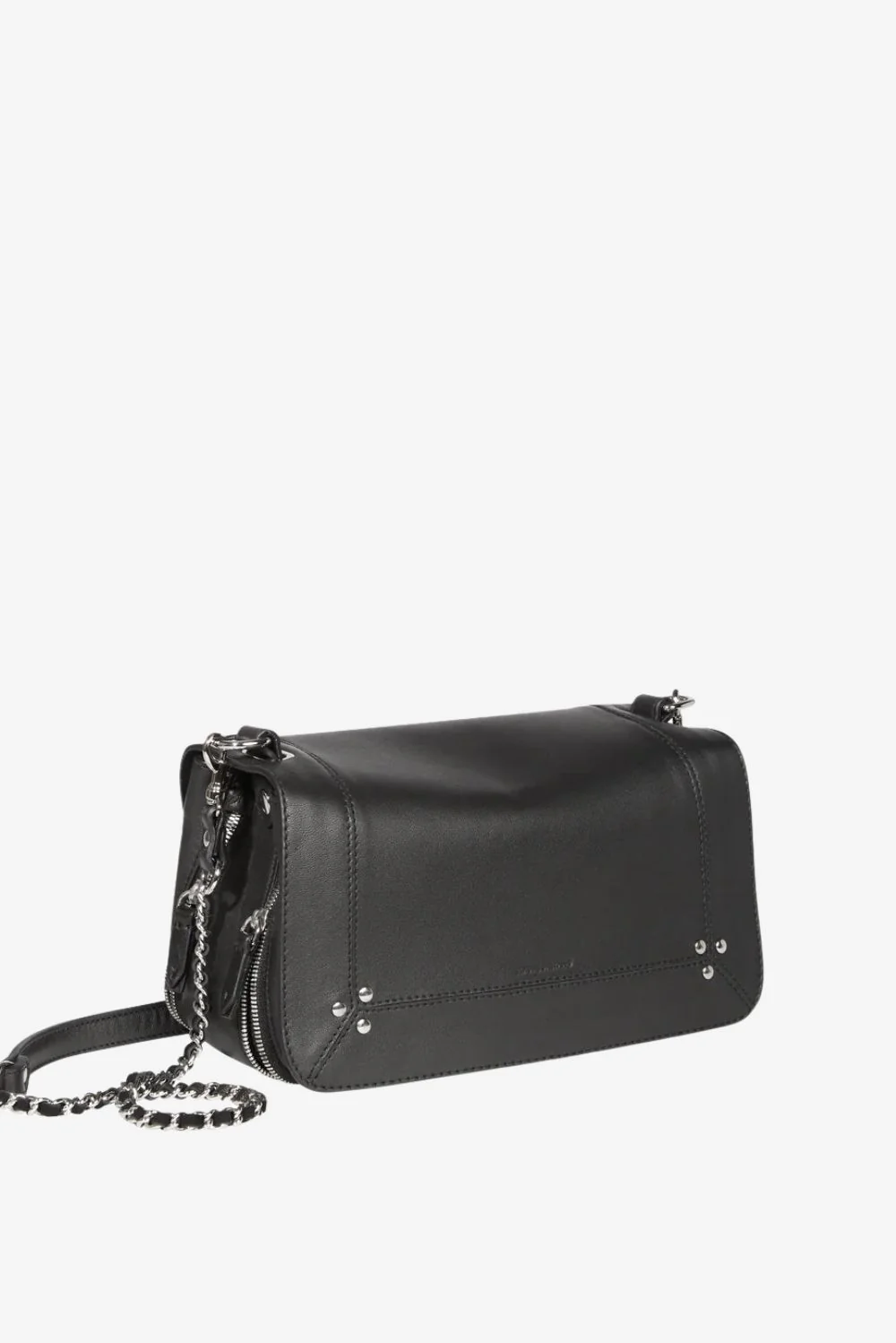 Hier zie je de crossbody Bobi lambskin zwart van Jerome Dreyfuss. De tas heeft een stevige, rechthoekige vorm met afgeronde hoeken, waardoor hij rustig in de hand ligt. Het zachte lamsleer geeft een soepele textuur, fijn voor dagelijks gebruik. De diagonale band met ketting aan de voorkant valt direct op en geeft het ontwerp een helder lijnenspel. Onderaan zitten vier kleine zilverkleurige studs die de hoeken stevig afwerken. De zilveren hardware past mooi bij de diepe noirtint en maakt het geheel strak en duidelijk. Jerome Dreyfuss staat bekend om zijn aandacht voor materiaal en vakmanschap, waardoor deze tas met de jaren alleen maar meer karakter krijgt.