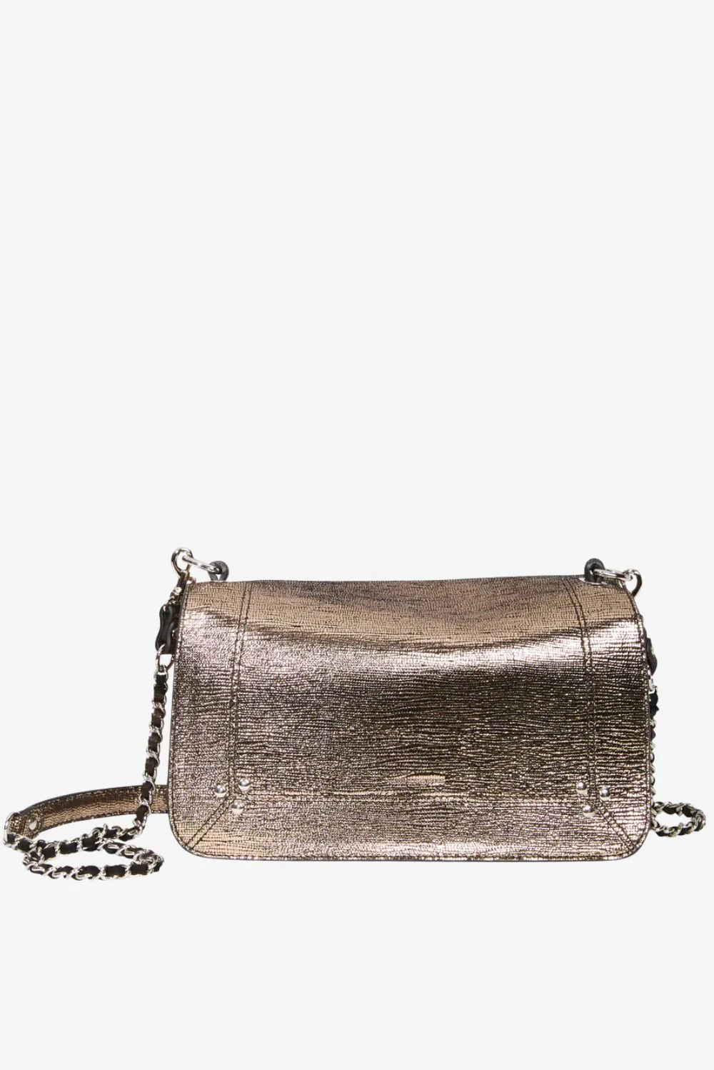 Zie hier de Jerome Dreyfuss crossbody Bobi in Lame Champagne. Deze tas combineert elegantie met functionaliteit, vervaardigd uit hoogwaardig metallic materiaal. Met afmetingen van 25 x 15 x 10 cm biedt het voldoende ruimte voor uw essentials. Artikelnummer: 45BOBICH-Lame Champagne.