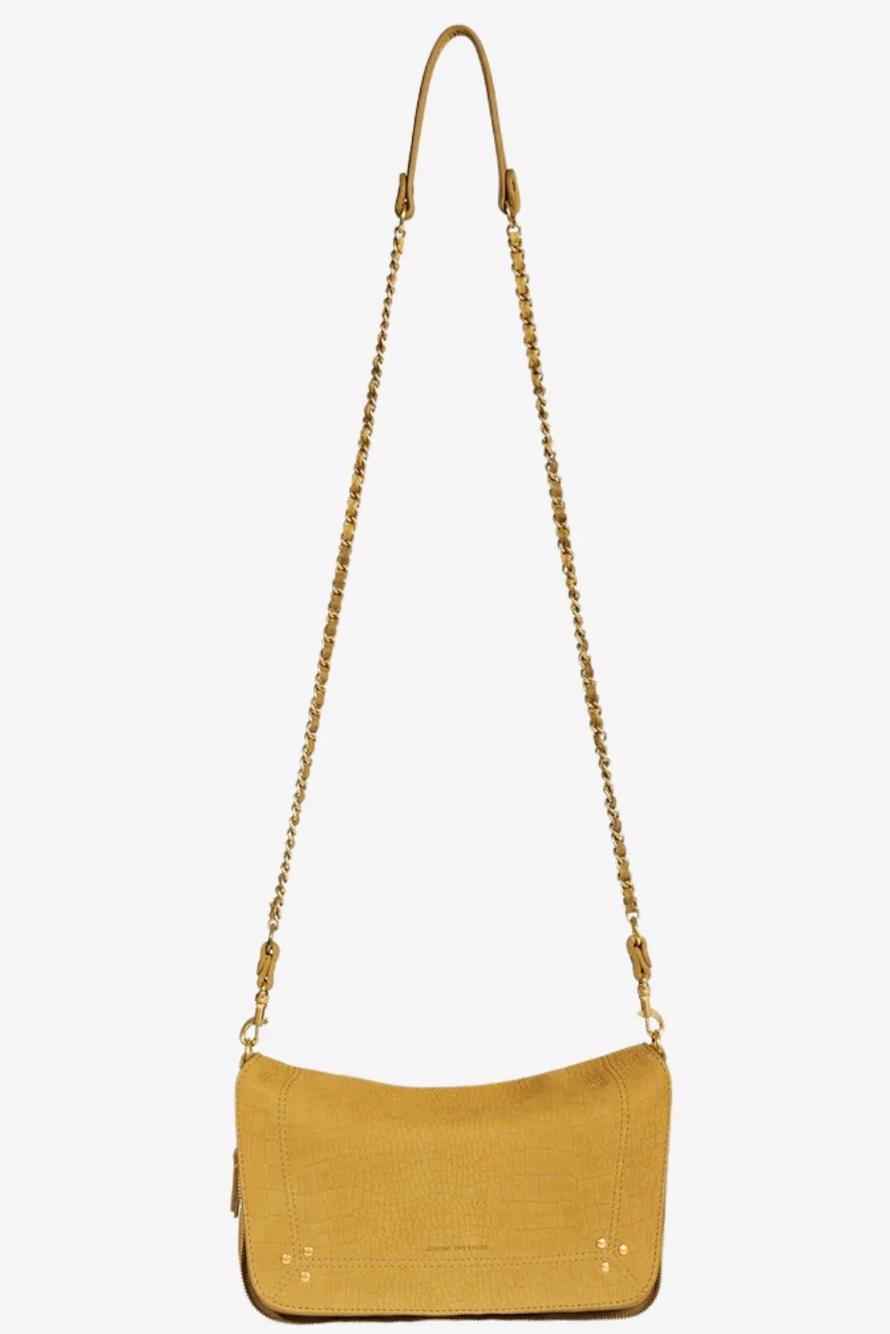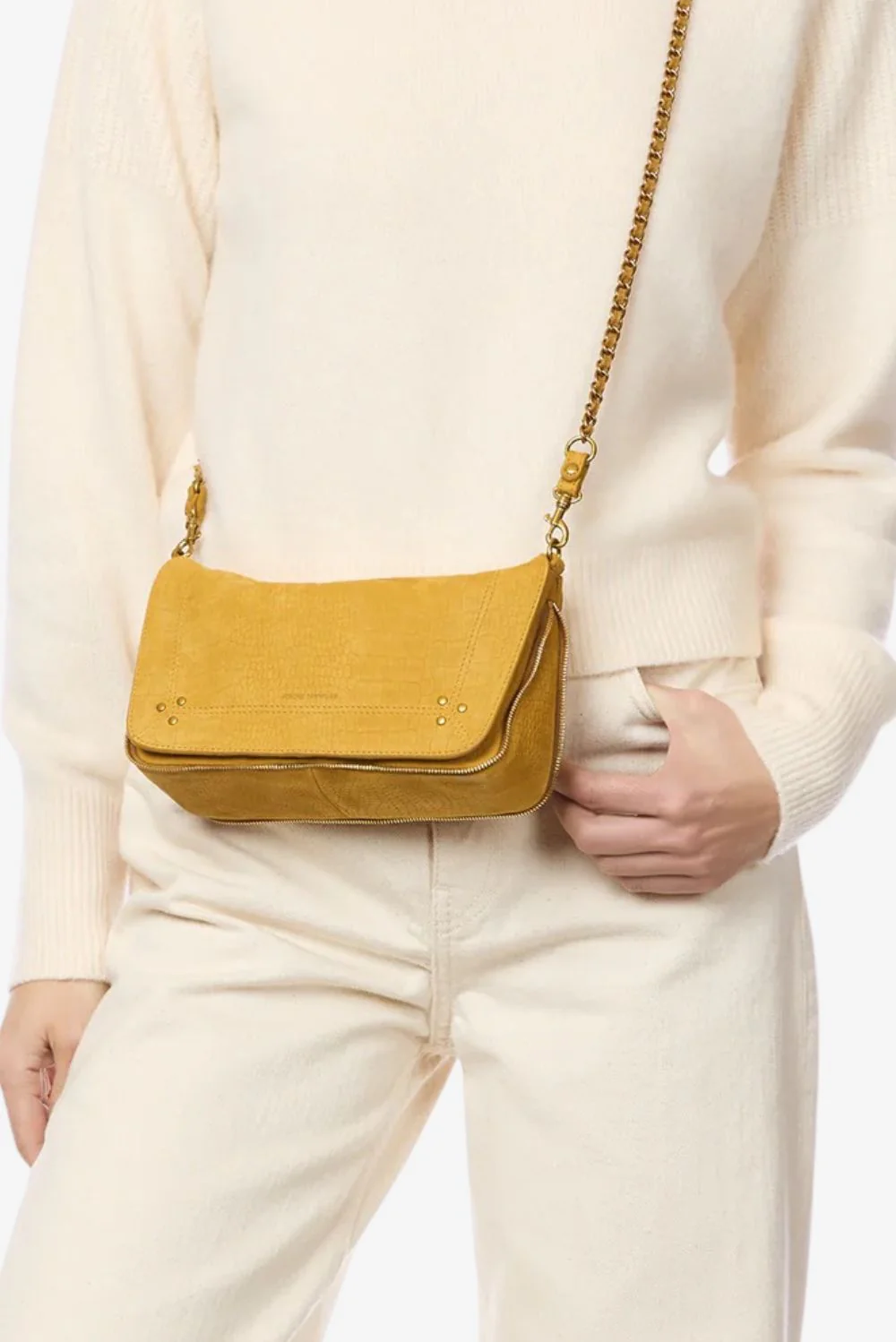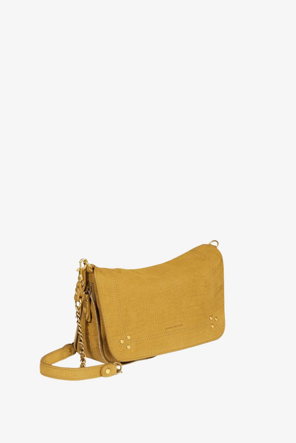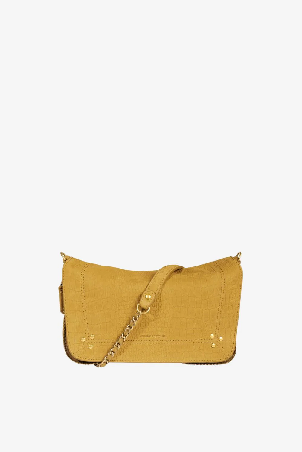 De crossbody Bobi S imprime croco moutarde van Jerome Dreyfuss is een compacte tas met karakter. De diepgele kleur met krokodillenpatroon geeft het leer een stevige, luxueuze uitstraling. De grote overslagklep is afgewerkt met kleine goudkleurige studs in de hoeken, subtiel en precies gedoseerd. De gevlochten schouderband met kettingdetails en leren accenten zorgt voor een mooi contrast met het soepele taurillonleer met geitenskin. Van binnen is de tas gevoerd met zachte katoen, wat prettig aanvoelt en duurzaam blijft. Typisch Jerome Dreyfuss: Franse allure gecombineerd met praktisch gebruik. Dit is een tas die gezien mag worden en die in gebruik alleen maar meer karakter krijgt.