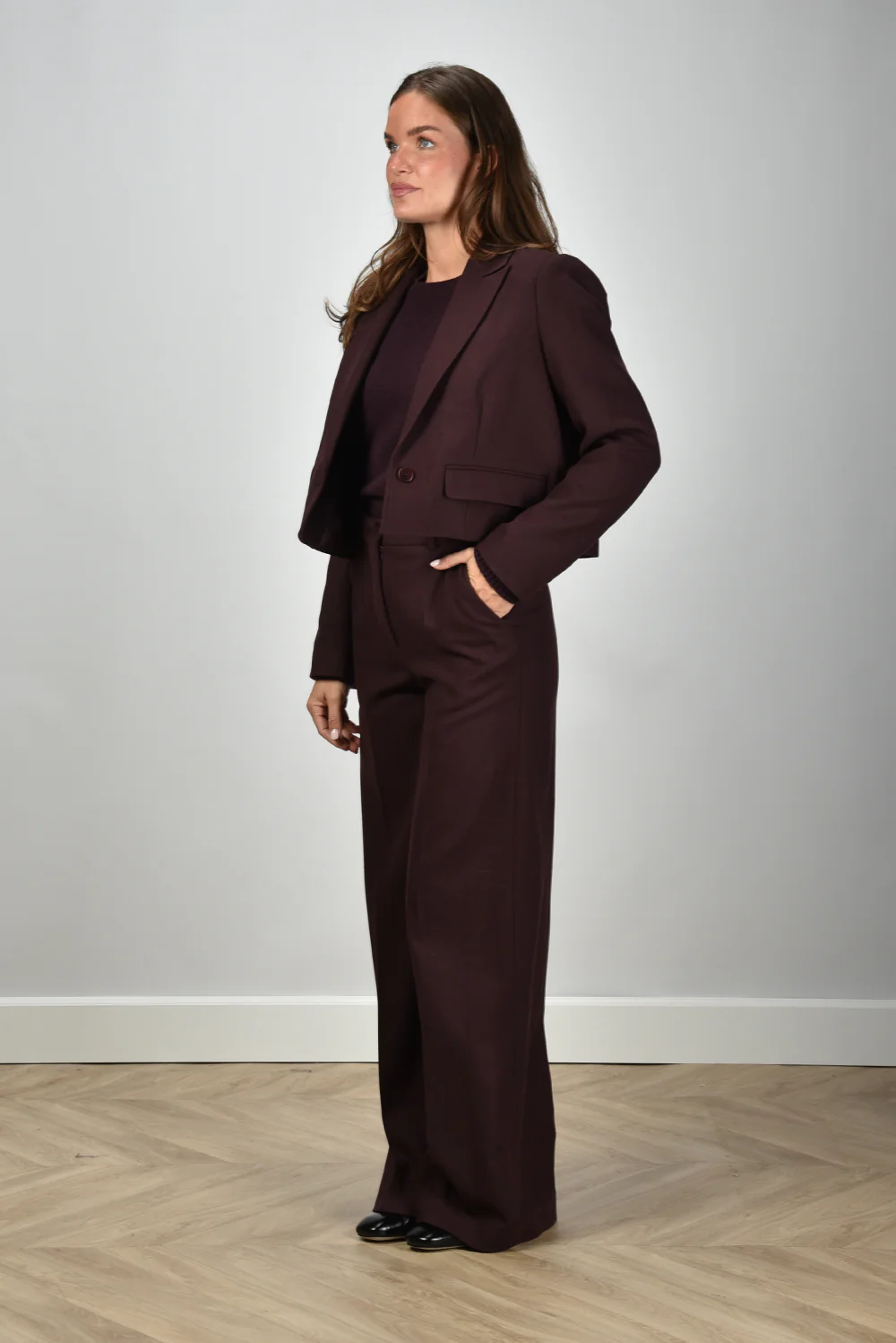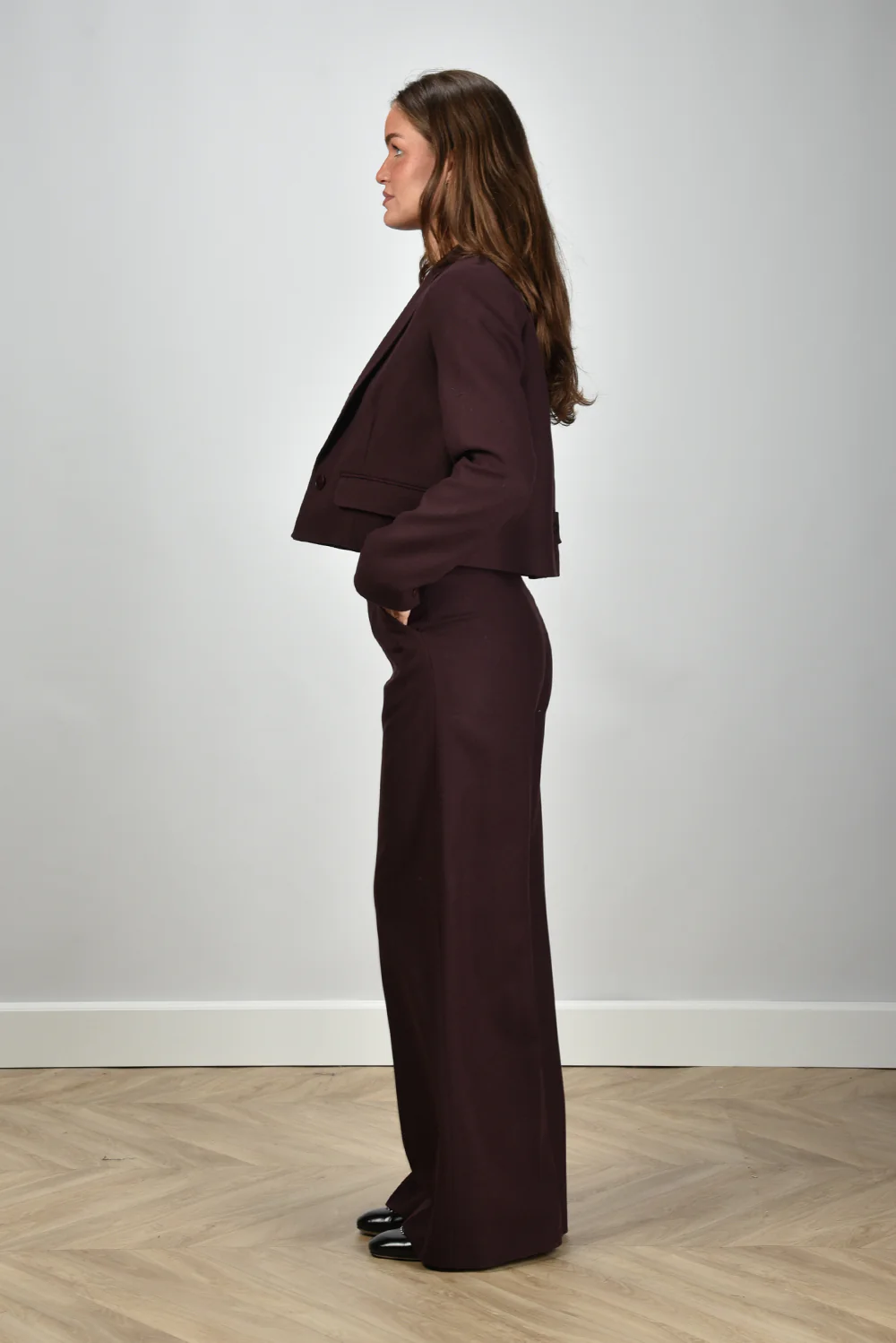 Het cropped jack Elia van Joseph heeft de scherpe snit waar het merk om bekendstaat. Het korte model eindigt net boven de taille en sluit met twee knopen aan de voorkant. De klepzakken aan weerszijden geven het ontwerp een klassieke balans. De warme maraschino tint maakt het een opvallend maar stijlvol statement. Dankzij het wolrijke materiaal voelt het jack vol en stevig aan, met voldoende elasticiteit voor een mooie pasvorm. Draag het eens met de Lisa Yang trui Mable in mahogany voor een rijke kleurencombinatie die rustig oogt maar duidelijk aanwezig is.